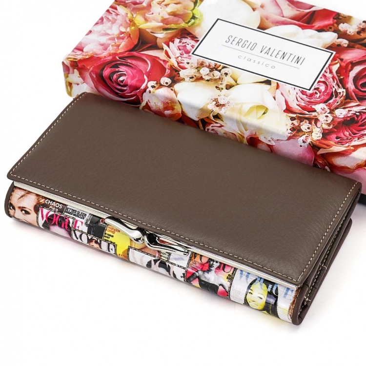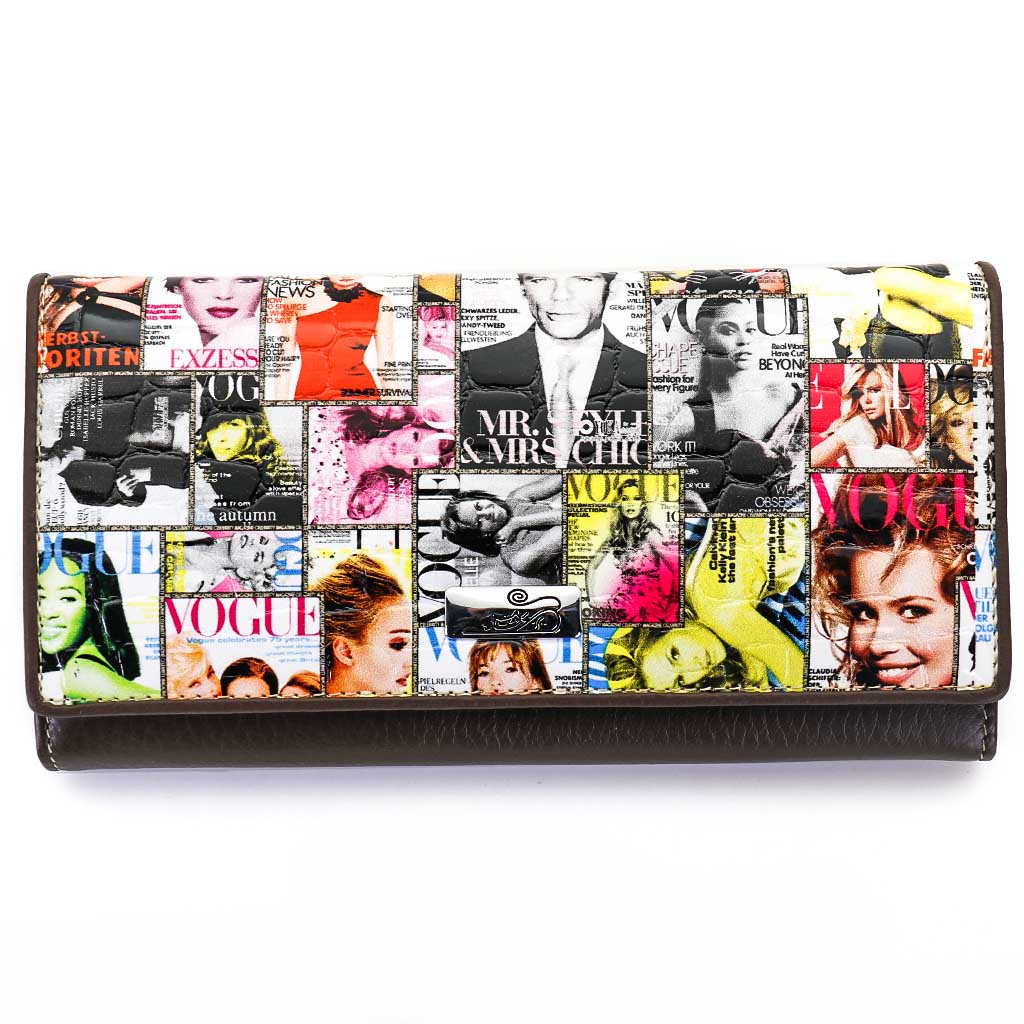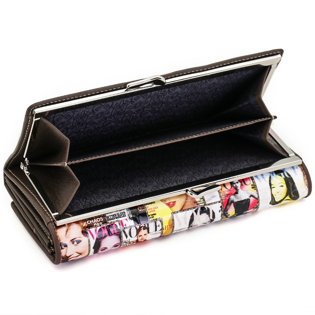 Размер 18,5 х 9.5 см. Закрывается на кнопку. Внутри: три отделения для купюр, один продольный карман на клапане, два кармана на молнии, 12 кармашков для пластиковых карт, одино прозрачное окошко для фотографии. Снаружи- отделение для монет под рамочным замком.