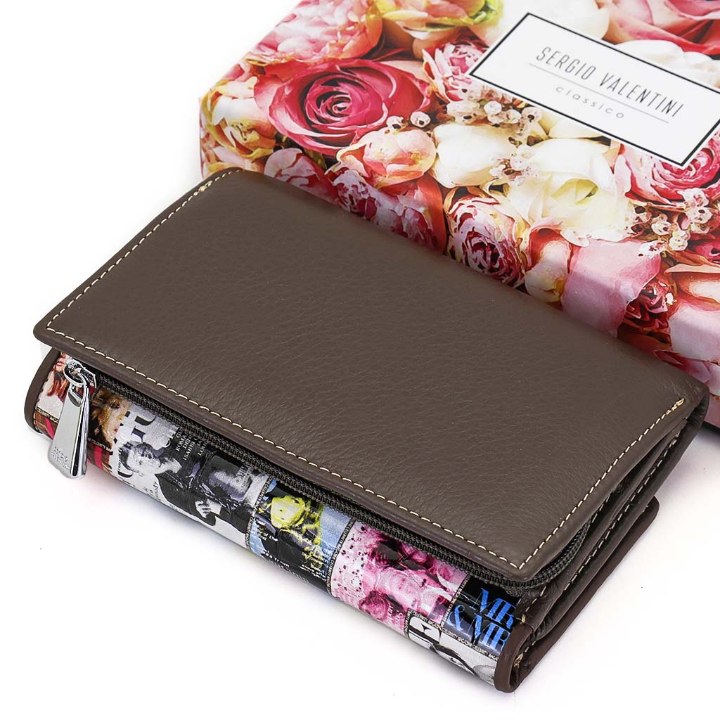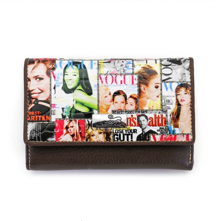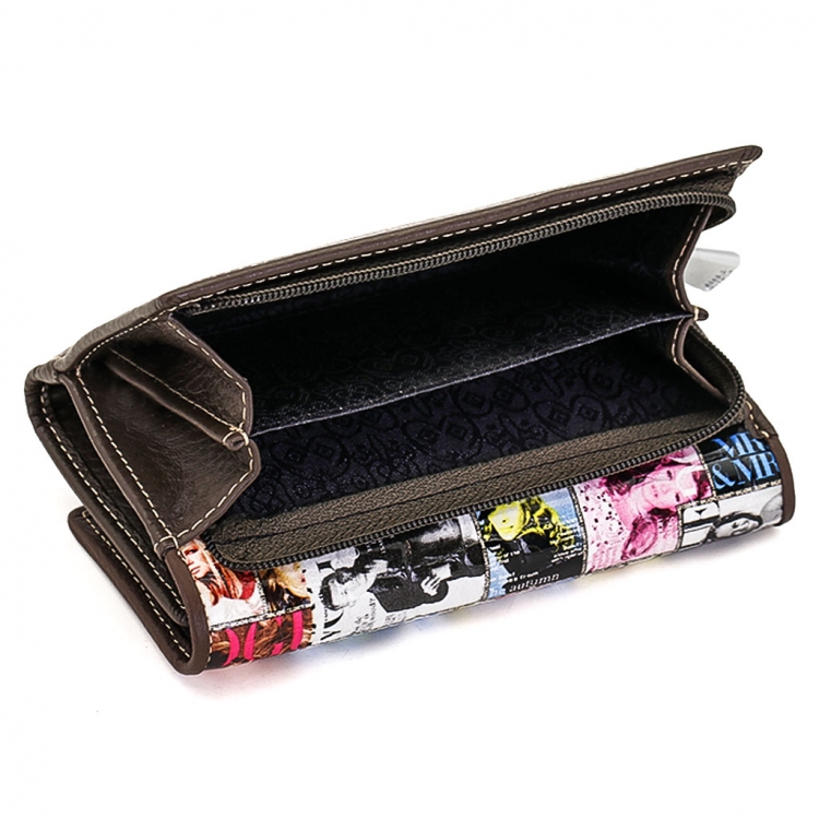Размер 12,5 х 9 см.. Закрывается на кнопку. Внутри - три отделения для купюр (одно на молнии), три кармашка для пластиковых карт, два боковых кармана, прозрачное окошко для фотографии. Снаружи - отделение для монет на молнии.
