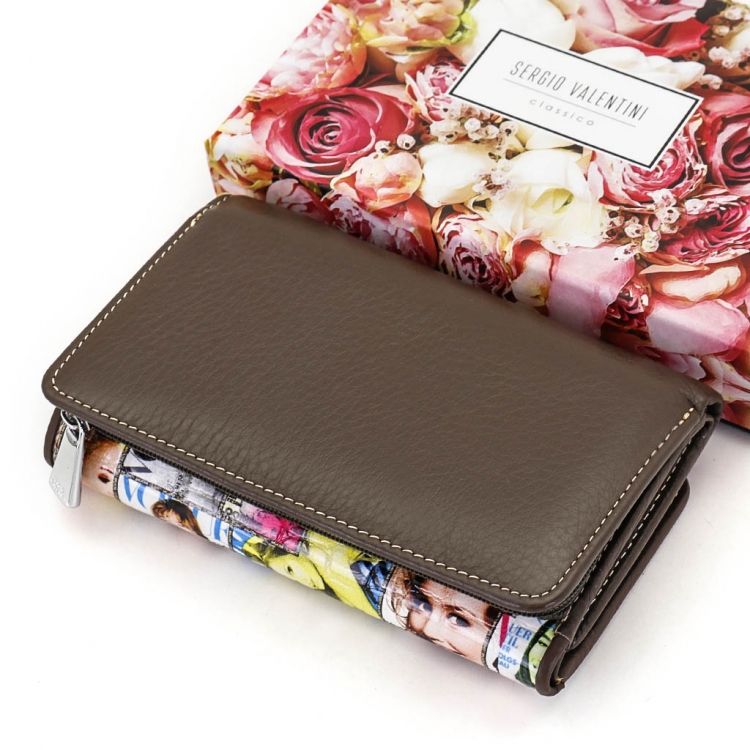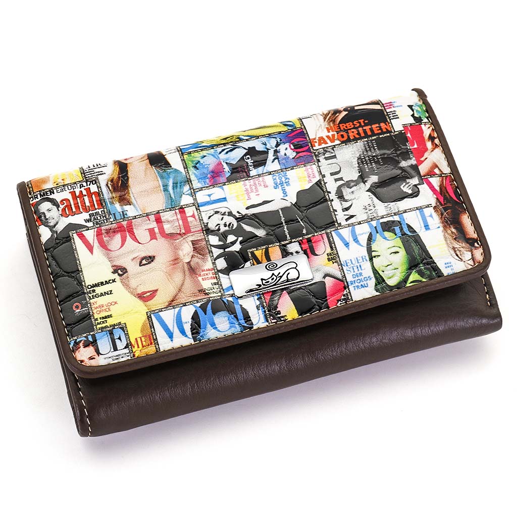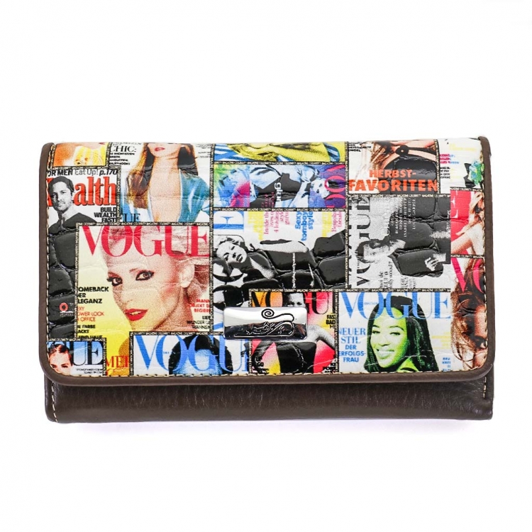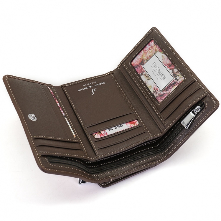 Размер 14 х 9 см. Закрывается на кнопку. Внутри - три отделения для купюр (одно на молнии), девять кармашков для пластиковых карт, четыре боковых кармана, прозрачное окошко для фотографии. Снаружи - отделение для монет на молнии