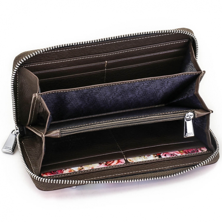 Размер 19 х 9,5 см. Закрывается на молнию. Внутри - три отделения и два кармана для купюр, отделение для монет на молнии, 9 кармашков для пластиковых карт.