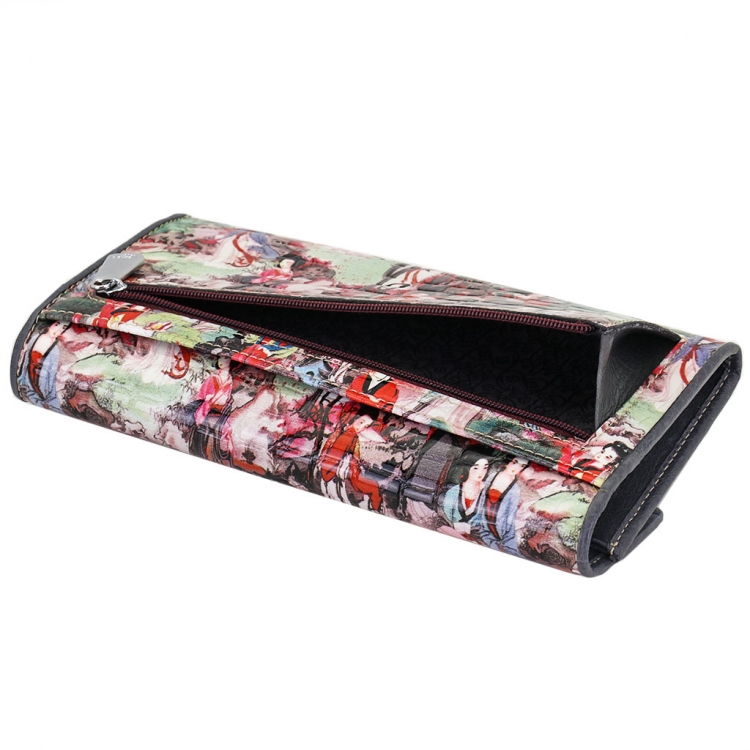 Размер 18,5 х 10 х 2,5 см. Закрывается на кнопку. Внутри - одно отделение и два кармана для купюр ,8 кармашков для пластиковых карт, продольное отделение в клапане. Снаружи, на тыльной стороне - карман без застёжки и отделение для монет на молнии. Портмоне упаковано в фирменную коробку.