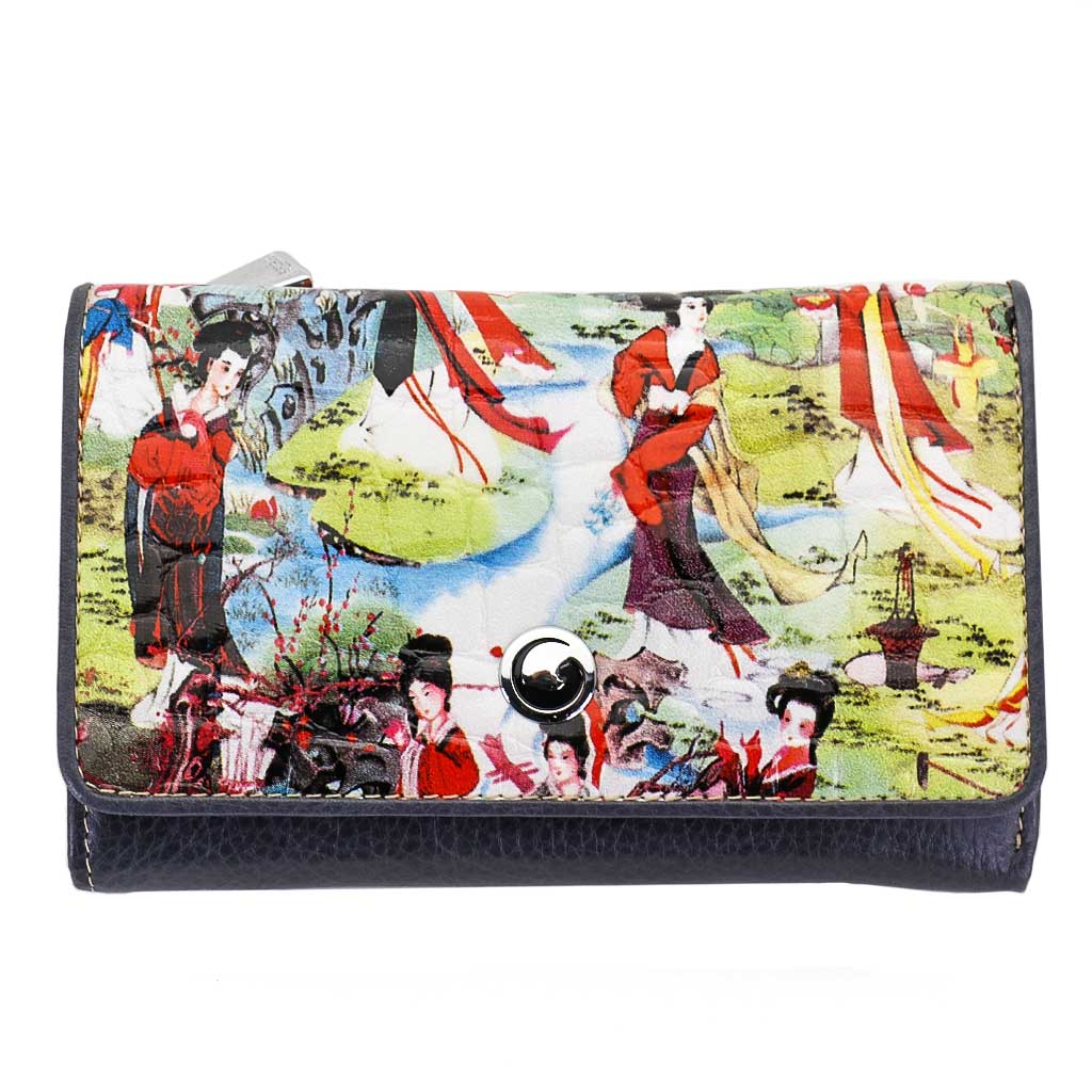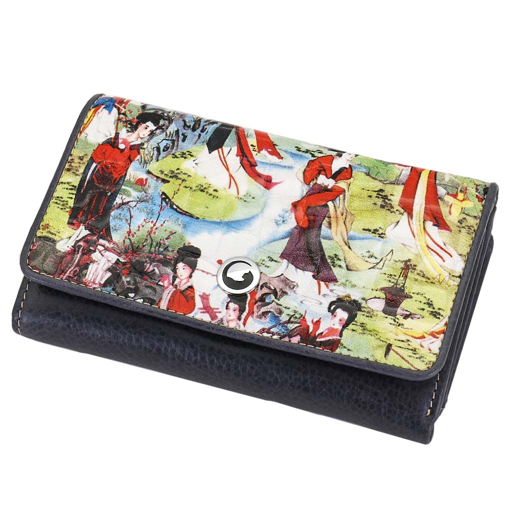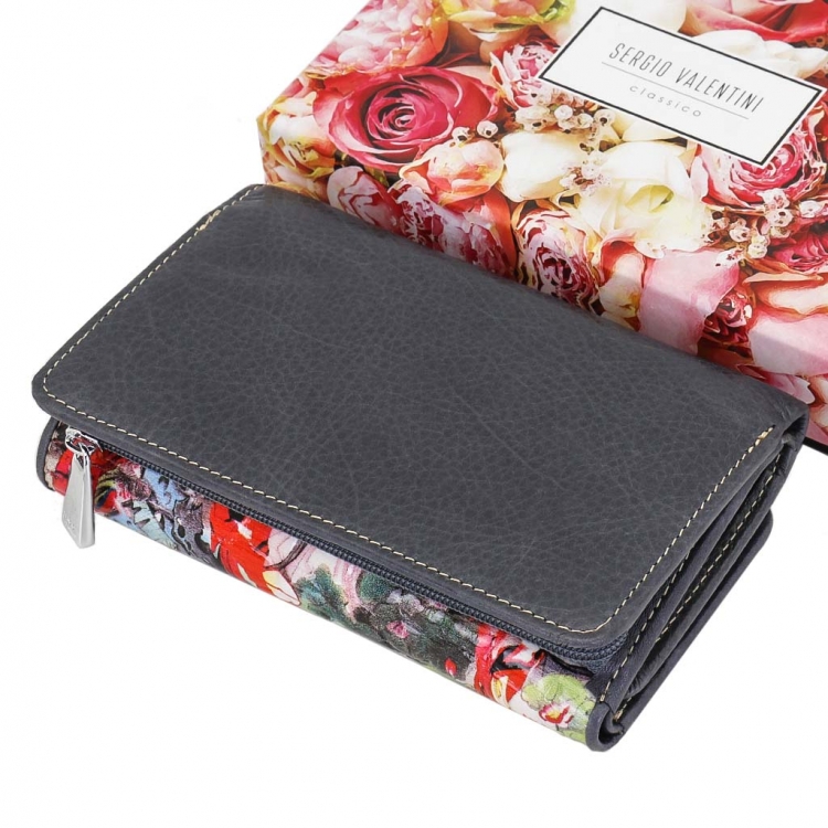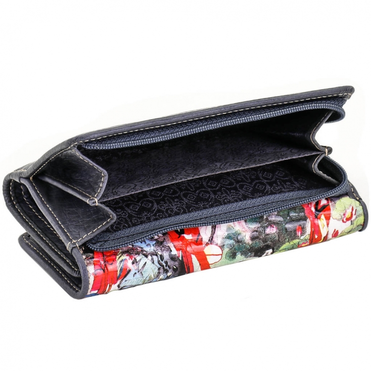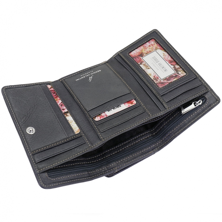 Размер 14 х 9 х 3,5 см. Закрывается на кнопку. Внутри - три отделения для купюр (одно на молнии), девять кармашков для пластиковых карт, четыре боковых кармана, прозрачное окошко для фотографии. Снаружи - отделение для монет на молнии. Портмоне упаковано в фирменную коробку.