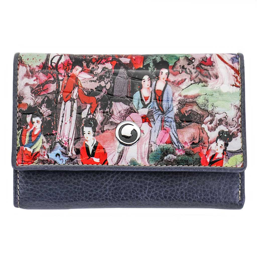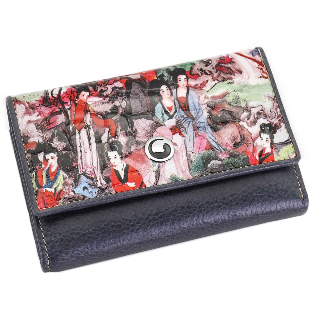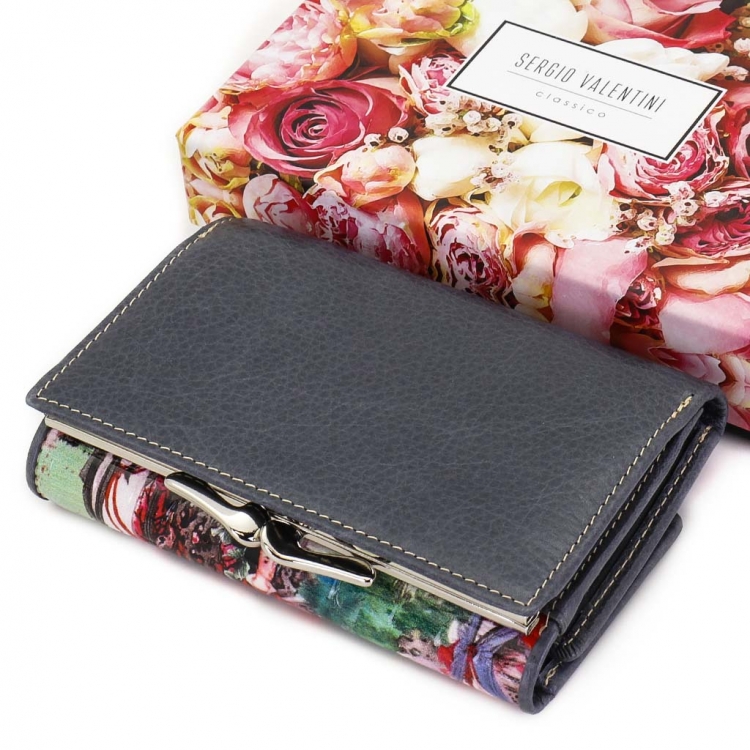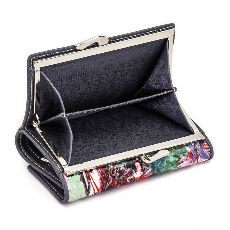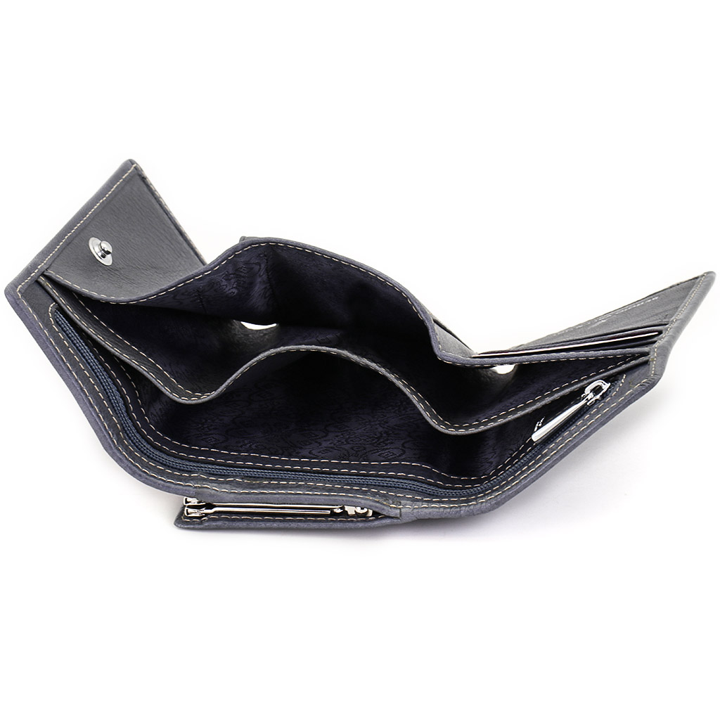 Размер 12,5 х 8,5 см. Закрывается на кнопку. Внутри - три отделения для купюр (одно на молнии), три кармашка для пластиковых карт, два боковых кармана, прозрачное окошко для фотографии. Снаружи - отделение для монет под рамочным замком.