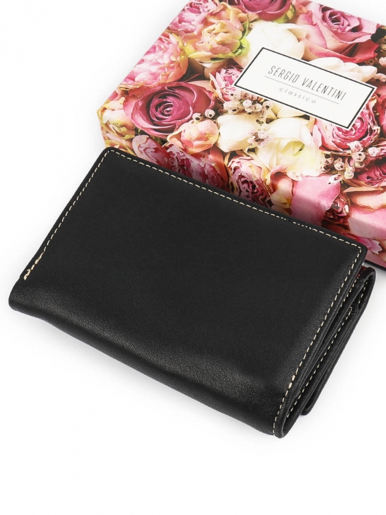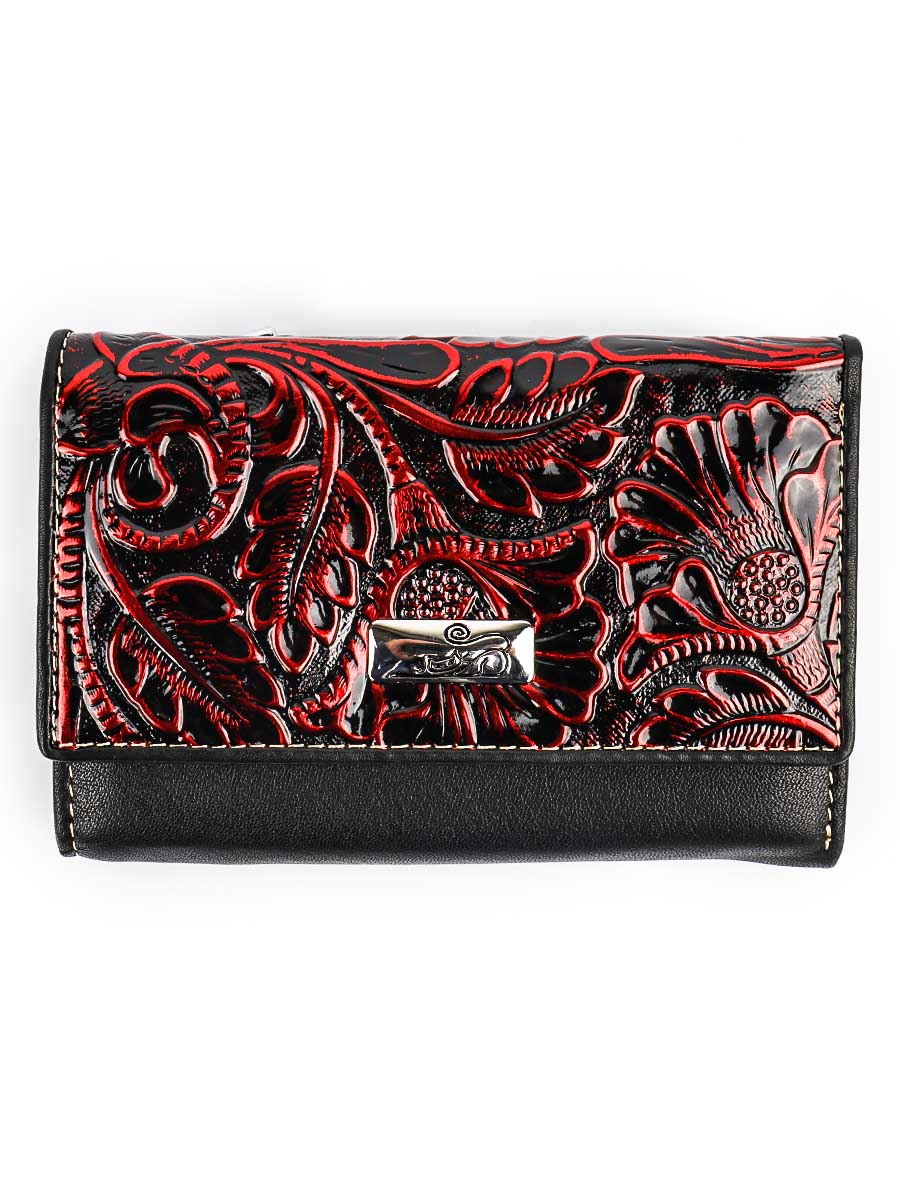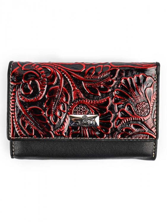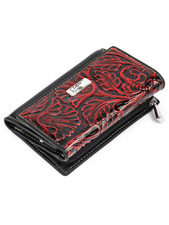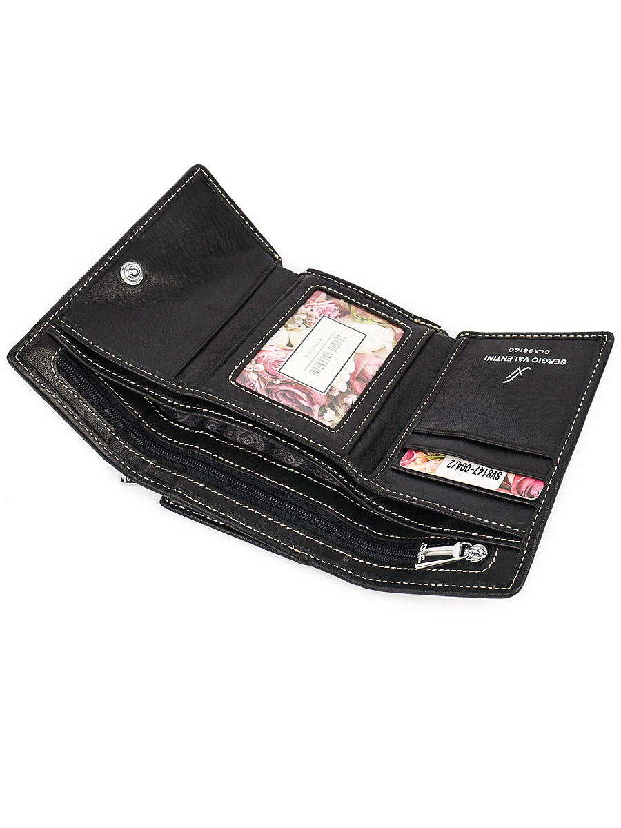 Размер 12,5 х 9 см.. Закрывается на кнопку. Внутри - три отделения для купюр (одно на молнии), три кармашка для пластиковых карт, два боковых кармана, прозрачное окошко для фотографии. Снаружи - отделение для монет на молнии.
