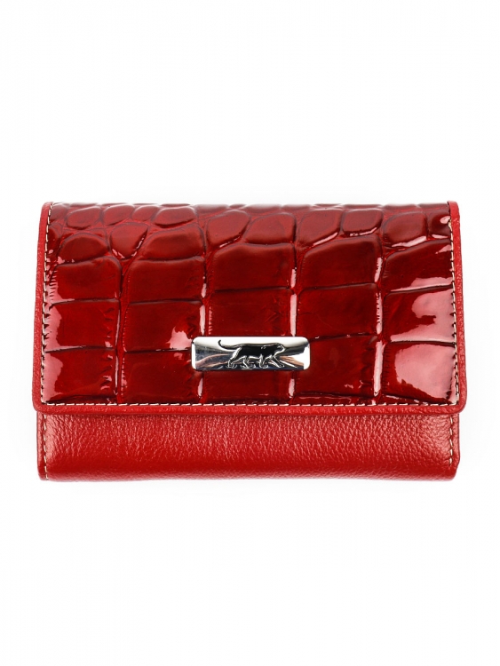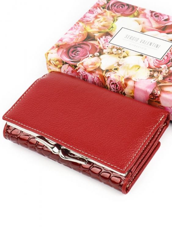 Размер 12,5 х 8,5 см. Закрывается на кнопку. Внутри - три отделения для купюр (одно на молнии), три кармашка для пластиковых карт, два боковых кармана, прозрачное окошко для фотографии. Снаружи - отделение для монет под рамочным замком.