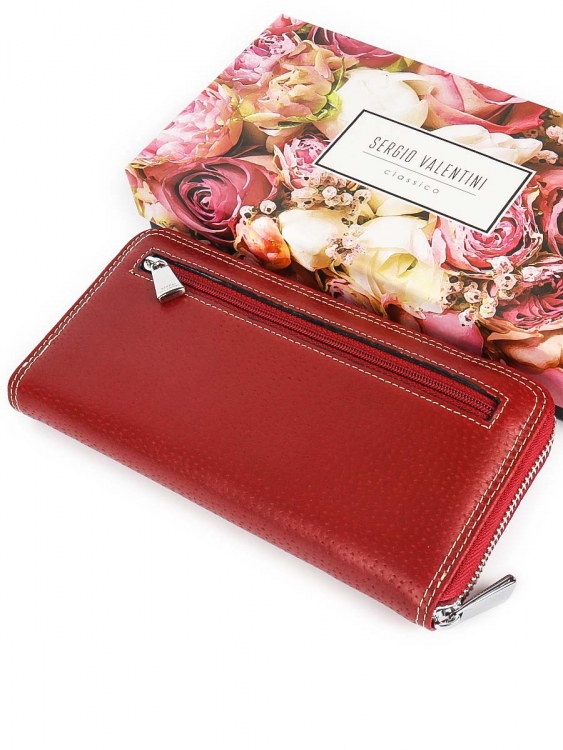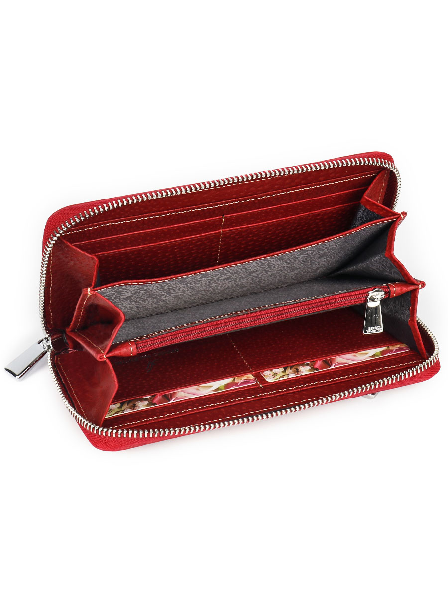 Размер 19 х 9,5 см. Закрывается на молнию. Внутри - три отделения и два кармана для купюр, отделение для монет на молнии, 9 кармашков для пластиковых карт.