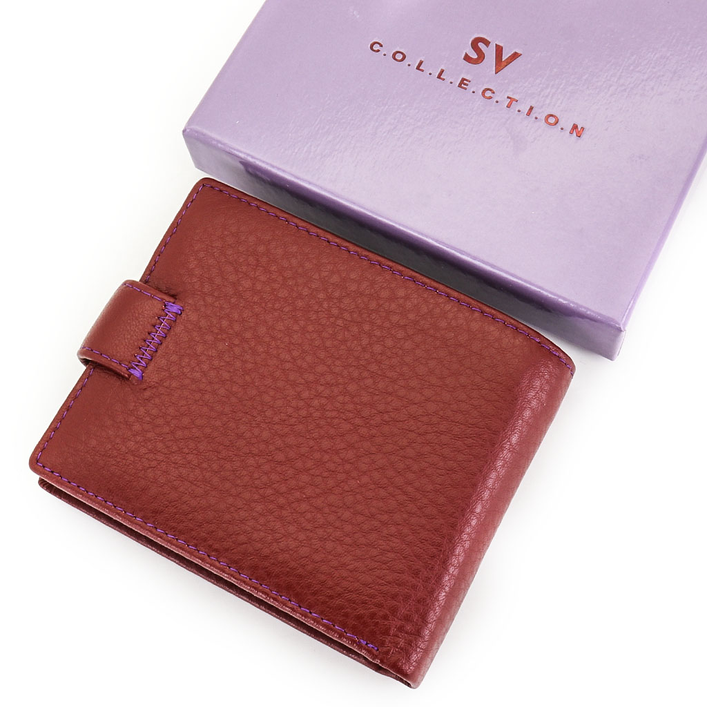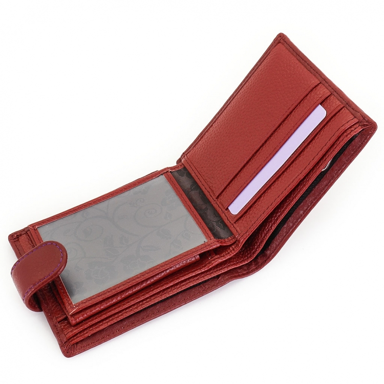 Размер 11,5 х 9,5 х 2,5 см. Закрывается на хлястик с кнопкой. Внутри три отделения для купюр (одно на молнии), три кармашка для пластиковых карт, два прозрачных окошка на клапане, два боковых кармана и отделение для монет, закрывающееся на клапан с кнопкой. Упаковано в фирменную коробку.