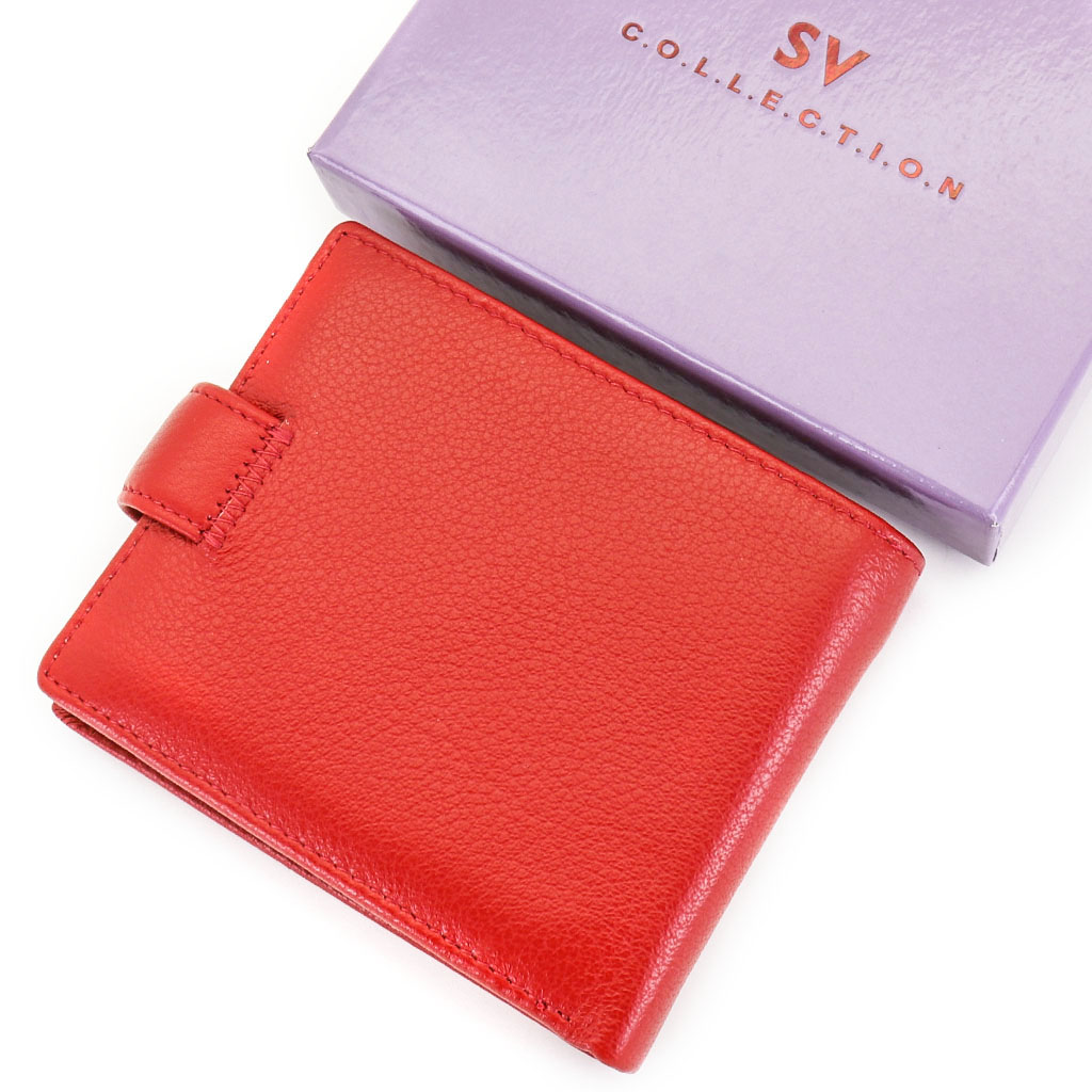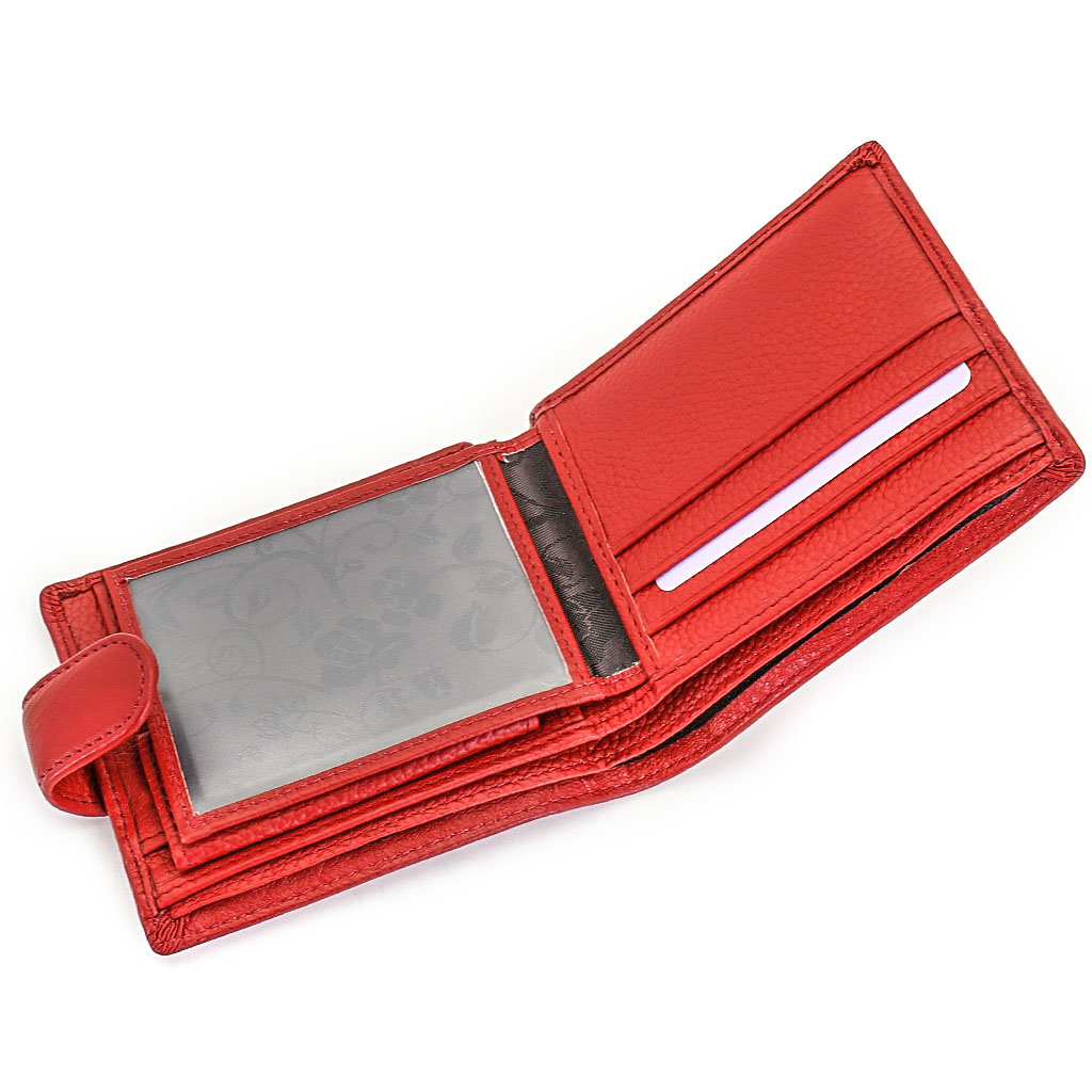 Размер 11,5 х 9,5 х 2,5 см. Закрывается на хлястик с кнопкой. Внутри три отделения для купюр (одно на молнии), три кармашка для пластиковых карт, два прозрачных окошка на клапане, два боковых кармана и отделение для монет, закрывающееся на клапан с кнопкой. Упаковано в фирменную коробку.