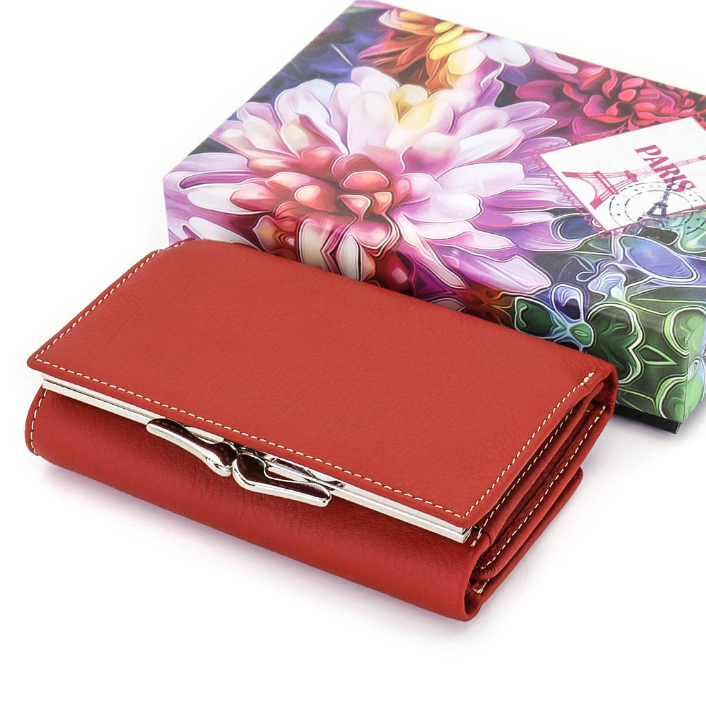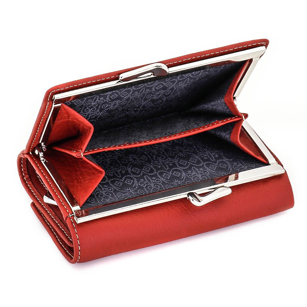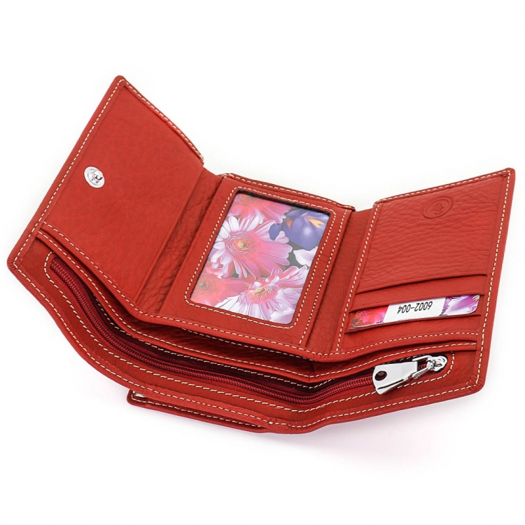 Размер 12,5 х 8,5 см. Закрывается на кнопку. Внутри - три отделения для купюр (одно на молнии), три кармашка для пластиковых карт, два боковых кармана, прозрачное окошко для фотографии. Снаружи - отделение для монет под рамочным замком.