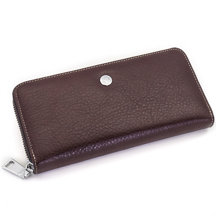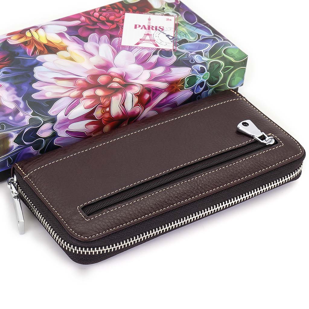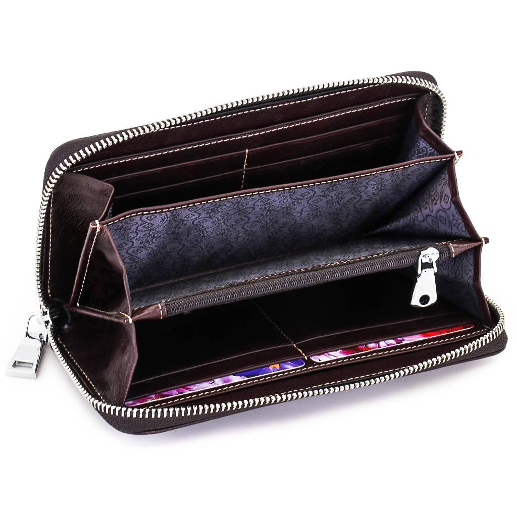 Размер 19 х 9,5 см. Закрывается на молнию. Внутри - три отделения и два кармана для купюр, отделение для монет на молнии, 9 кармашков для пластиковых карт.