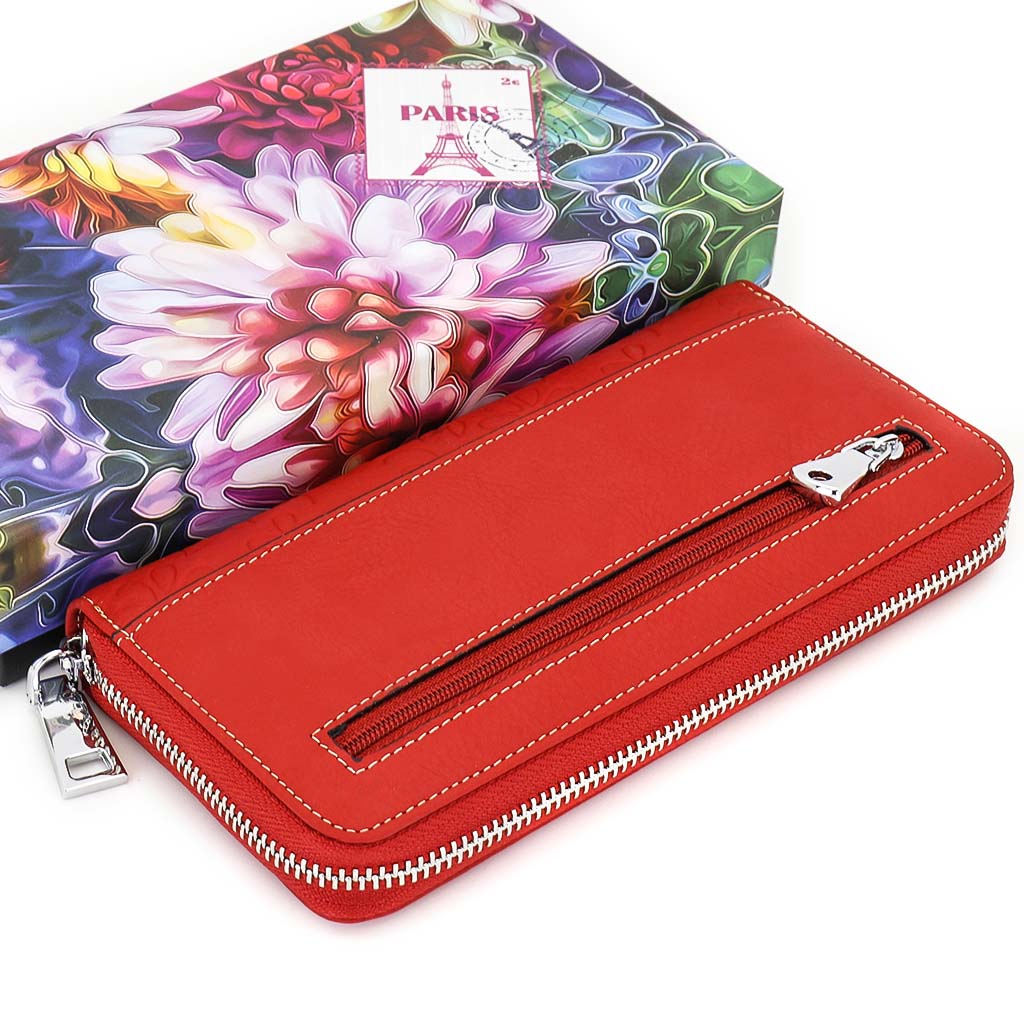 Размер 19 х 9,5 см. Закрывается на молнию. Внутри - три отделения и два кармана для купюр, отделение для монет на молнии, 9 кармашков для пластиковых карт.