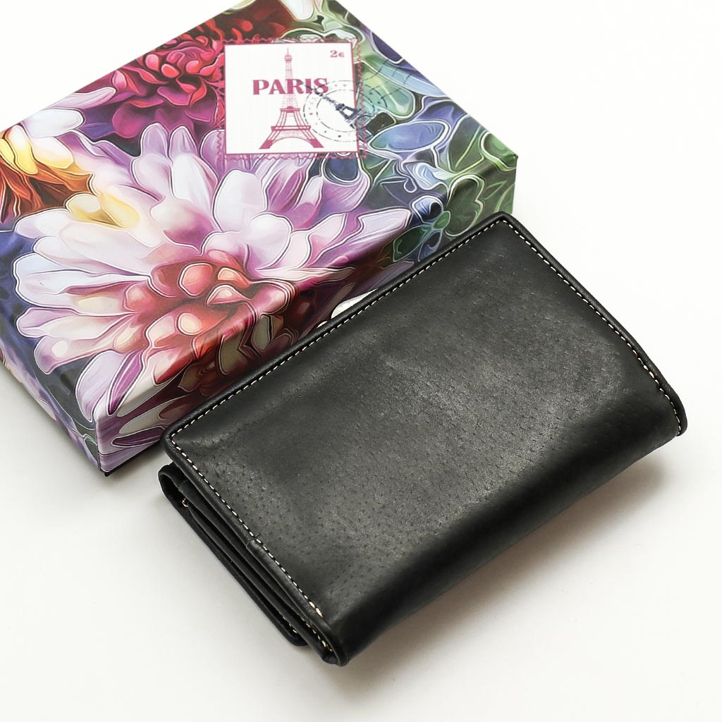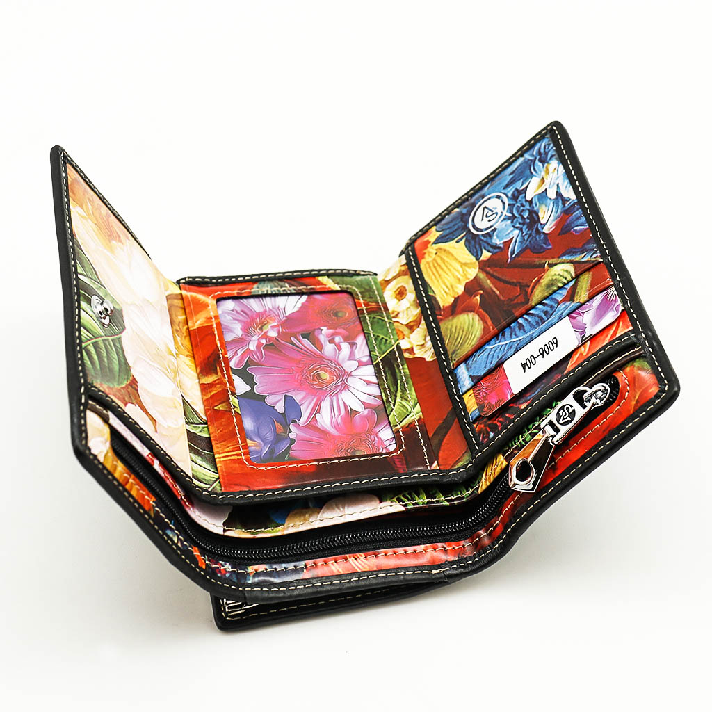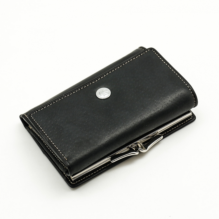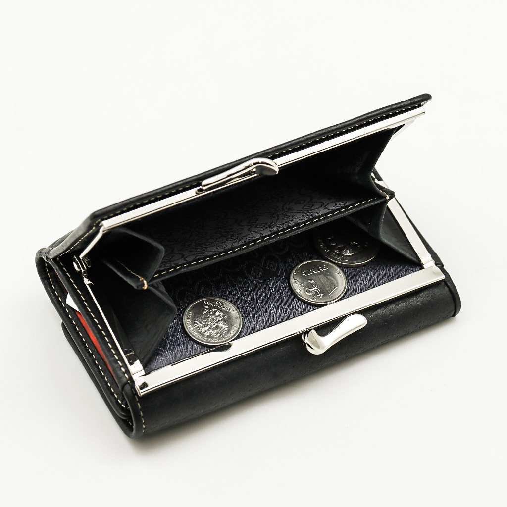 Размер 12,5 х 8,5 см. Закрывается на кнопку. Внутри - три отделения для купюр (одно на молнии), три кармашка для пластиковых карт, два боковых кармана, прозрачное окошко для фотографии. Снаружи - отделение для монет под рамочным замком.