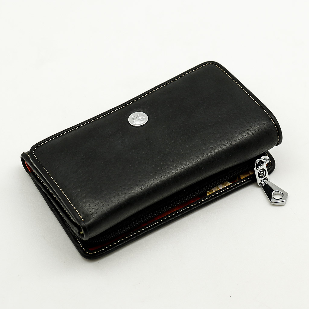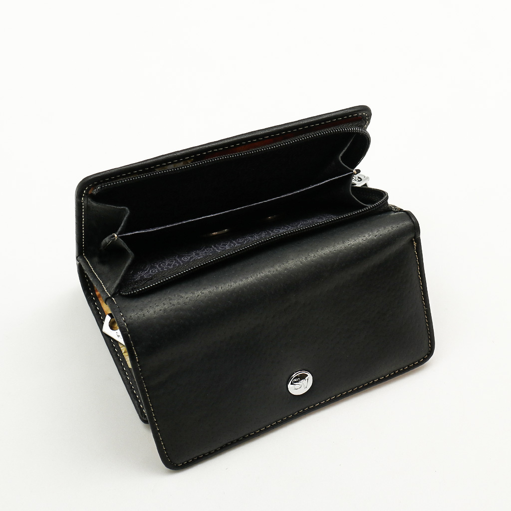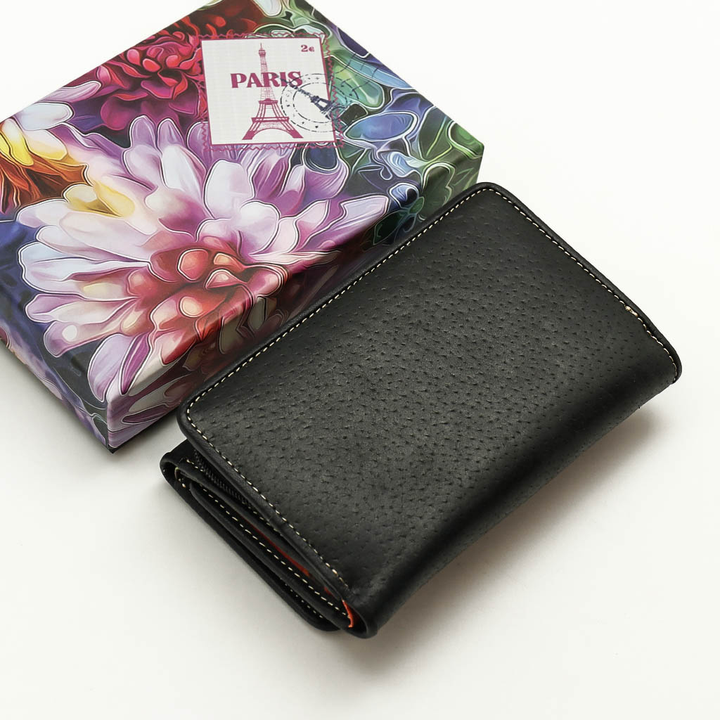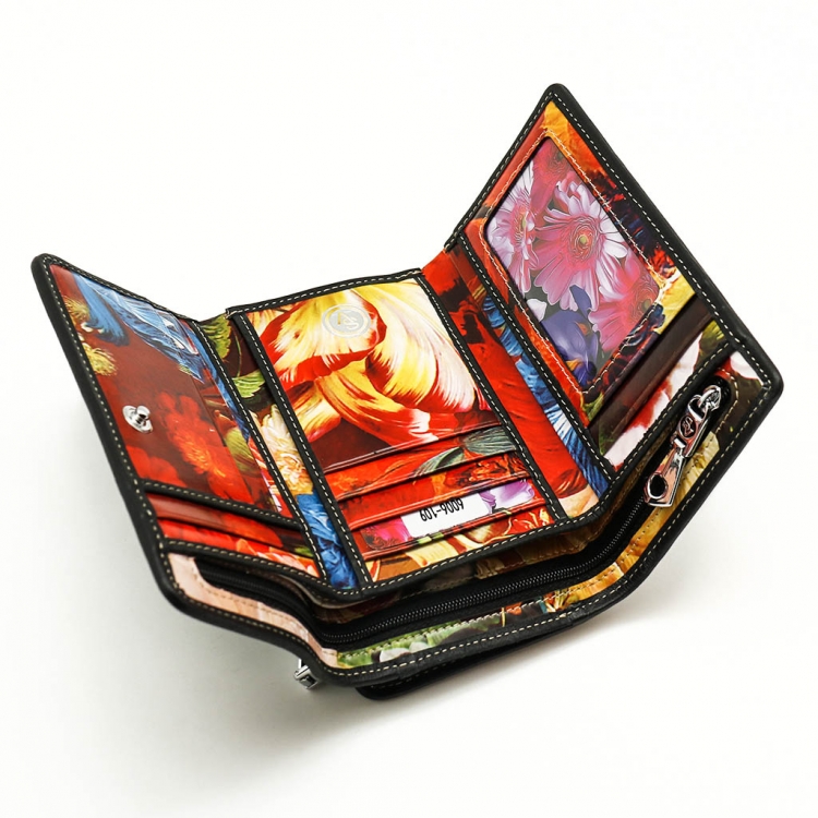 Размер 14 х 9 см. Закрывается на кнопку. Внутри - три отделения для купюр (одно на молнии), девять кармашков для пластиковых карт, четыре боковых кармана, прозрачное окошко для фотографии. Снаружи - отделение для монет на молнии