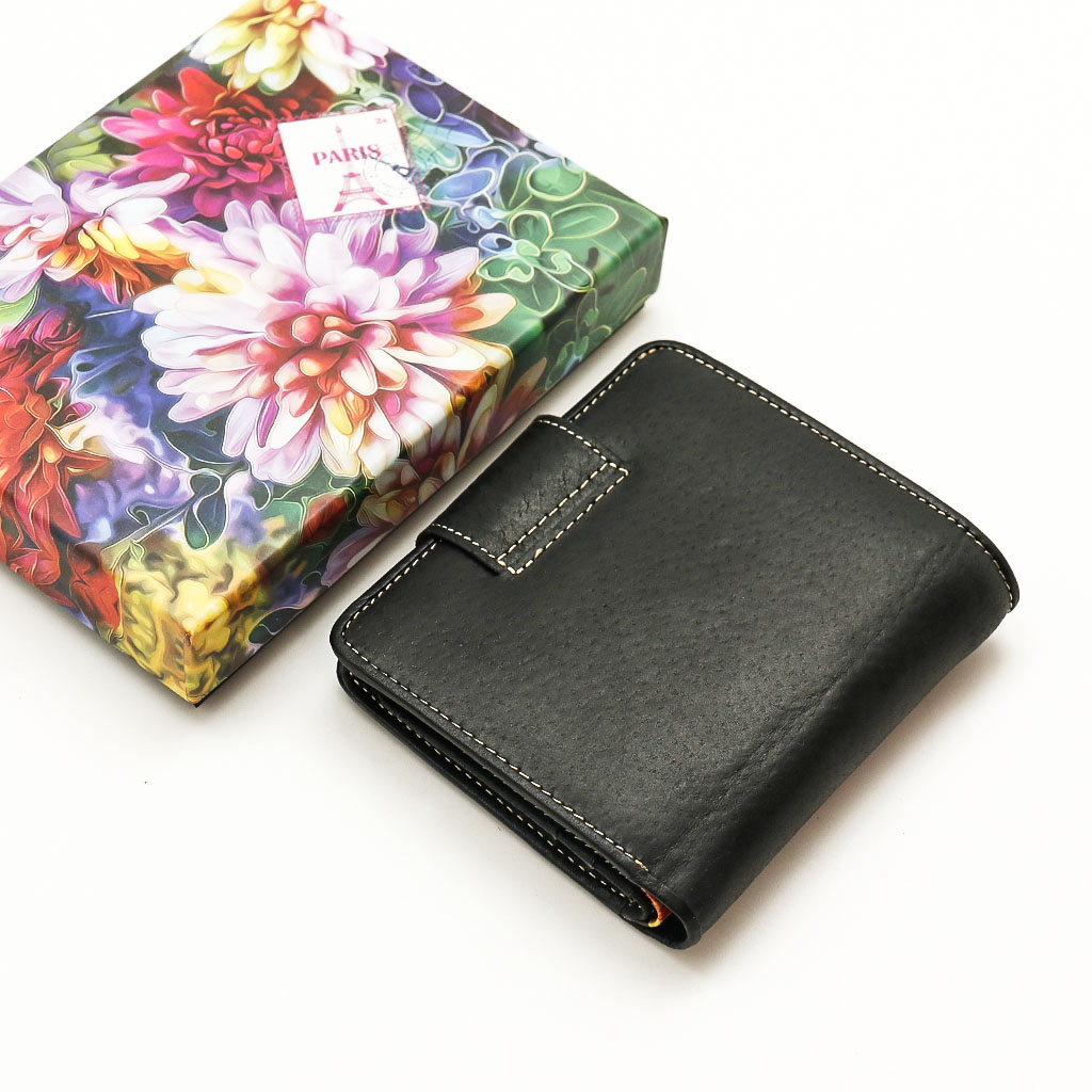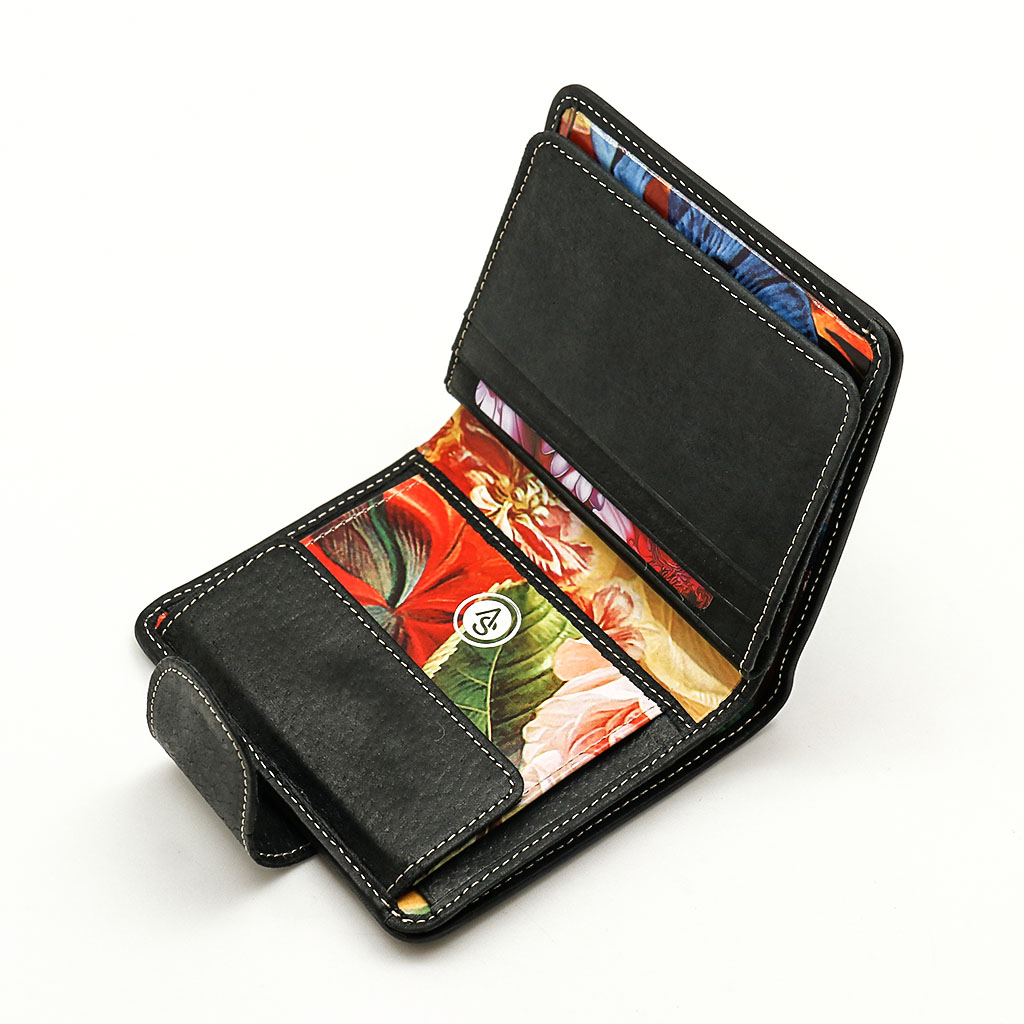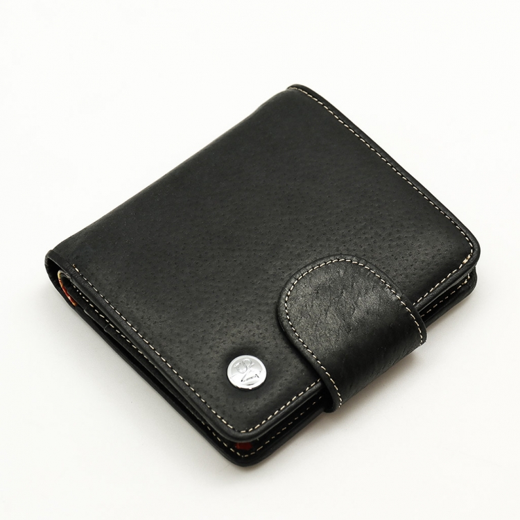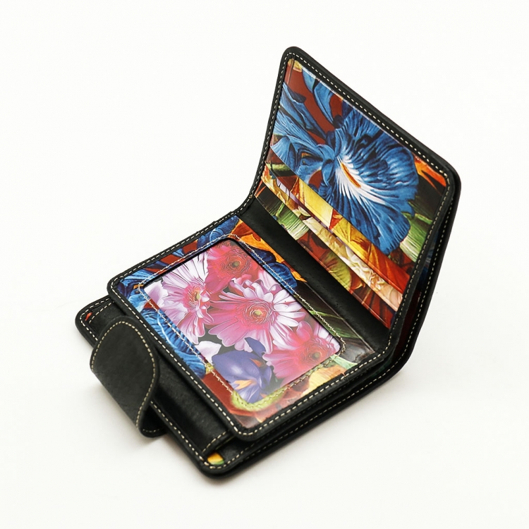Размер 10 х 11 см. Закрывается на хлястик с кнопкой. Внутри - два отделения для купюр, шесть кармашков для пластиковых карт, два боковых кармана, прозрачное окошко для фотографии, карман для монет на кнопке.