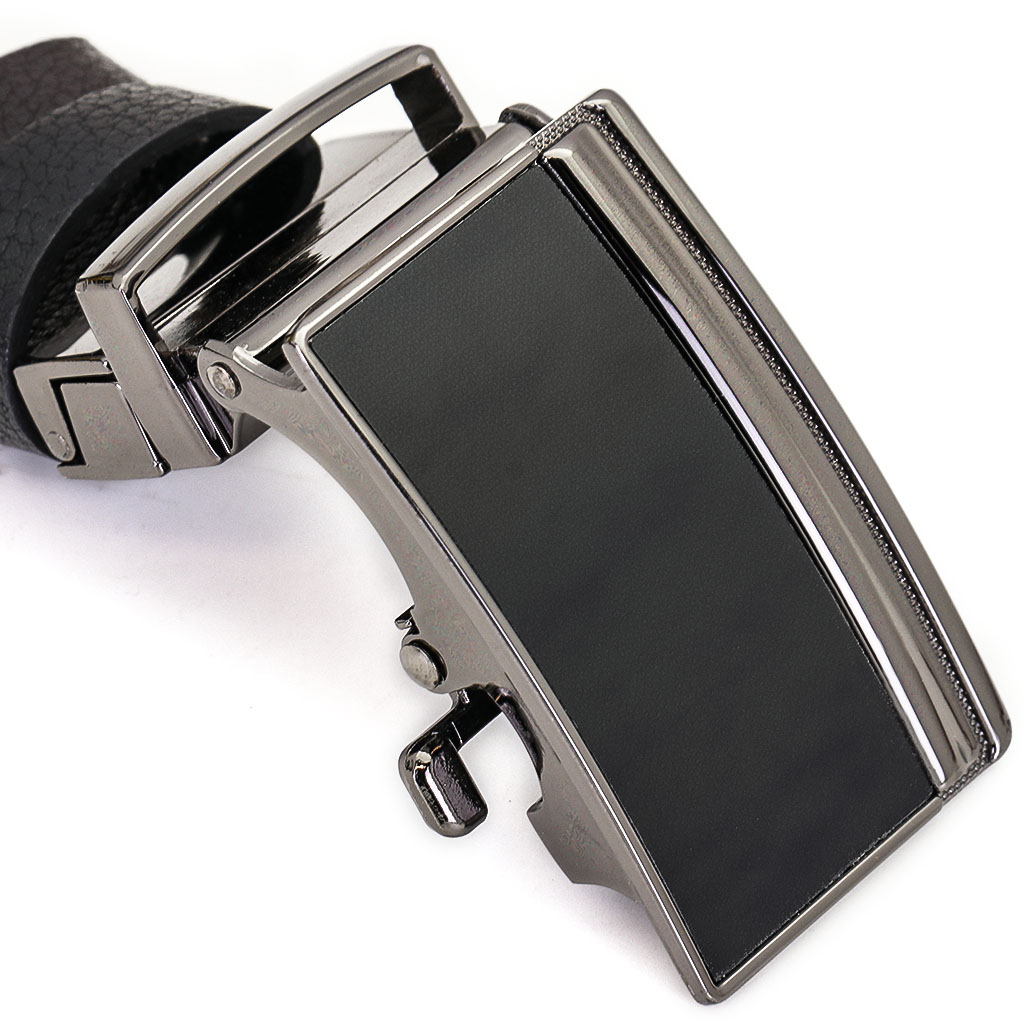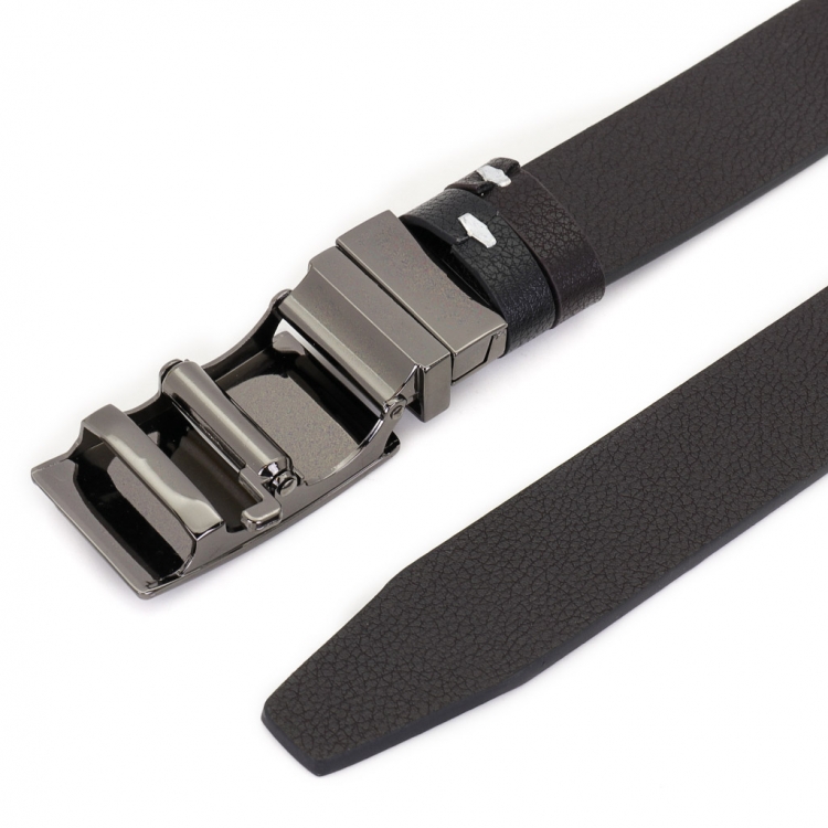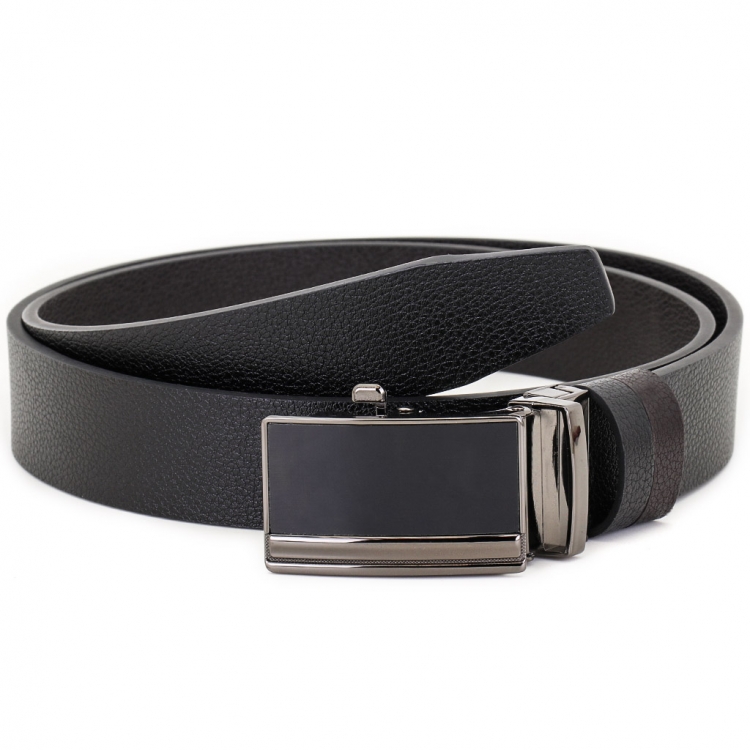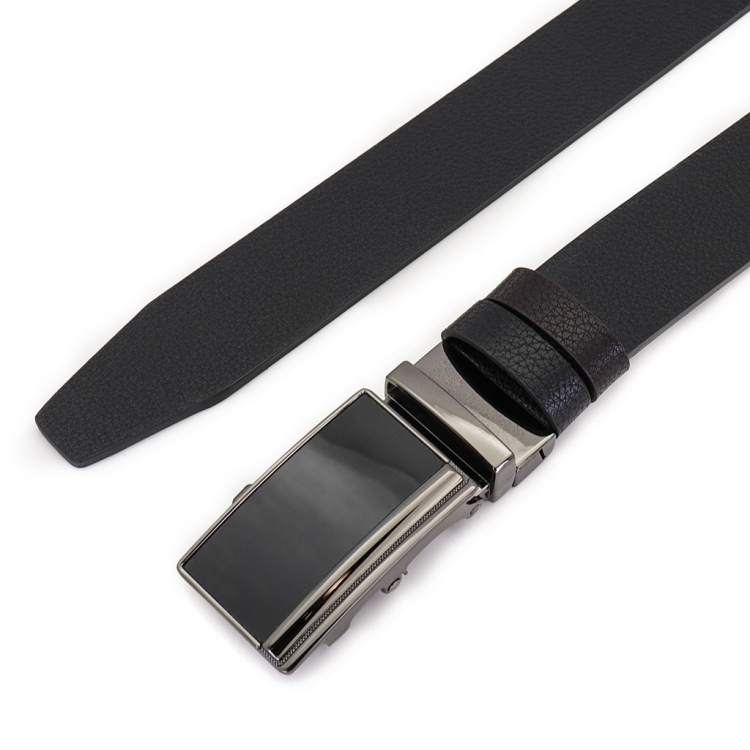 Двухсторонний ремень из экокожи черного и тёмнокоричневого цветов. Пряжка автоматическая с реверсом (поворачивается на 360 градусов) , съемная. Ремень можно легко укоротить. Ширина полотна 34 мм, длина 110 см.