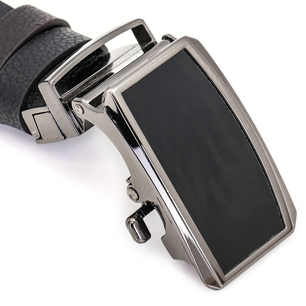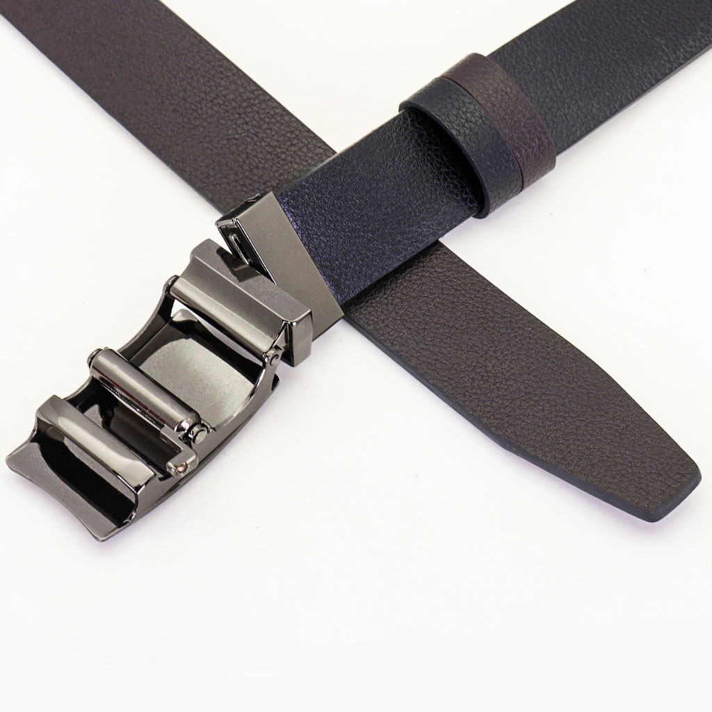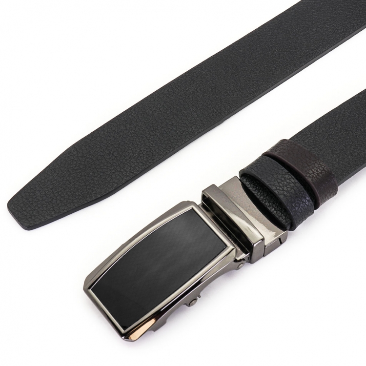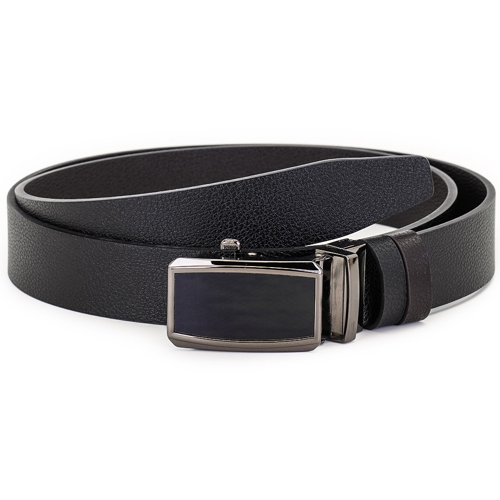 Двухсторонний ремень из экокожи черного и тёмнокоричневого цветов. Пряжка автоматическая с реверсом (поворачивается на 360 градусов) , съемная. Ремень можно легко укоротить. Ширина полотна 34 мм, длина 110 см.