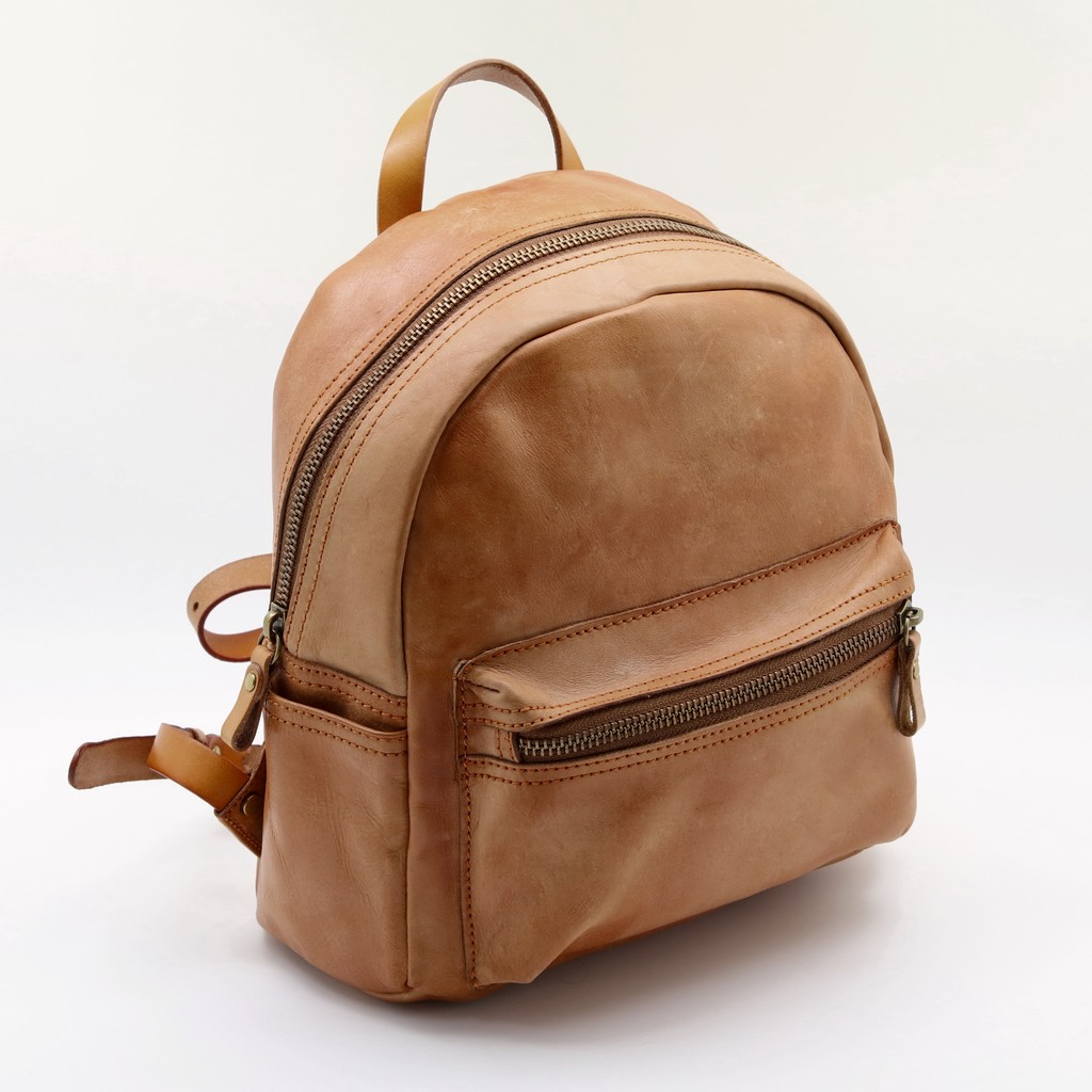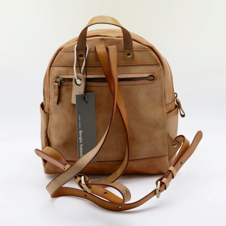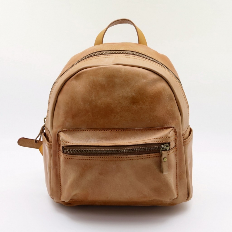 Размер 24 х 23 х 10 см. Оригинальный рюкзачек в стиле Кэмел, изготовлен из полутвёрдой кожи. Закрывается на металлическую молнию. На передней стороне карман на молнии. Внутри одно отделение. С боков по одному открытому кармашку. На обратной стороне карман на молнии. Длина лямок регулируется. Имеет небольшую ручку для ношения сумки в руке.