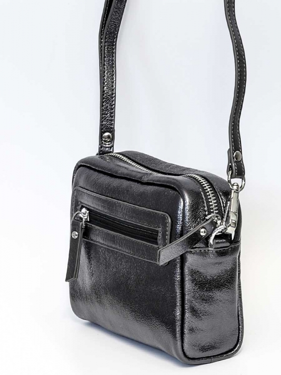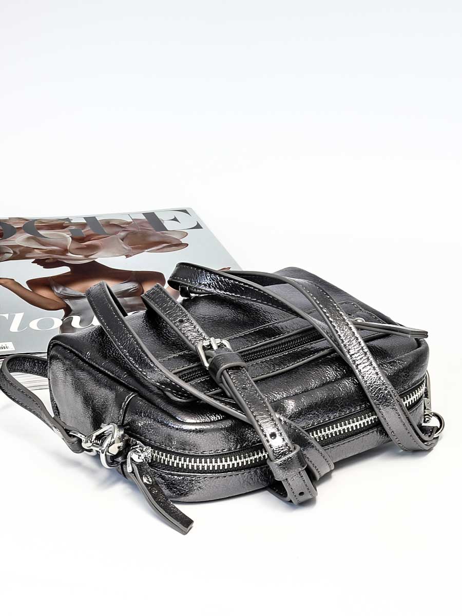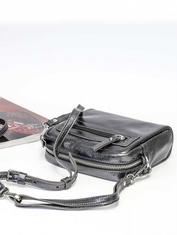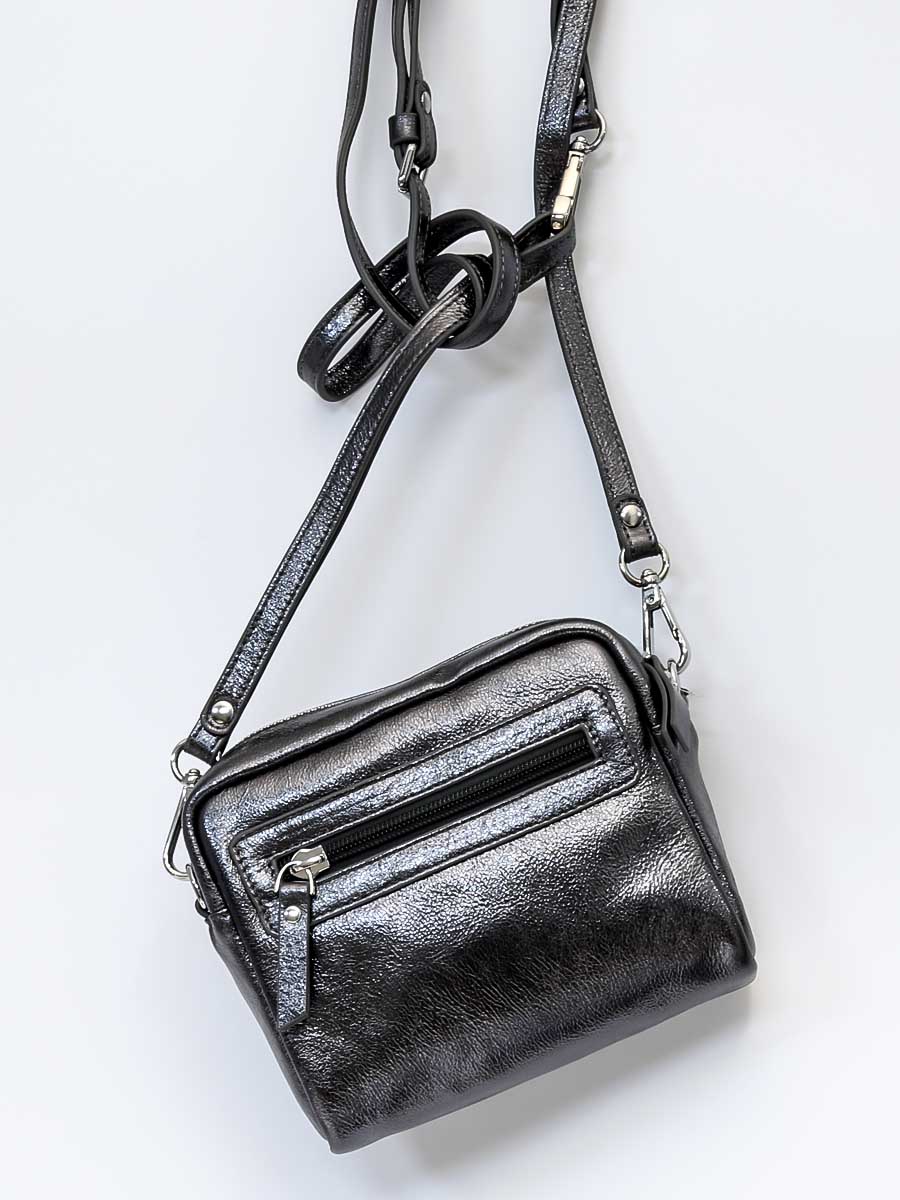 Размер 15 х 14 х 6 см. Имеет одно отделение, закрывающееся на молнию. На обратной стороне карман на молнии. Сумка укомплектована съёмным наплечным ремешком и короткой ручкой, для ношения в руке.