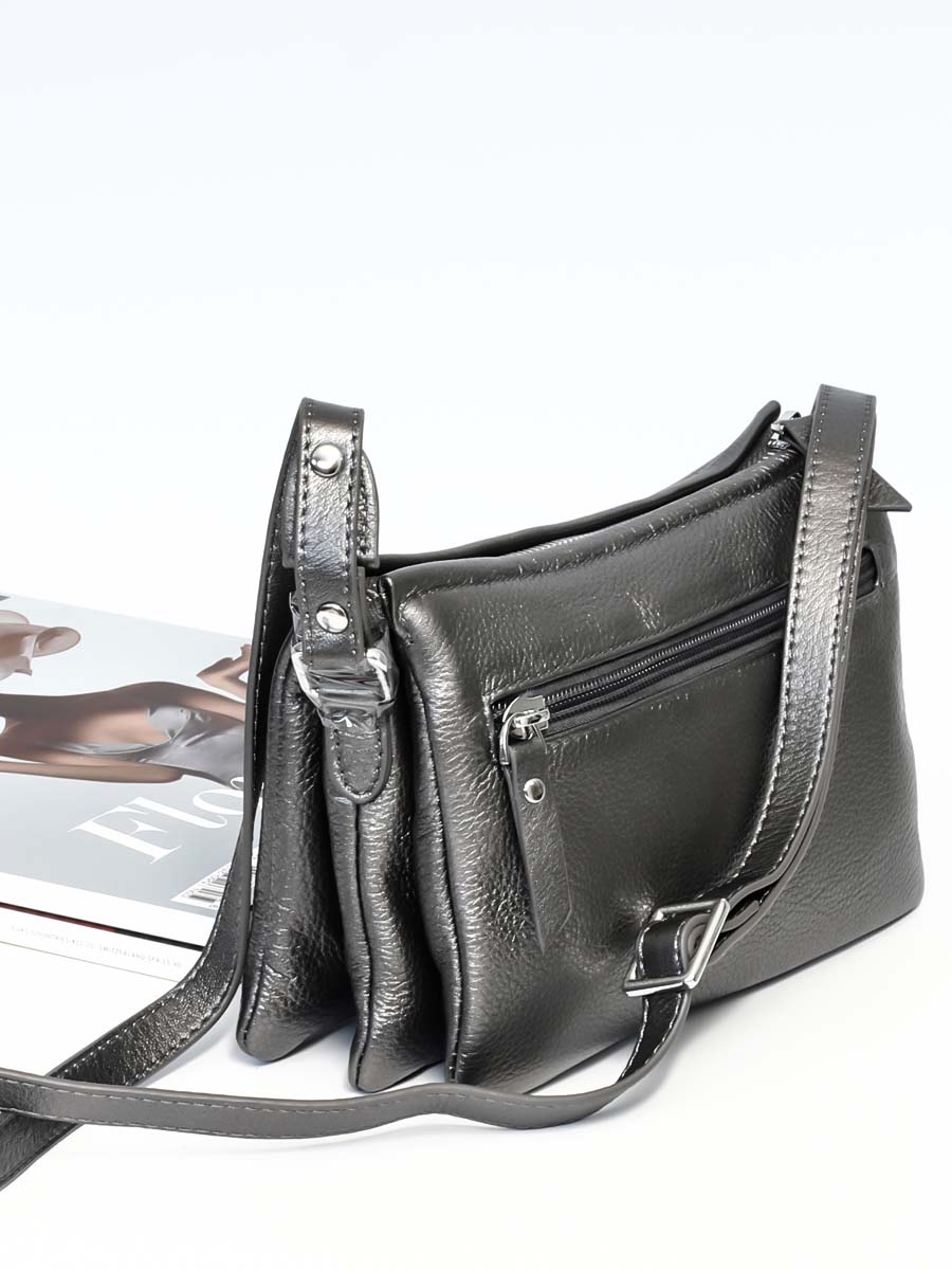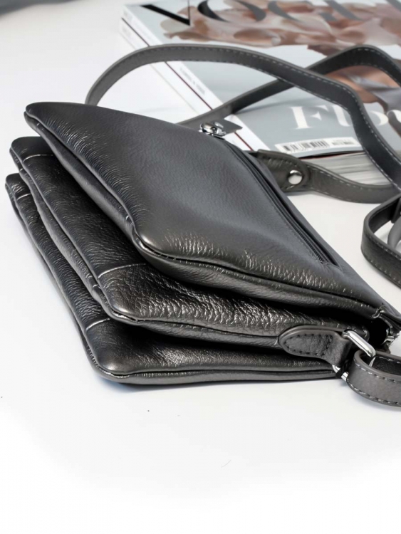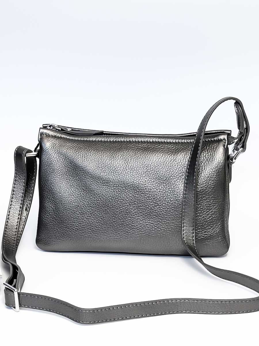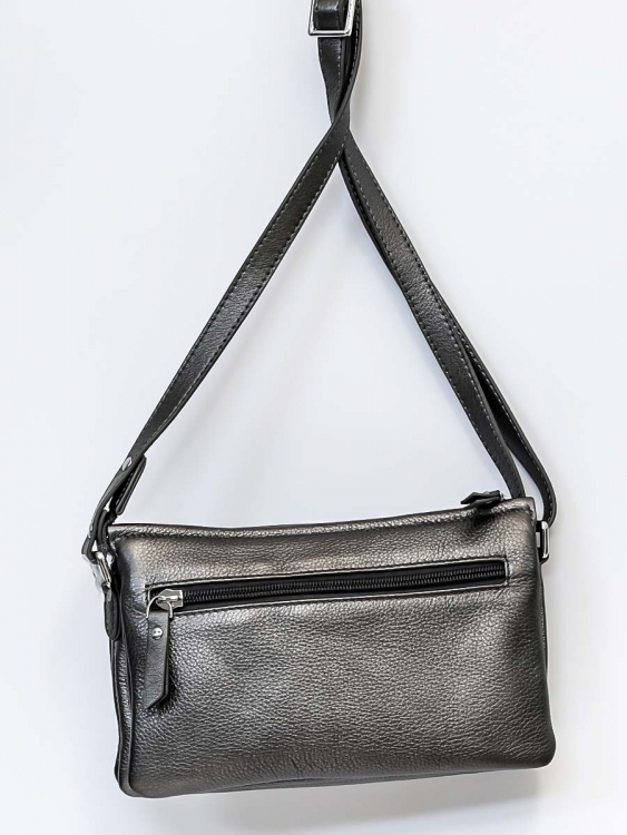 Размер 21,5 х 13,5 х 5 см. Закрывается на молнию. Внутри три отделения и карман на молнии. На обратной стороне карман на молнии. Сумка оснащена регулируемым по длине наплечным ремешком.