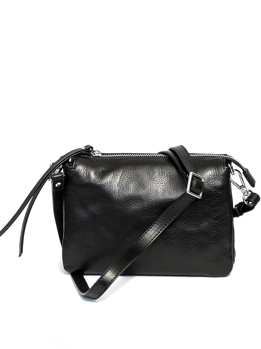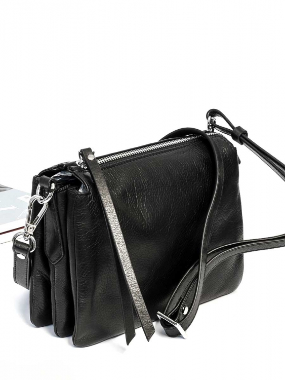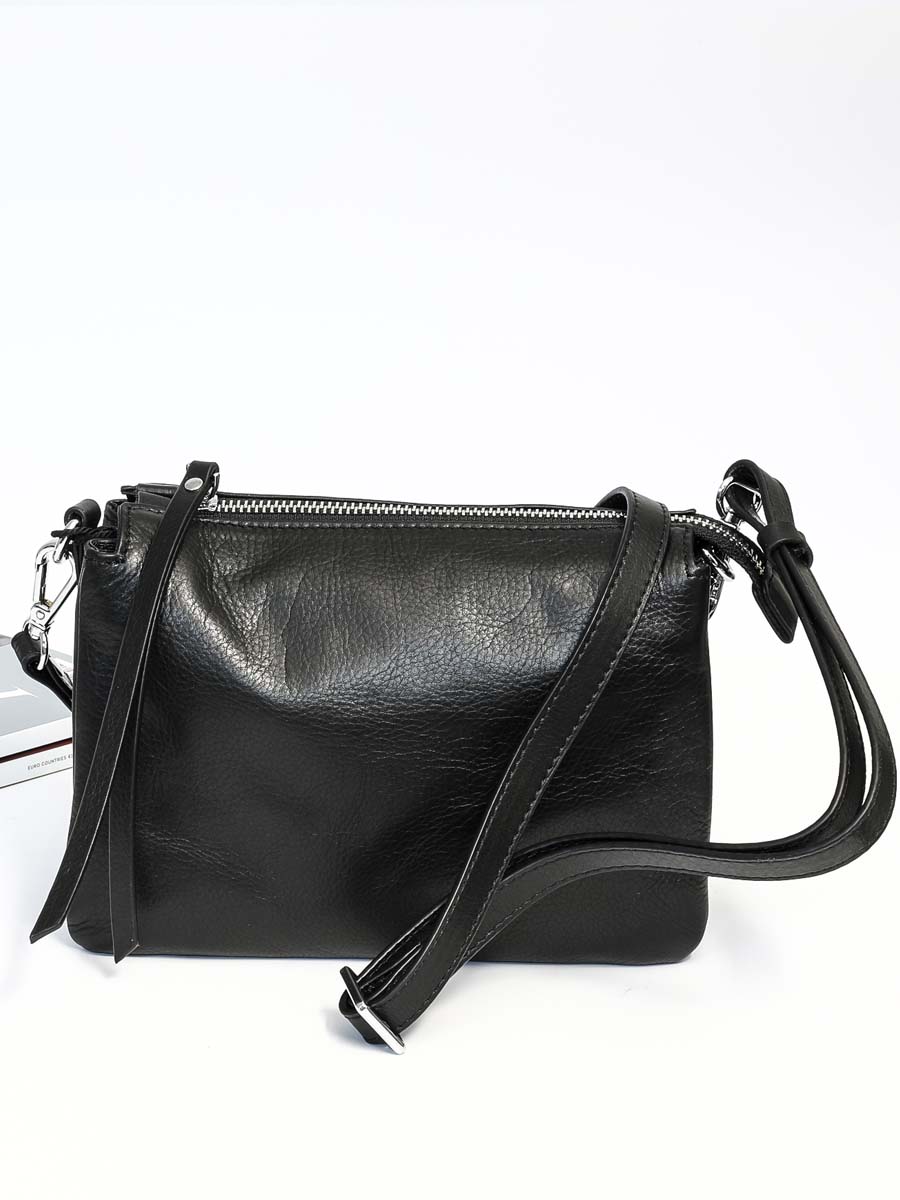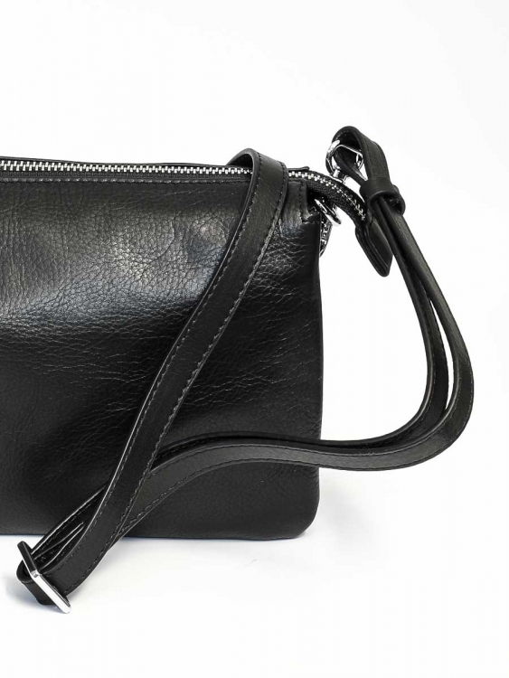 Размер 21,5 х 16 х 6 см. Закрывается на молнию. Внутри три отделения и карман на молнии. На обратной стороне карман на молнии. Сумка оснащена регулируемым по длине наплечным ремешком.