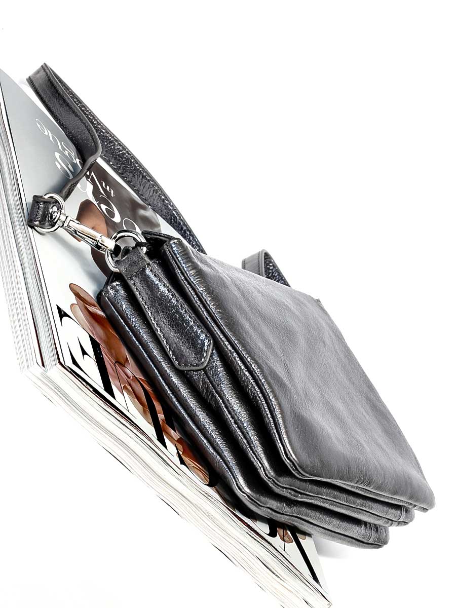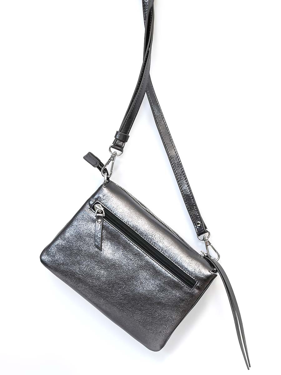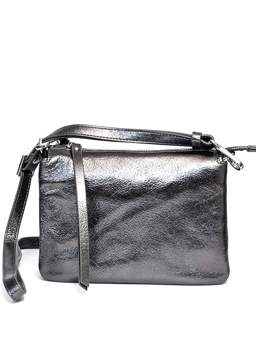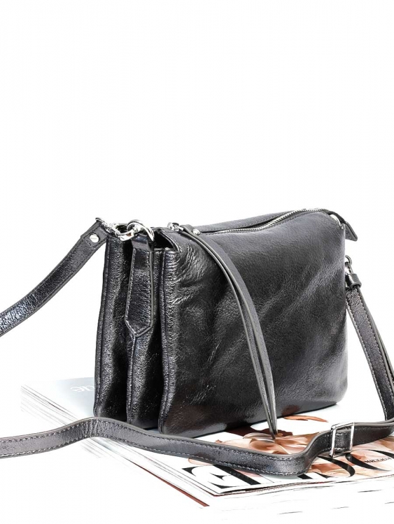 Размер 21,5 х 16 х 6 см. Закрывается на молнию. Внутри три отделения и карман на молнии. На обратной стороне карман на молнии. Сумка оснащена регулируемым по длине наплечным ремешком.