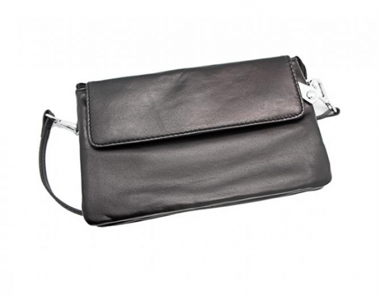 Размер 21 х 12,5 см. Закрывается на молнию, внутри пять отделений и шесть кармашков для визитных карточек. На лицевой стороне карман, закрывающийся клапаном. Сумочка укомплектована наплечным ремешком.