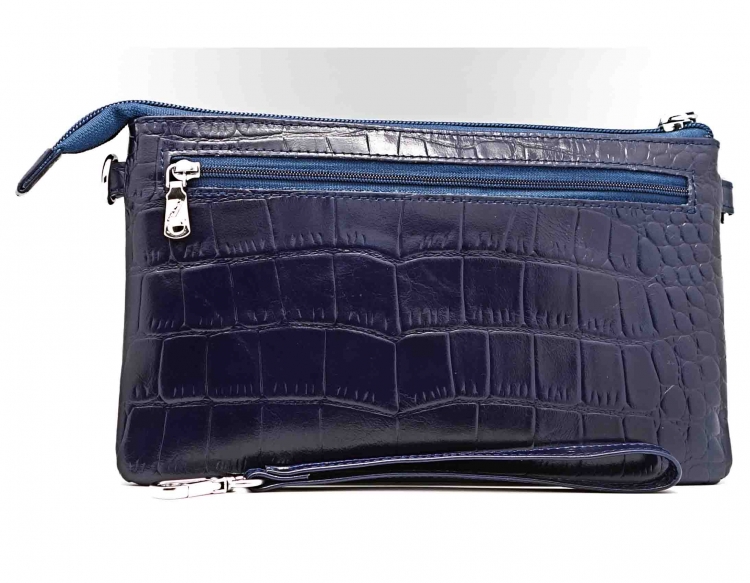 Размер 23 х 13.5см. Закрывается на молнию. Внутри: три открытых отделения, два кармана на молнии, 8 кармашков для пластиковых карт, одно прозрачное окошко для фотографии. Снаружи, на оборотной стороне, карман на молнии. К сумке пристёгивается короткая ручка.