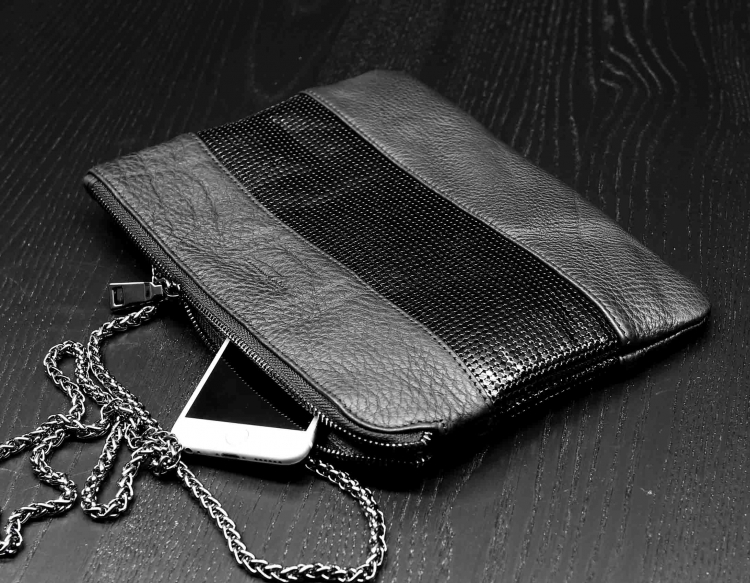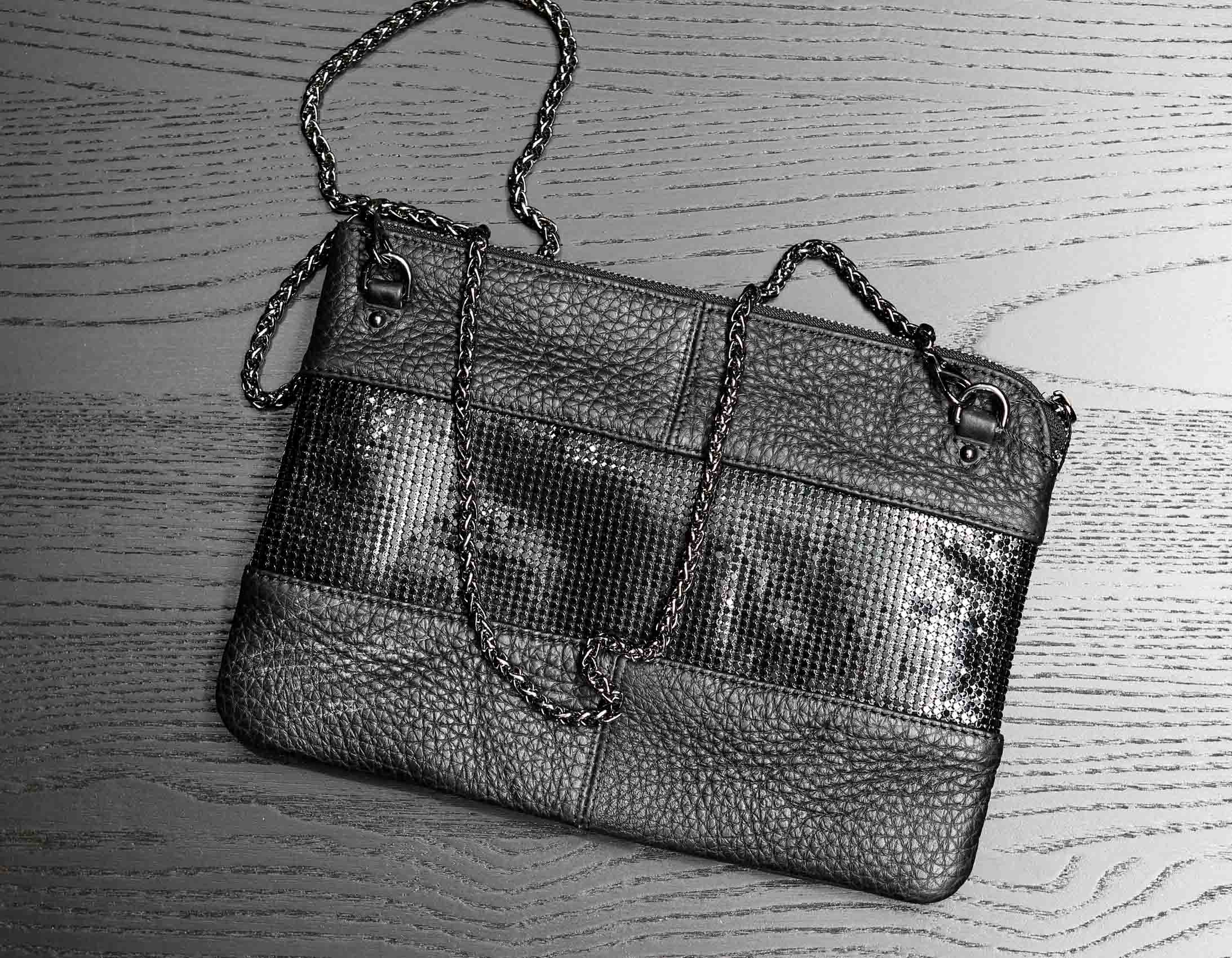 Размер 27 х 19 см. Закрывается на молнию. Внутри одно отделение, карман на молнии, два кармана для телефона и мелких предметов. В качестве наплечного ремня использована декоративная цепочка с карабинами. В отделке сумки использовона широкая декоративная полоса из наборных металличемких пластинок.