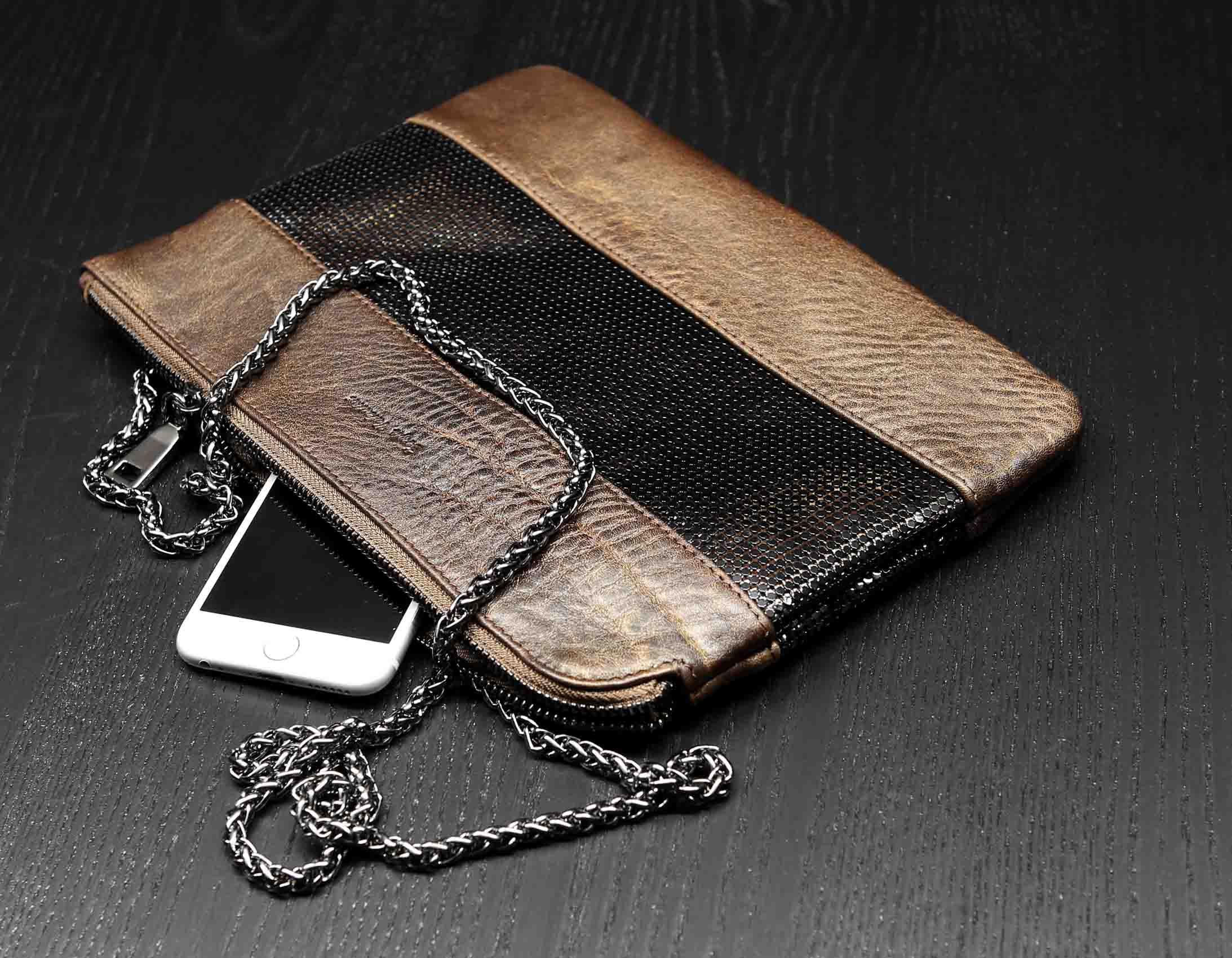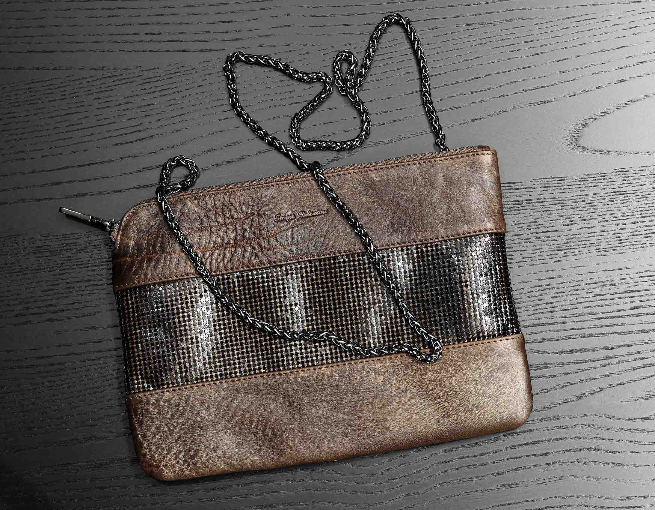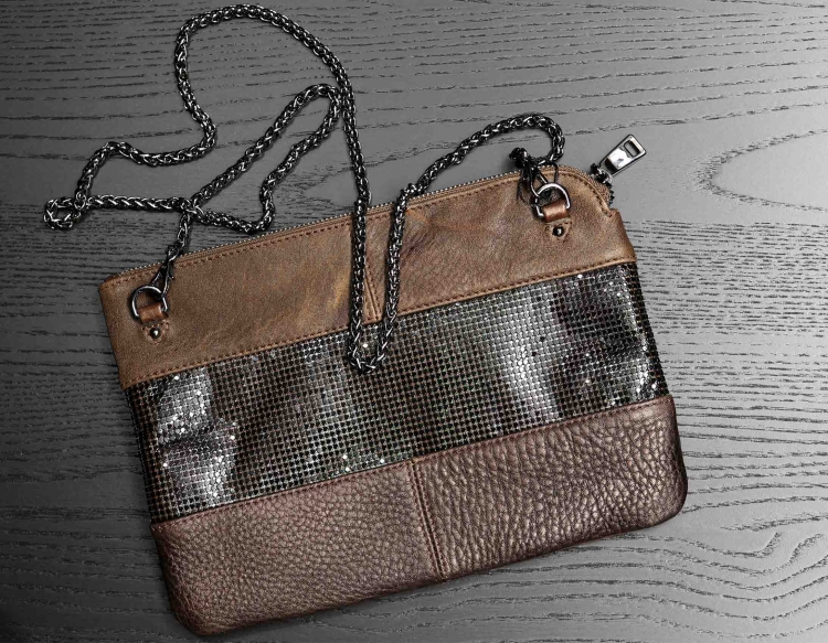 Размер 27 х 19 см. Закрывается на молнию. Внутри одно отделение, карман на молнии, два кармана для телефона и мелких предметов. В качестве наплечного ремня использована декоративная цепочка с карабинами. В отделке сумки использовона широкая декоративная полоса из наборных металличемких пластинок.