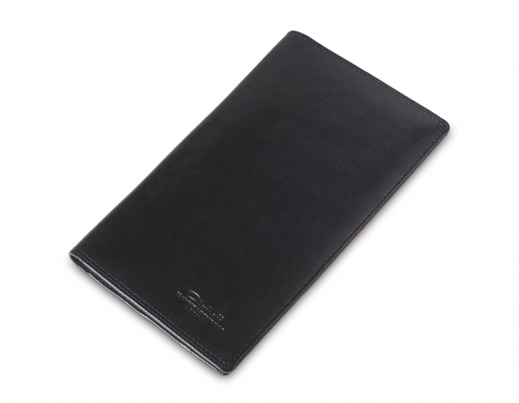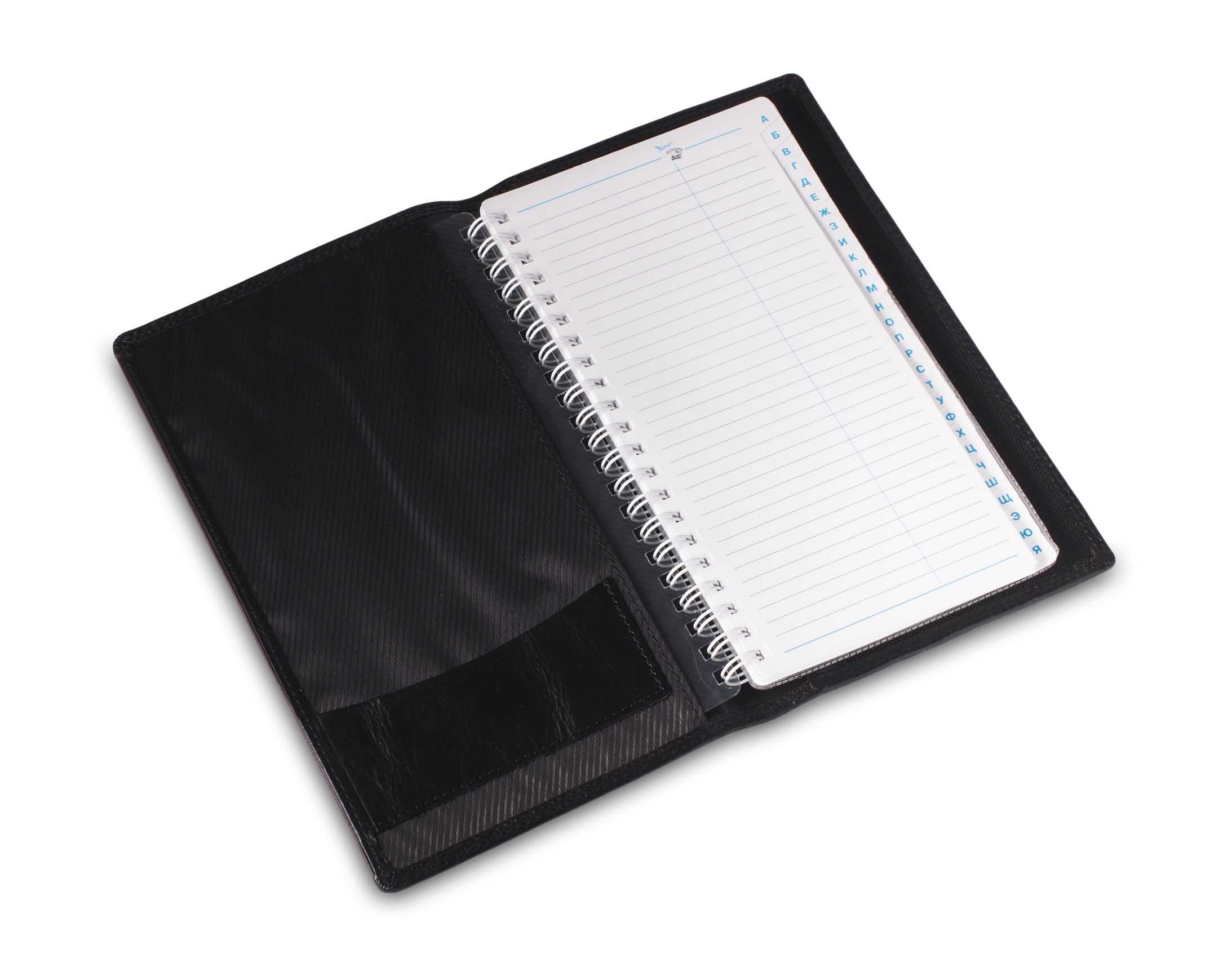 Размер: 12 х 20,5 см. Внутри обложки из натуральной кожи находится телефонная книжка с пружинным переплётом и рубрикатором А - Я, а так-же прозрачные пластиковые файлы для 30 визитных карточек.