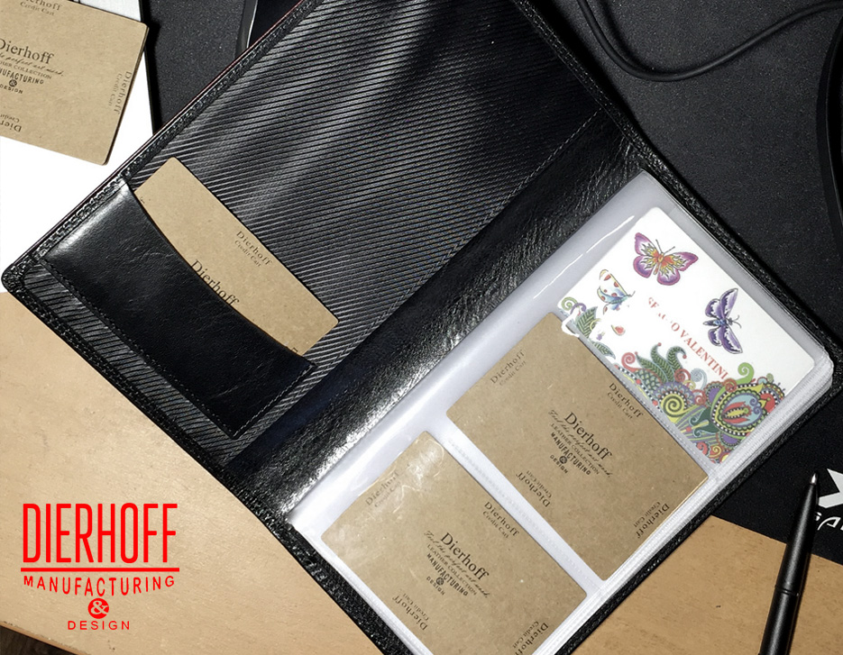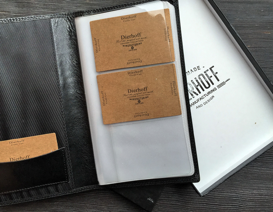 Размер: 12 х 20,5 х 1,5 см. Внутри обложки из натуральной кожи находятся прозрачные пластиковые файлы для шестидесяти визитных карточек.
