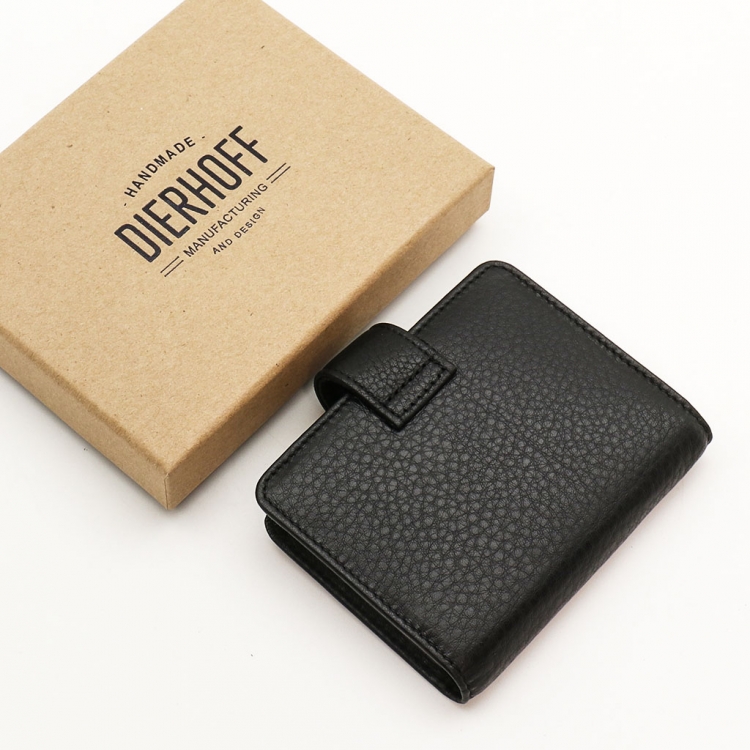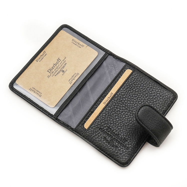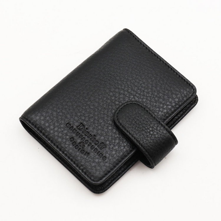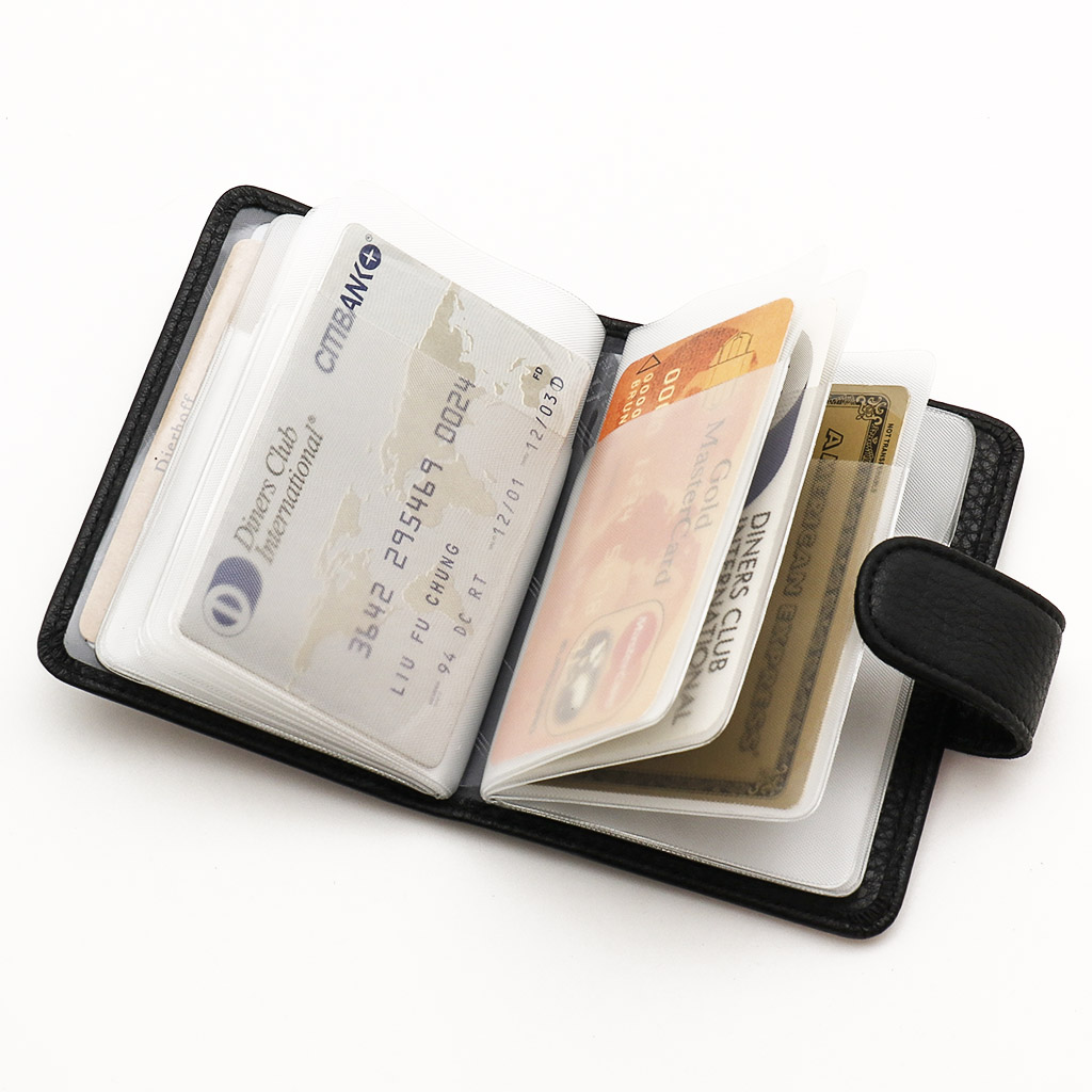 Размер: 7,5 х 10,5 х 1,5 см. Закрывается на хлястик с кнопкой. Внутри: удобные прозрачные пластиковые файлы на 28 карточек, текстильная подкладка и прозрачный захват на левой створке, кожаный захват и кармашек на правой створке.