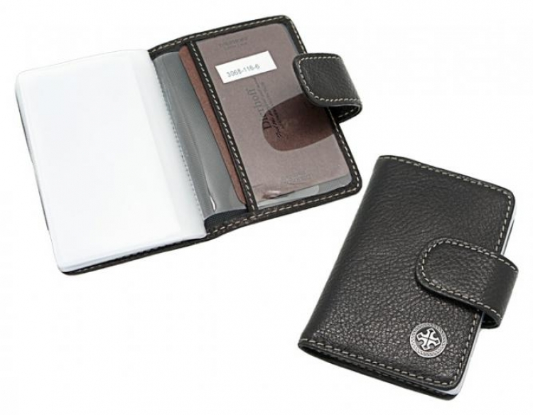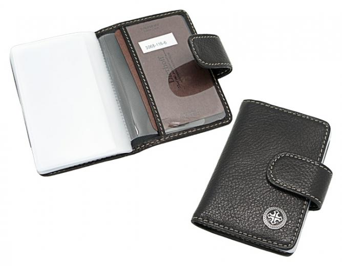 Размер: 7х10 см. Закрывается на хлястик с кнопкой. Внутри: 8 прозрачных пластиковых файлов для карточек, прозрачный захват на правой створке, кожаный захват на левой створке.