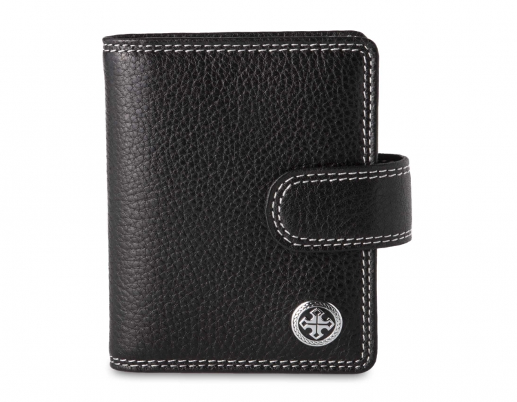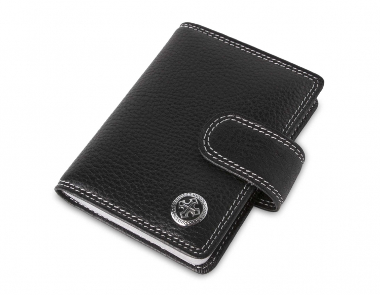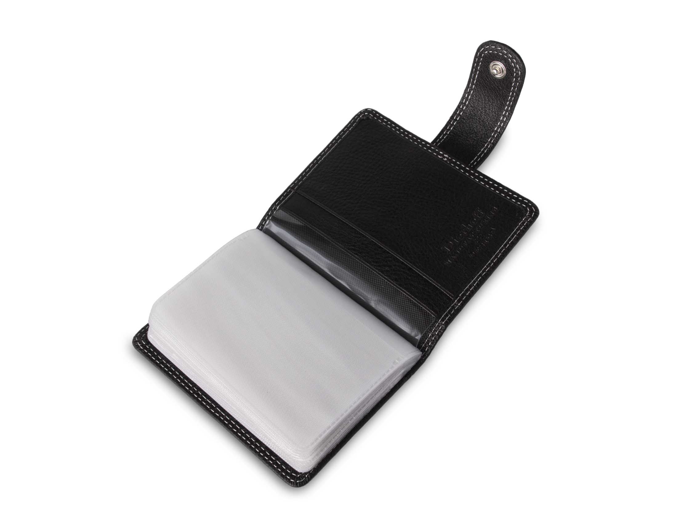 Размер: 8 х 10,5 см. Закрывается на хлястик с кнопкой. Внутри: 22 прозрачных пластиковых файла для карточек, текстильная подкладка и прозрачный захват на левой створке, кожаный захват и кармашек на правой створке.