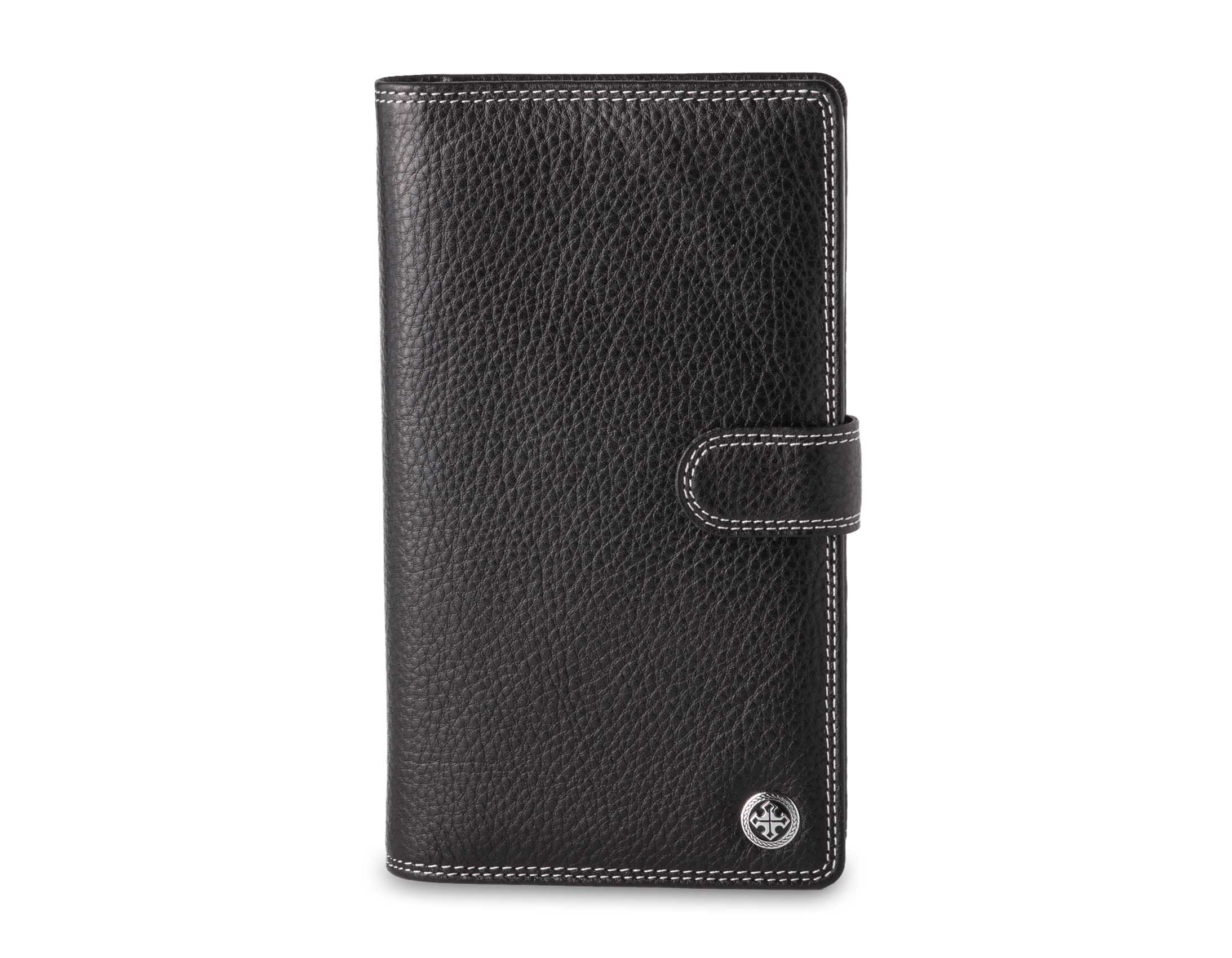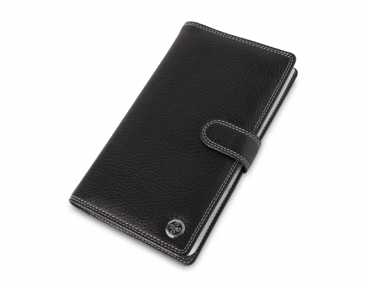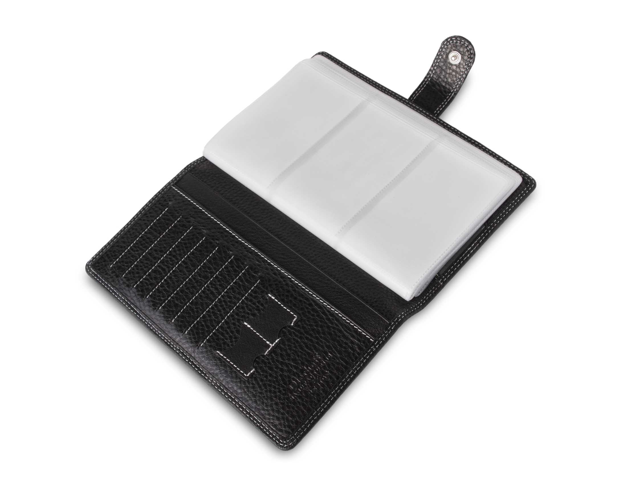 Размер 11 х 19 см. Альбом с 60 прозрачными кармашками для визитных карточек. Закрывается на хлястик с кнопкой. На внутренней стороне левой створки два больших продольных кармана, восемь кармашков для карточек и два для СИМ-карт. На правой створке- прозрачный карман.