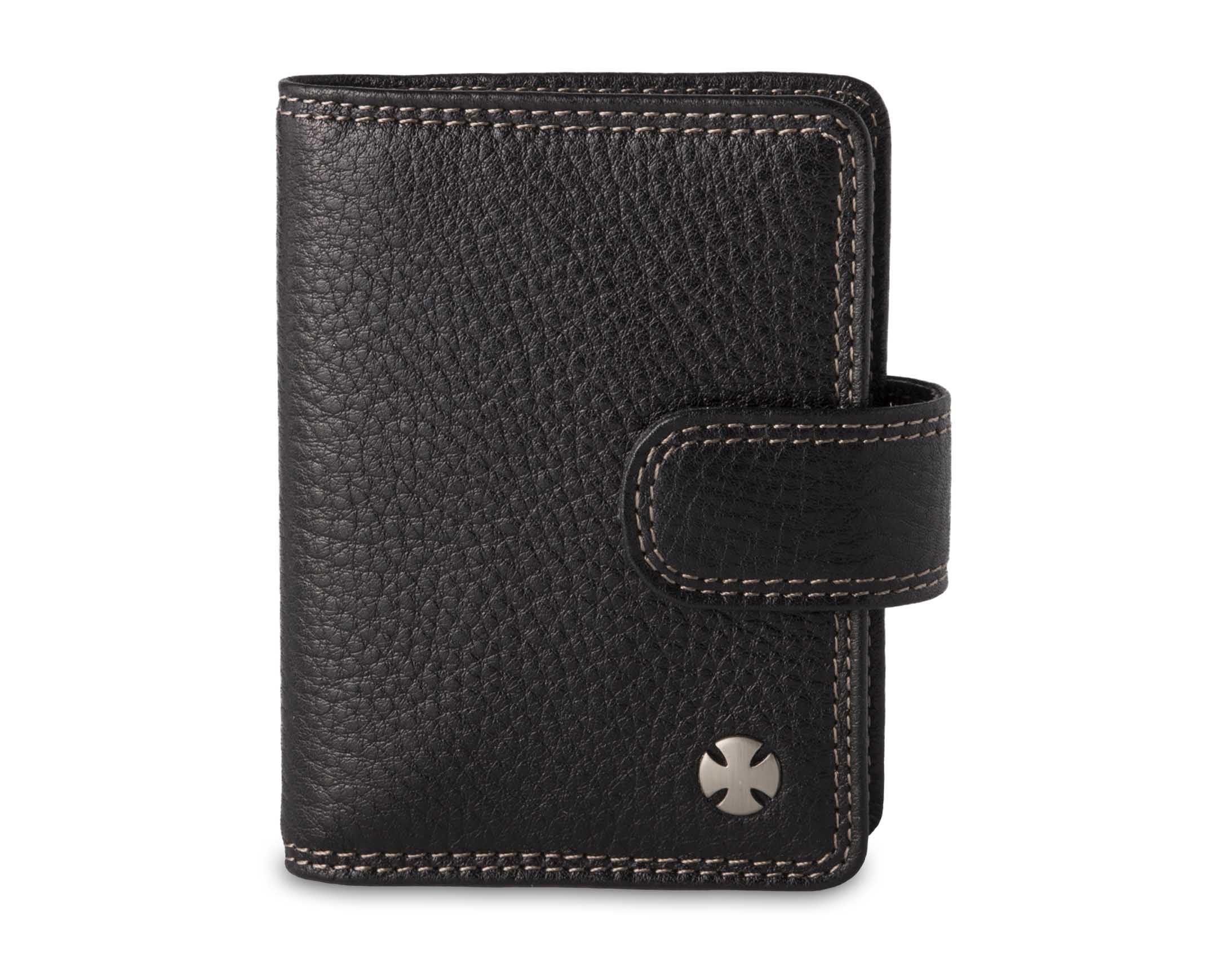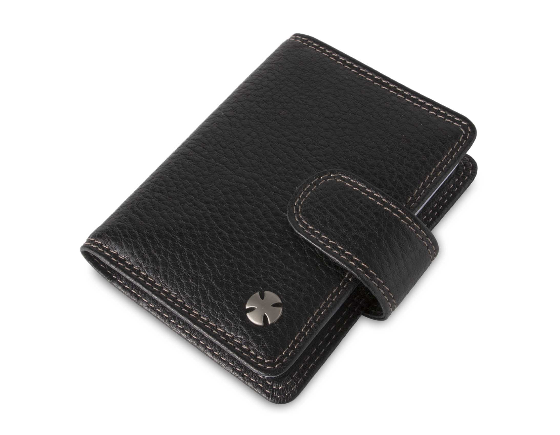 Размер: 8 х 10,5 см. Закрывается на хлястик с кнопкой. Внутри: 22 прозрачных пластиковых файла для карточек, текстильная подкладка и прозрачный захват на левой створке, кожаный захват и кармашек на правой створке.
