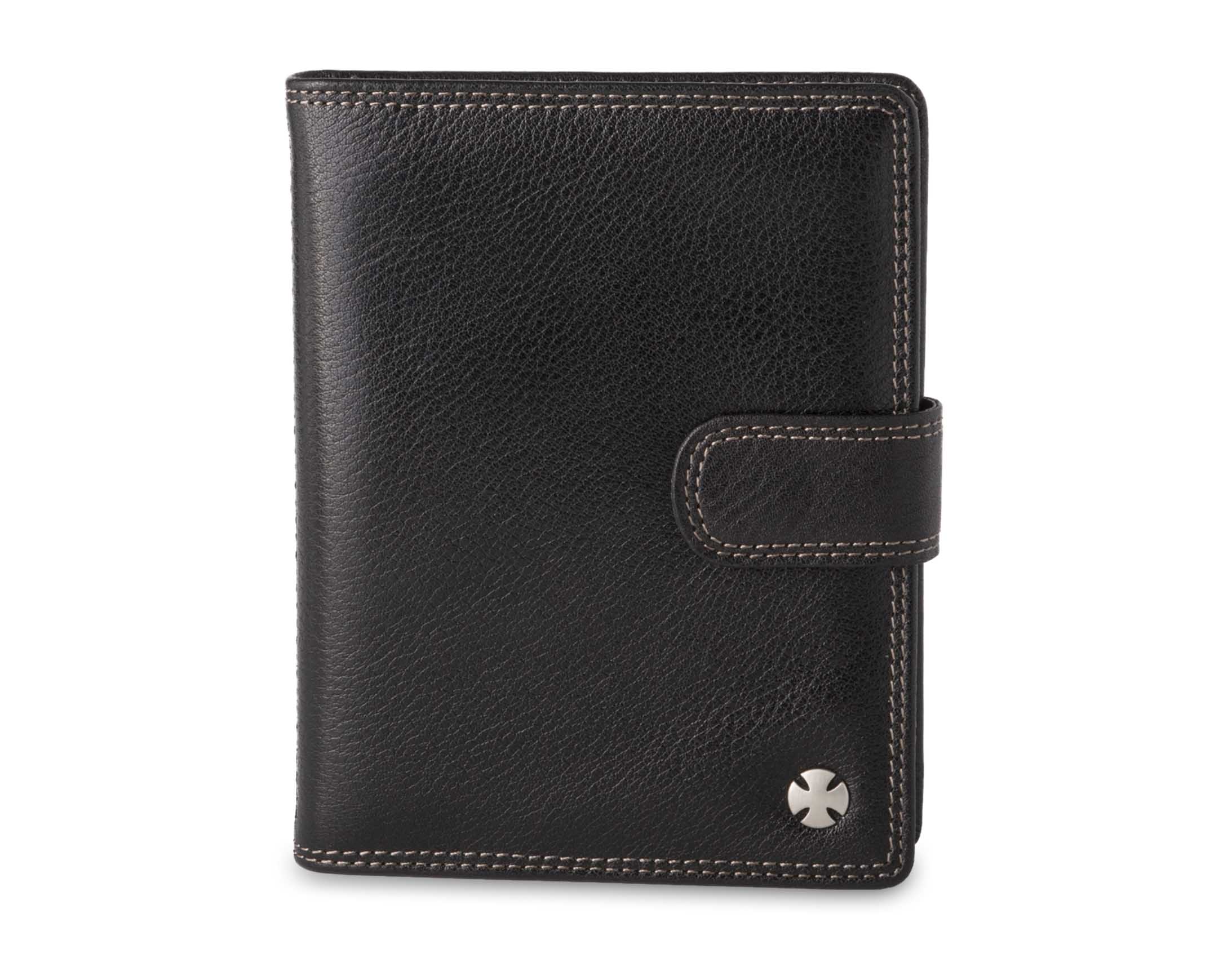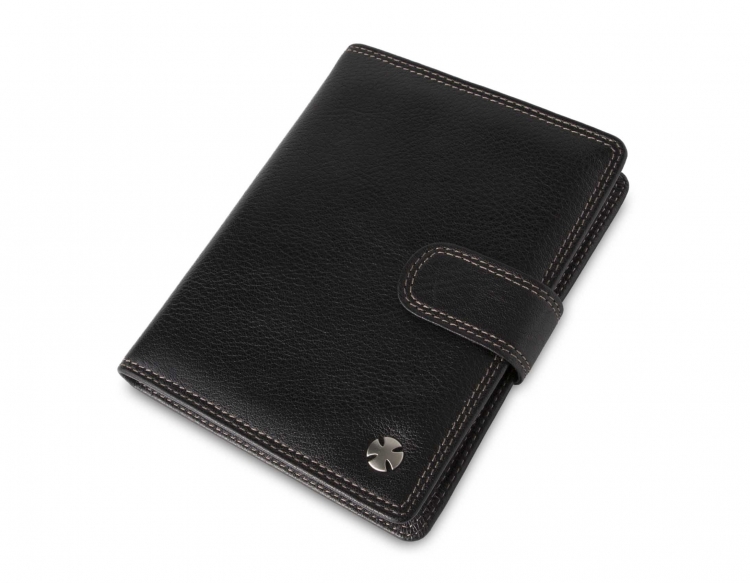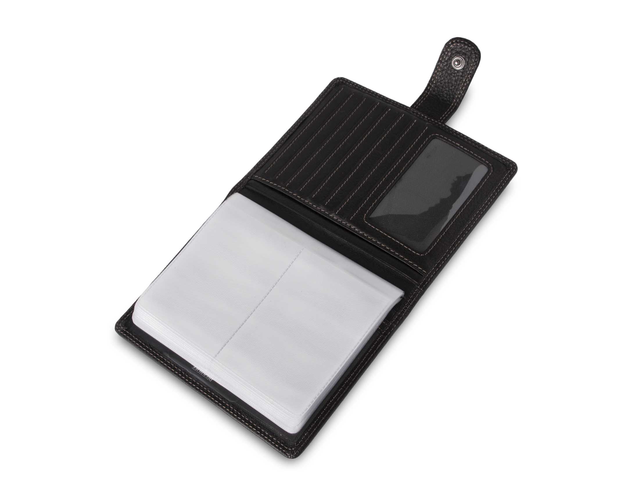 Размер 11 х 14 см. Альбом для визиток с шестнадцатью двойными файлами. Закрывается хлястиком с кнопкой. На внутренней стороне левой створки карман и прозрачное окошко. На правой створке два кармана, прозрачное окошко и семь кармашков для карточек.