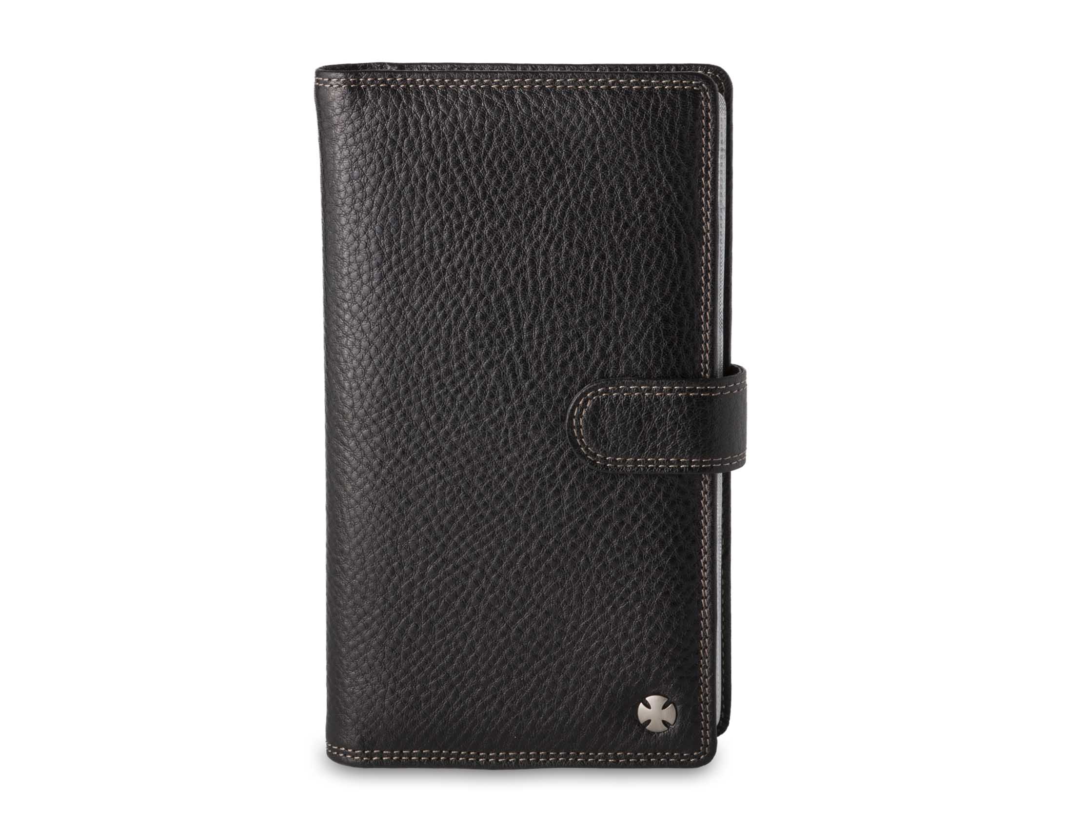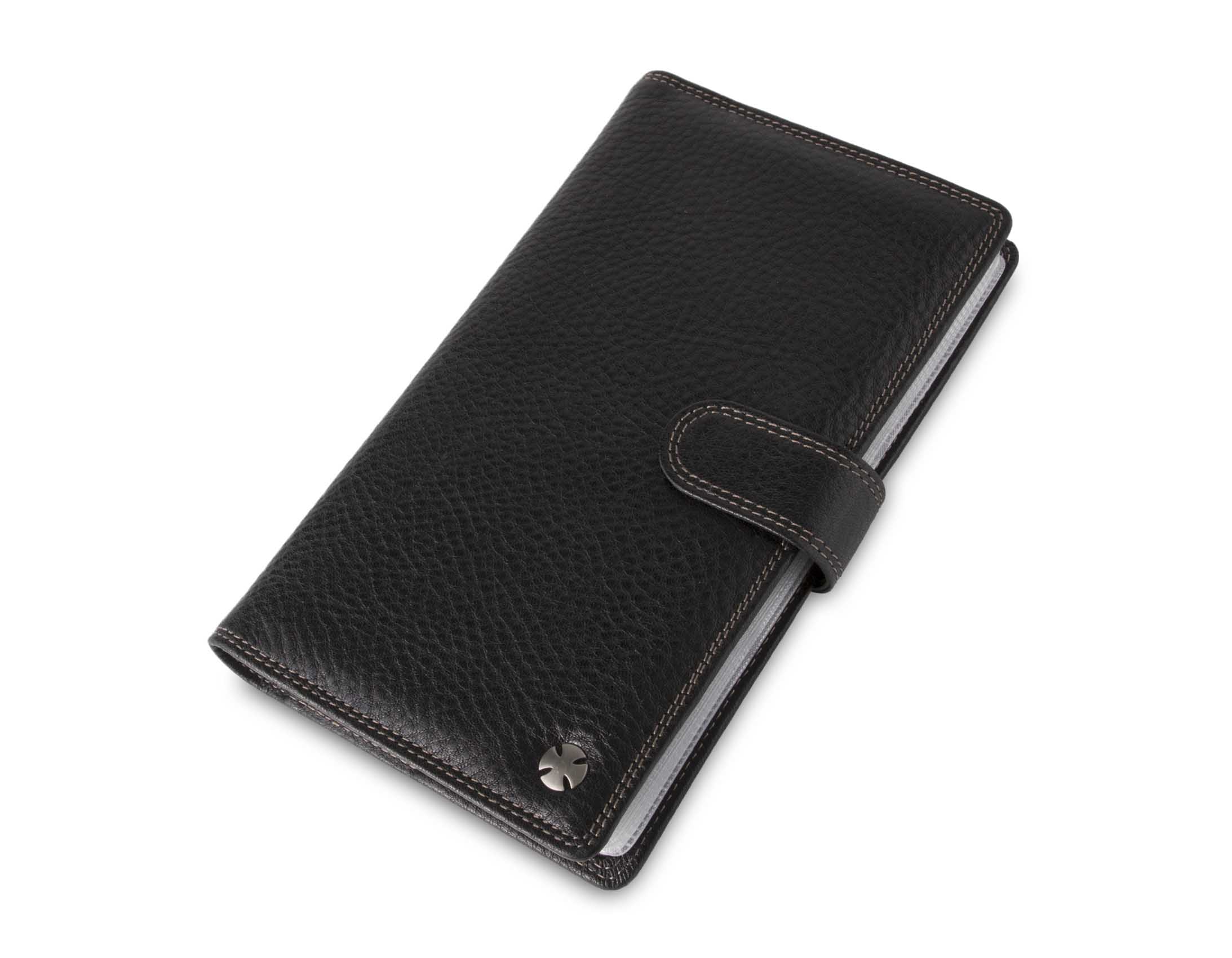Размер 11 х 19 см. Альбом с 60 прозрачными кармашками для визитных карточек. Закрывается на хлястик с кнопкой. На внутренней стороне левой створки два больших продольных кармана, восемь кармашков для карточек и два для СИМ-карт. На правой створке- прозрачный карман.