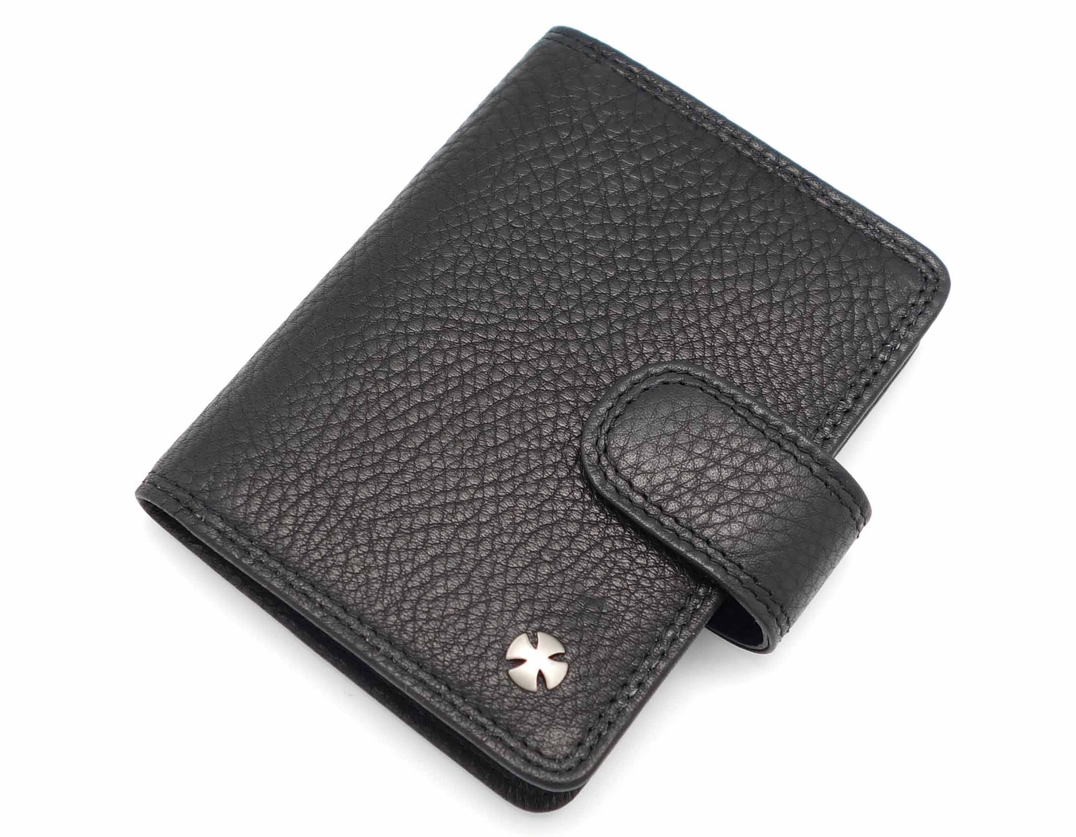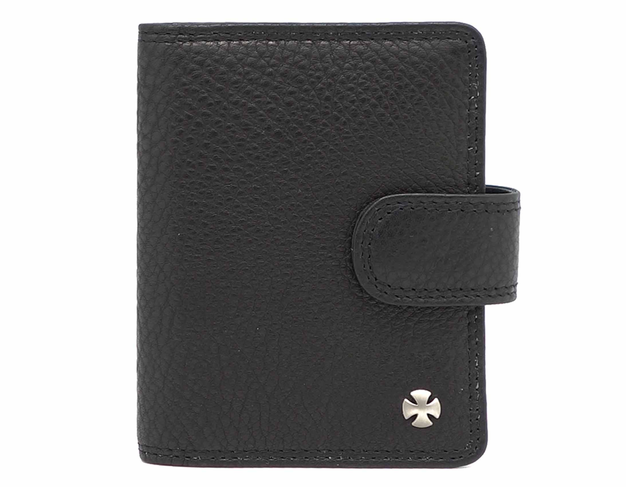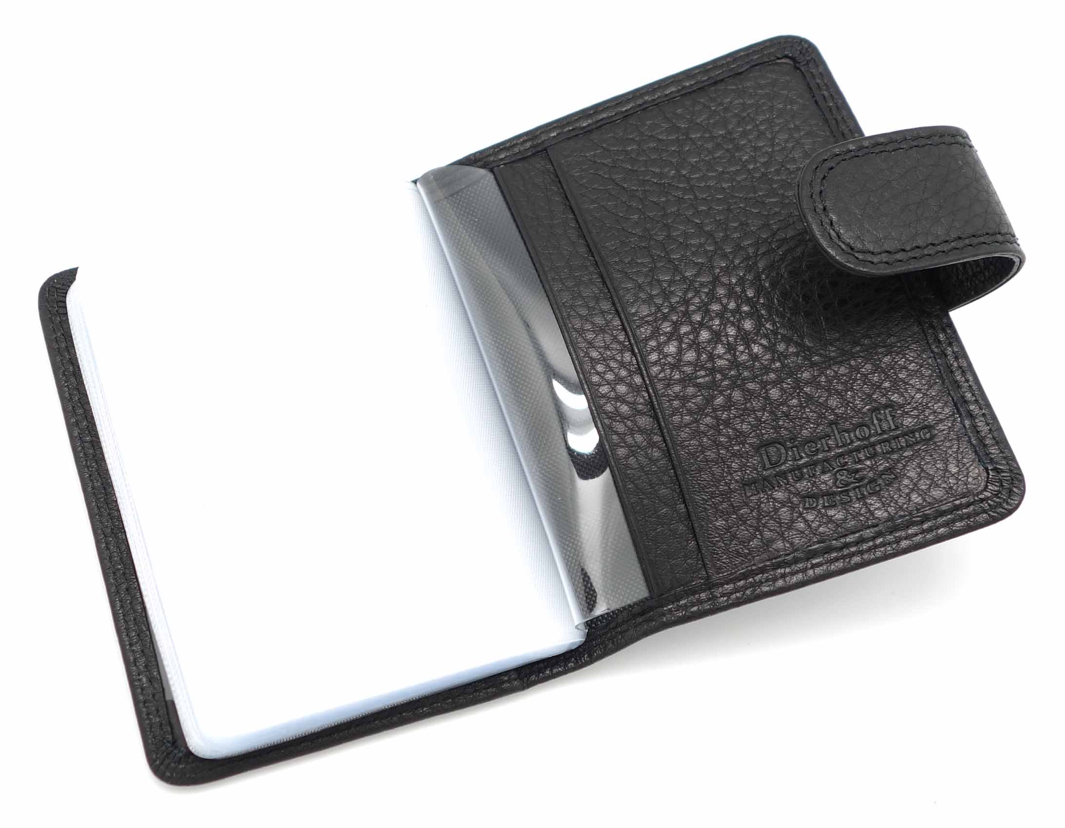 Размер: 8 х 10,5 см. Закрывается на хлястик с кнопкой. Внутри: 22 прозрачных пластиковых файла для карточек, текстильная подкладка и прозрачный захват на левой створке, кожаный захват и кармашек на правой створке.