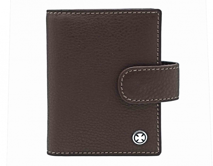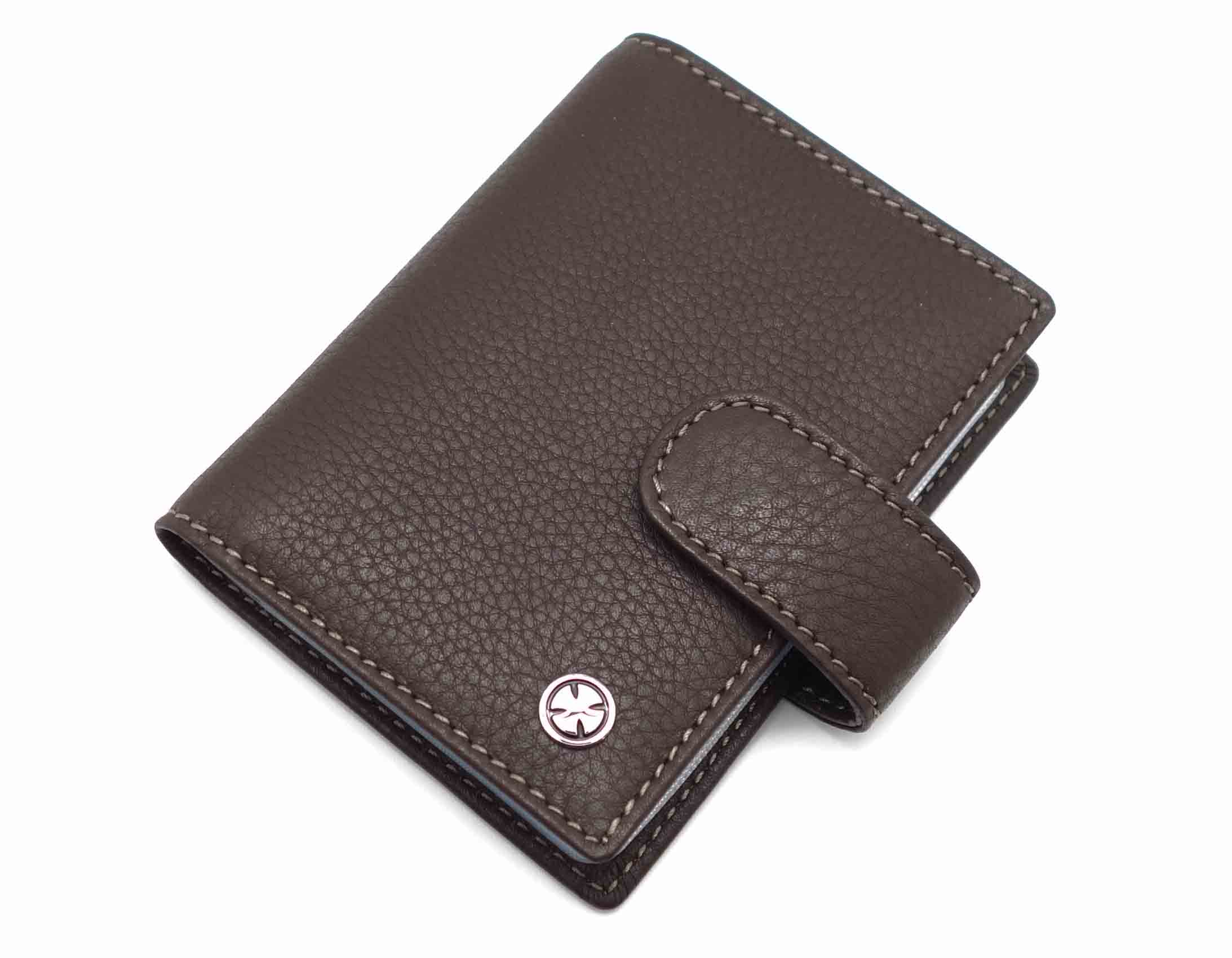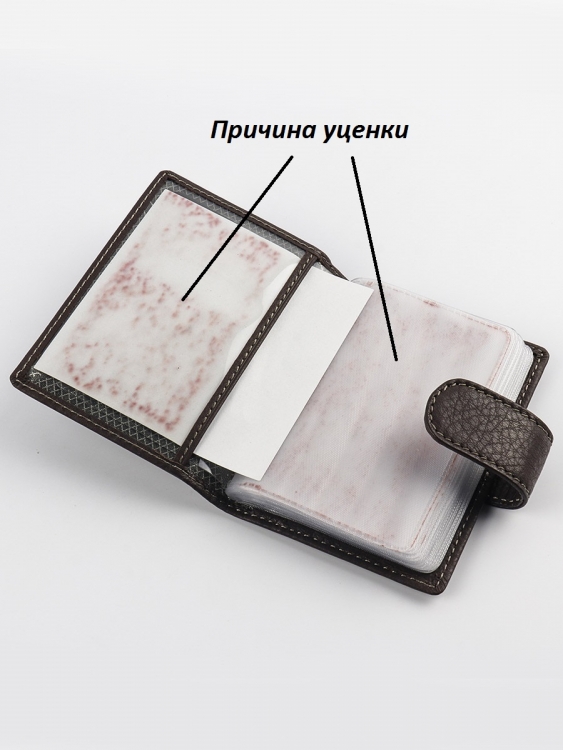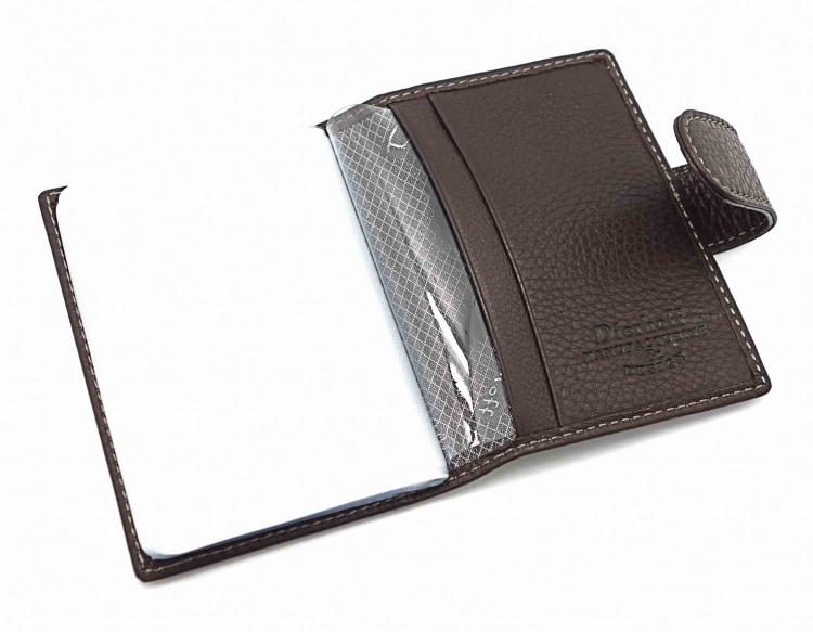 Размер: 8 х 10,5 см. Закрывается на хлястик с кнопкой. Внутри: 24 прозрачных пластиковых файла для карточек, текстильная подкладка и прозрачный захват на левой створке, кожаный захват и кармашек на правой створке.