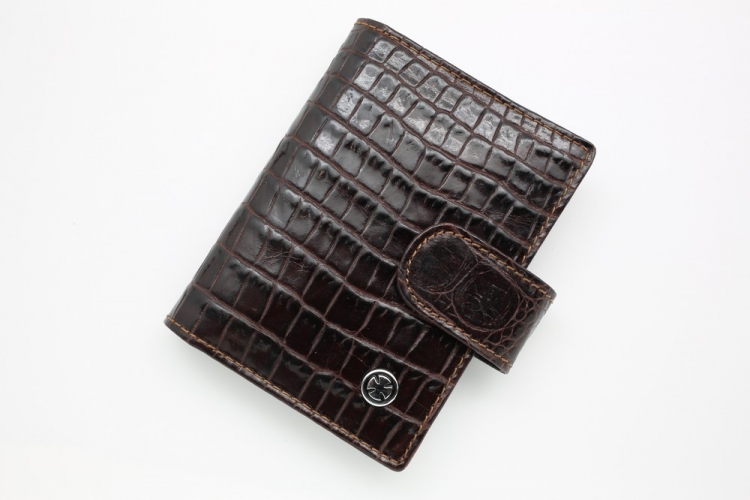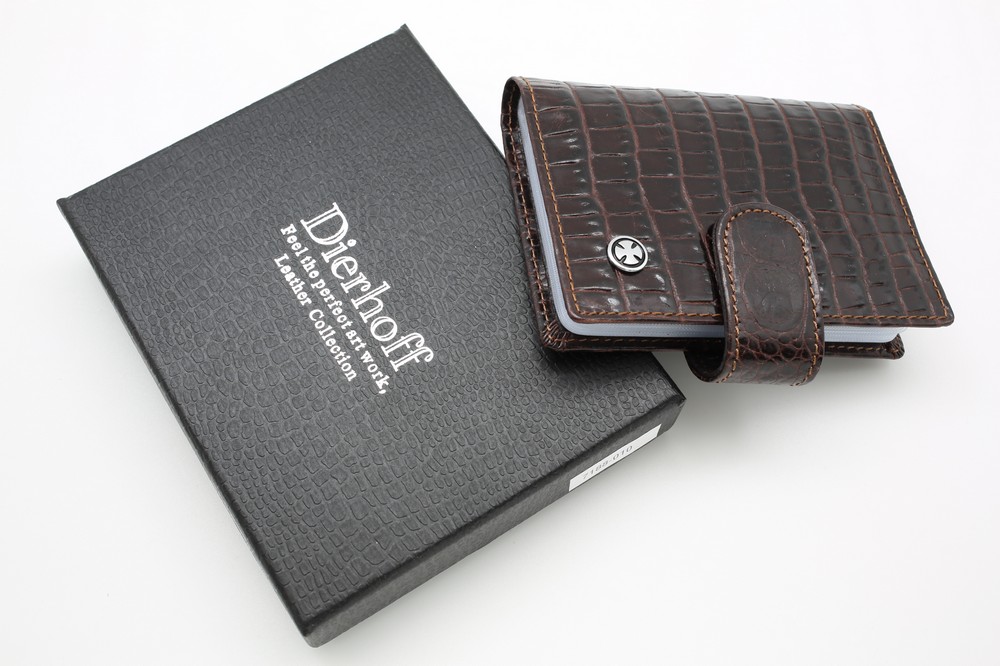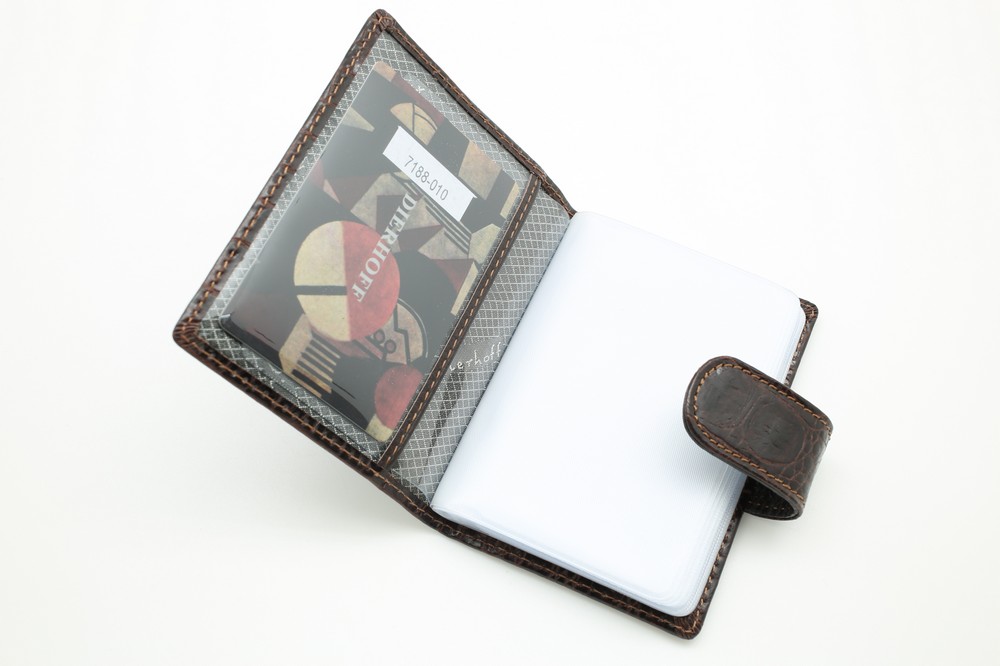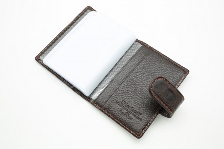 Размер: 8 х 10,5 см. Закрывается на хлястик с кнопкой. Внутри: 22 прозрачных пластиковых файла для карточек, текстильная подкладка и прозрачный захват на левой створке, кожаный захват и кармашек на правой створке.