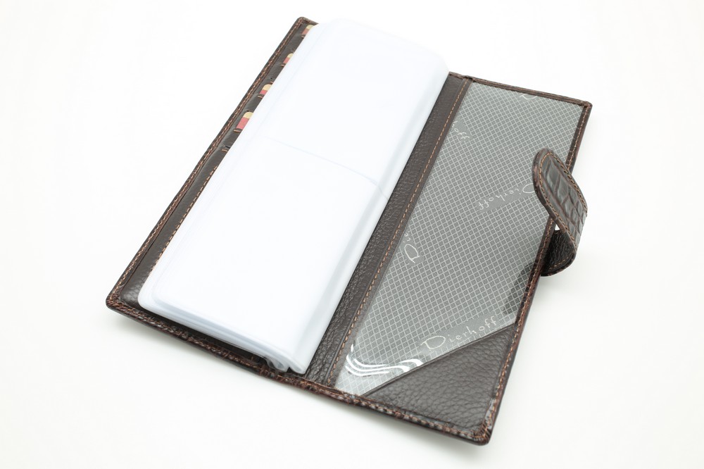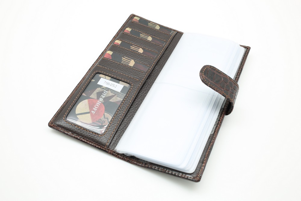 Размер 8 х 20 см. Альбом с прозрачными файлами на 40 визитных карточек. Закрывается на хлястик с кнопкой. На внутренней стороне левой створки продольный карман, семь кармашков для карточек и прозрачное окошко для фотографии. На правой створке- прозрачный карман.
