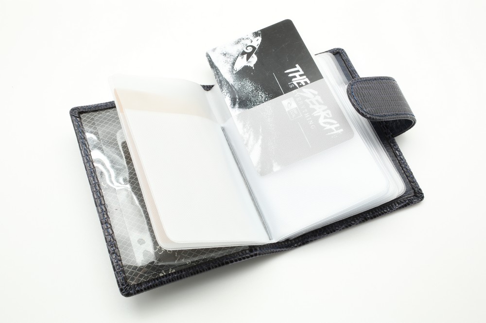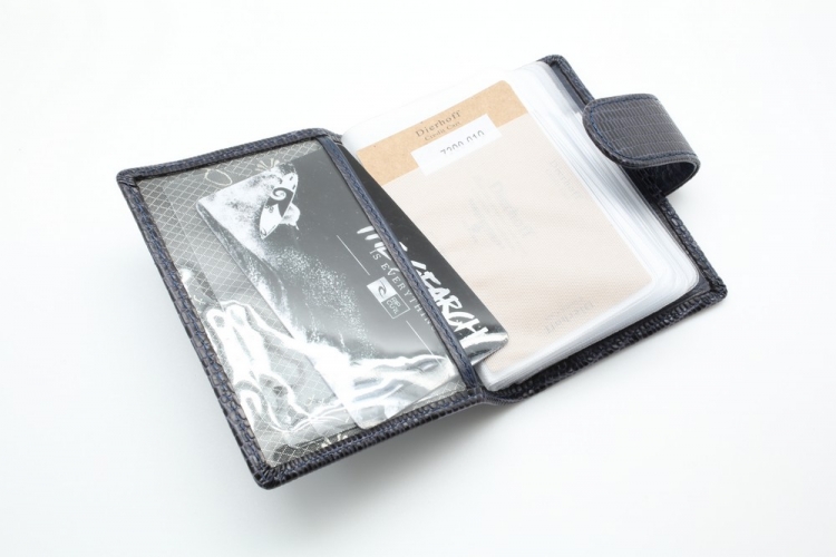 Размер: 8 х 10,5 см. Закрывается на хлястик с кнопкой. Внутри: удобные прозрачные пластиковые файлы на 28 карточек, текстильная подкладка и прозрачный захват на левой створке, кожаный захват и кармашек на правой створке.