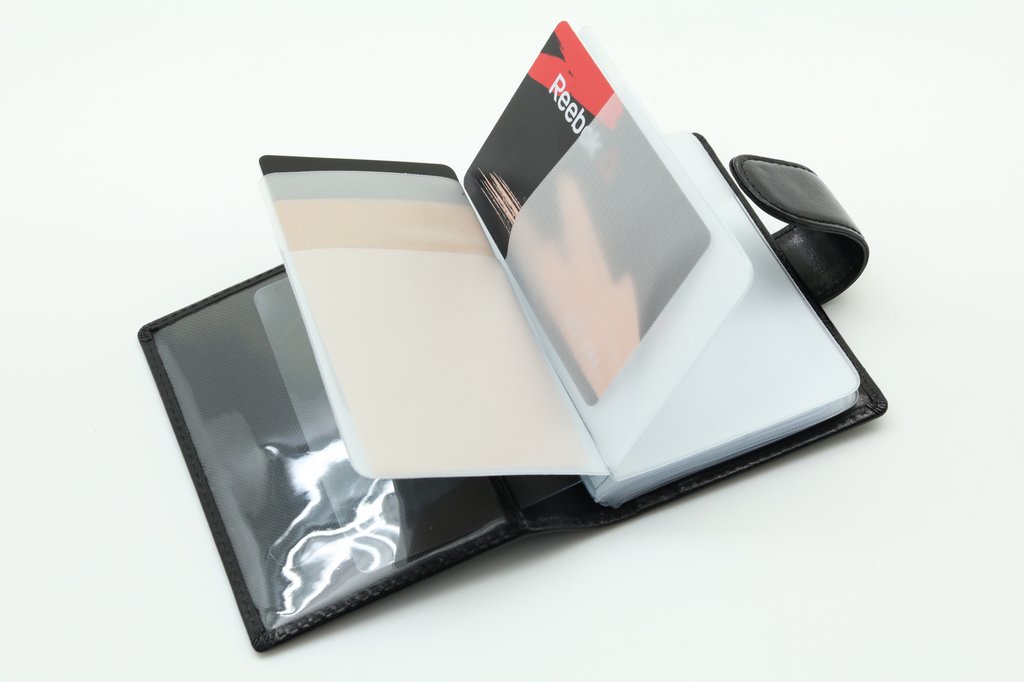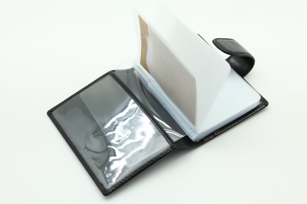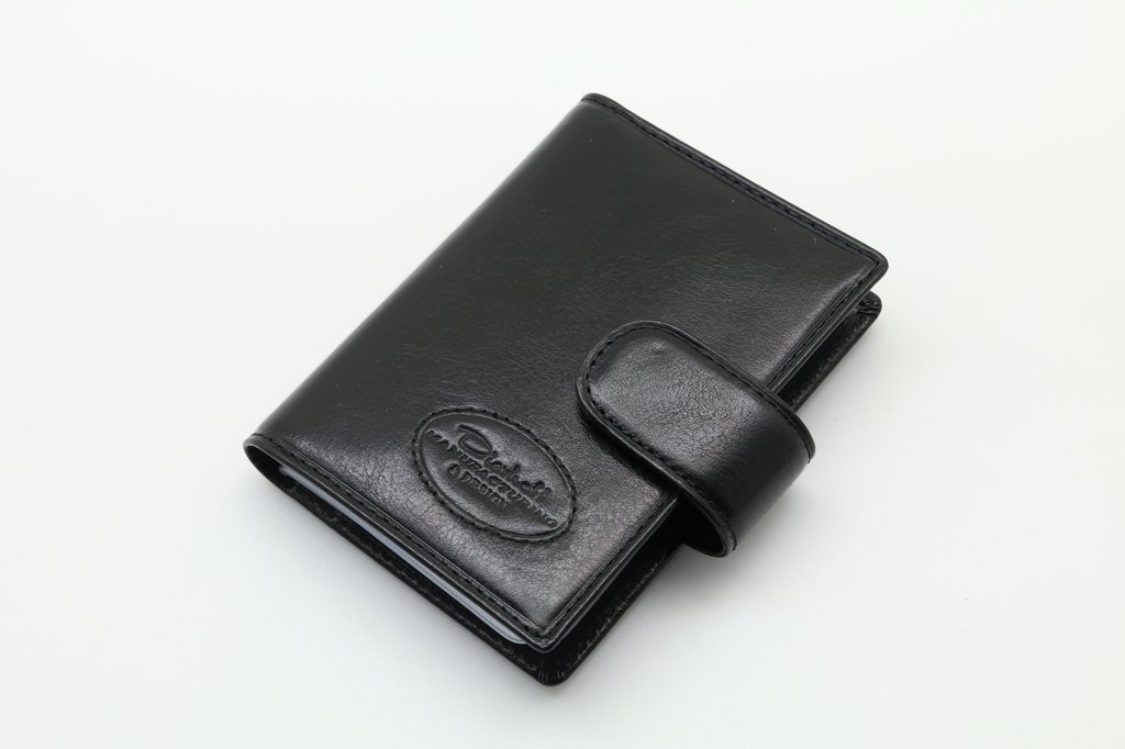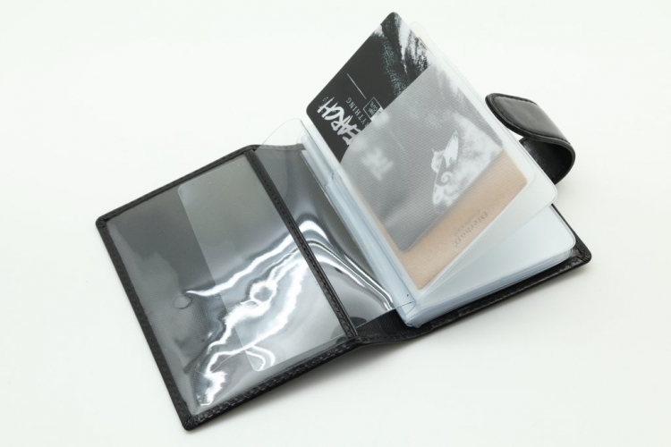 Размер: 8 х 10,5 см. Закрывается на хлястик с кнопкой. Внутри: удобные прозрачные пластиковые файлы на 28 карточек, текстильная подкладка и прозрачный захват на левой створке, кожаный захват и кармашек на правой створке.