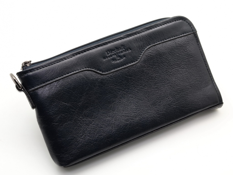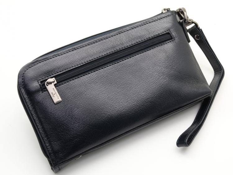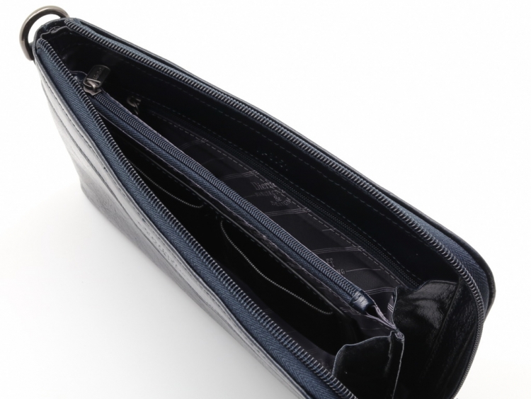 Изготовлено из натуральной кожи тёмно- синего цвета. Размер 23 х 13 х 2,5 см. Мужской бизнес-клатч выполнен из натуральной кожи. Закрывается на молнию. Внутри: три открытых отделения, два отделения на молнии, два кармана для телефонов, шесть кармашков для карточек.. Снаружи, на оборотной стороне, карман на молнии. К сумке пристёгивается кожаный ремешок.