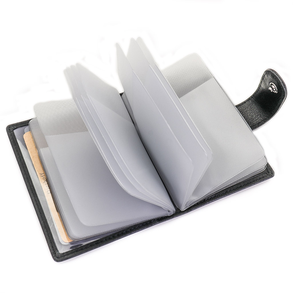 Размер: 7,5 х 10,5 см. Закрывается на хлястик с кнопкой. Внутри: удобные прозрачные пластиковые файлы на 28 карточек, текстильная подкладка и прозрачный захват на левой створке, кожаный захват и кармашек на правой створке.