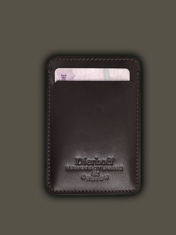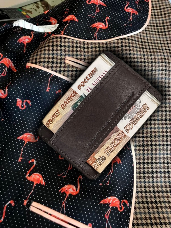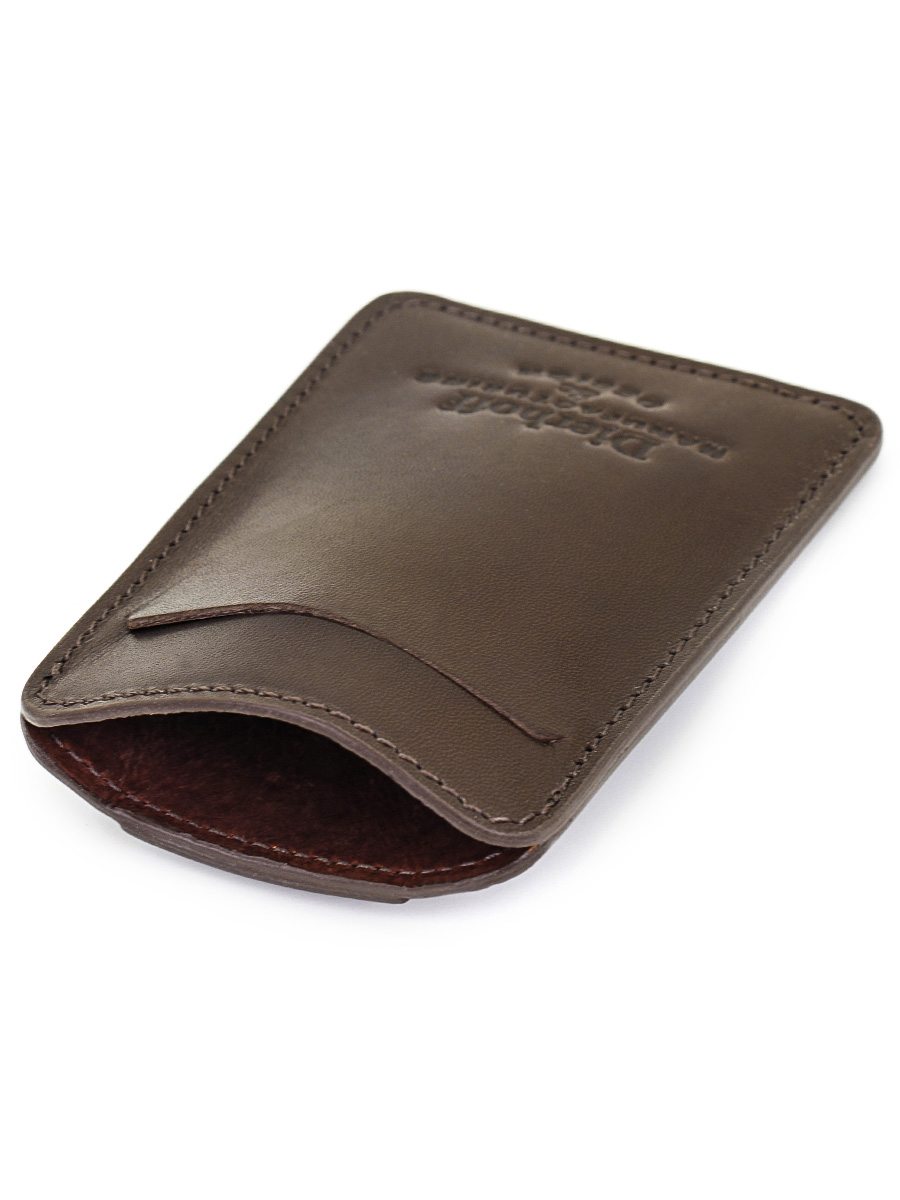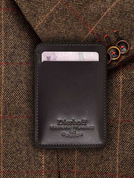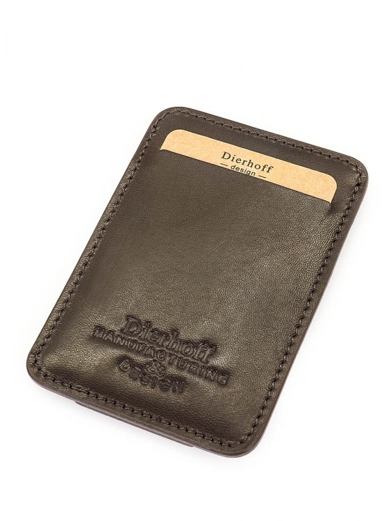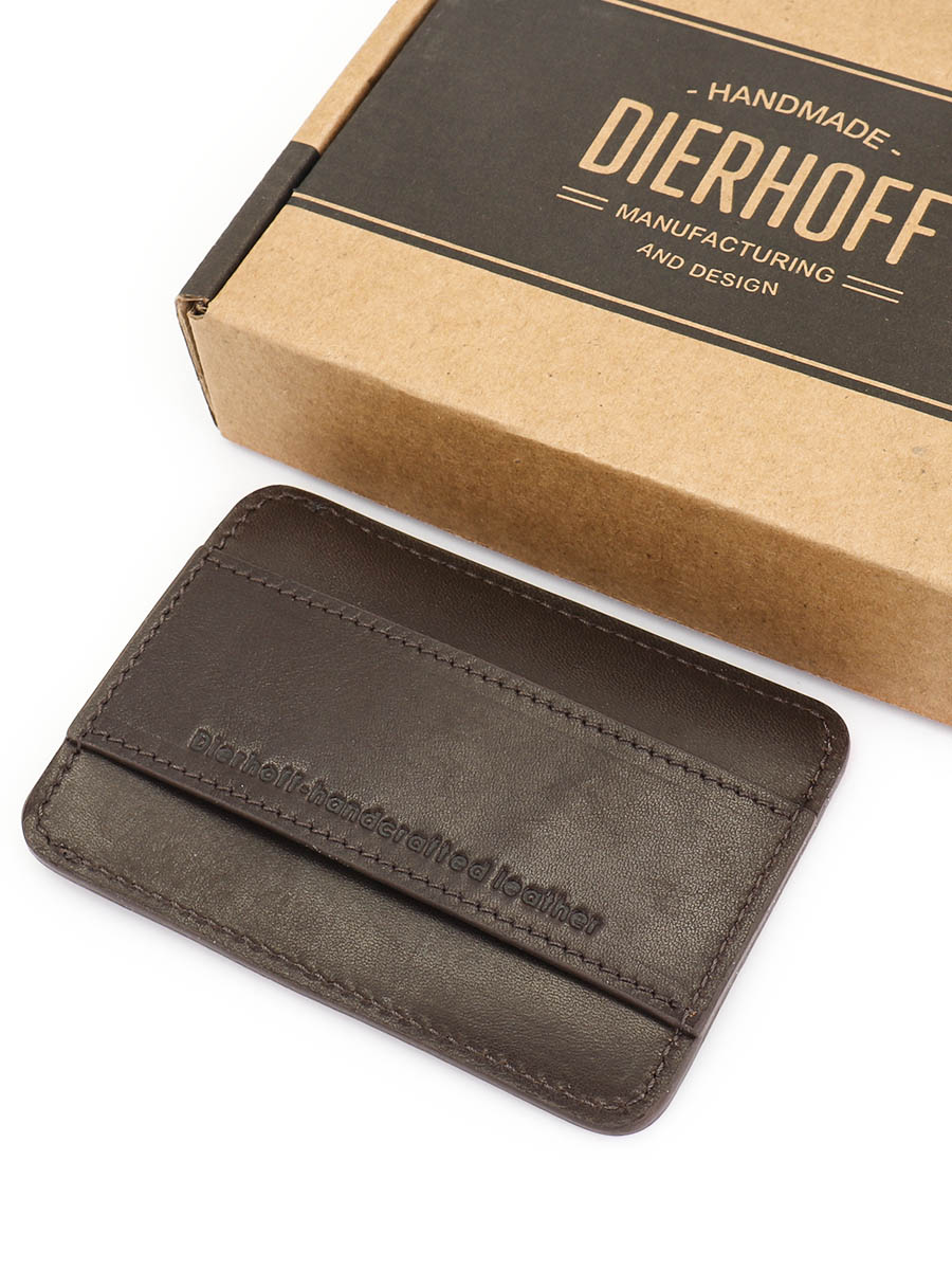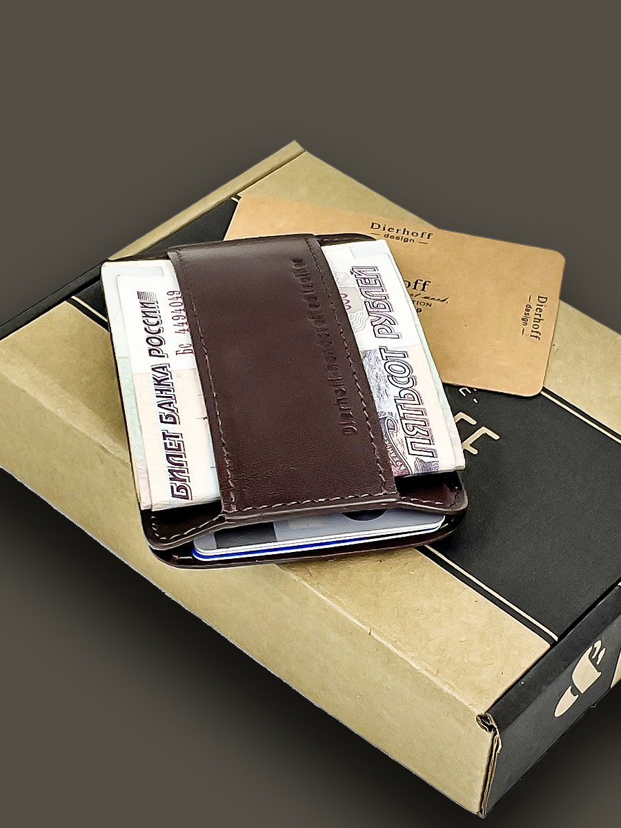 Размер 10 х 7 см. Оригинальное изделие для хранения купюр, визитных, банковских и проксимити карт. Изготовлено с использованием значительной доли ручного труда. Высококачественная кожа держит форму без картона или пластика, неприхотлива, надёжна. Упаковано в подарочную коробку Dierhoff.