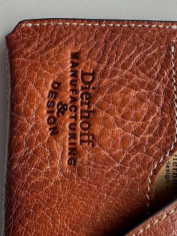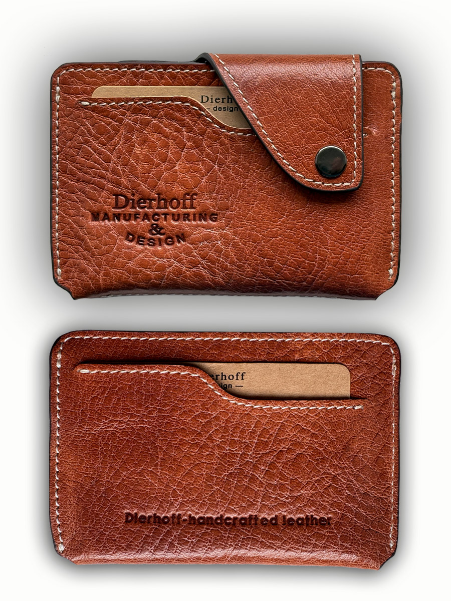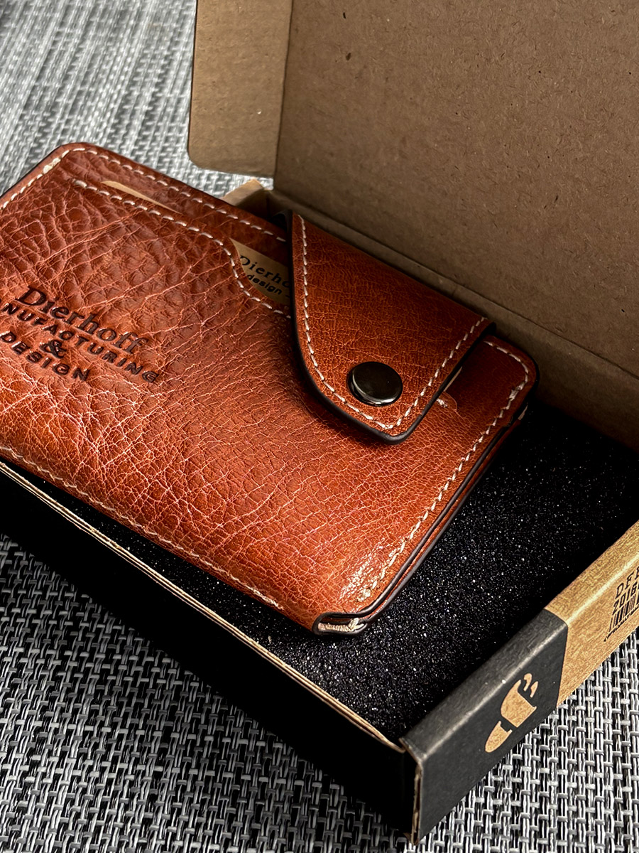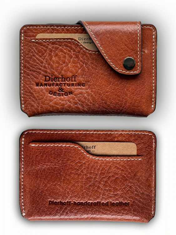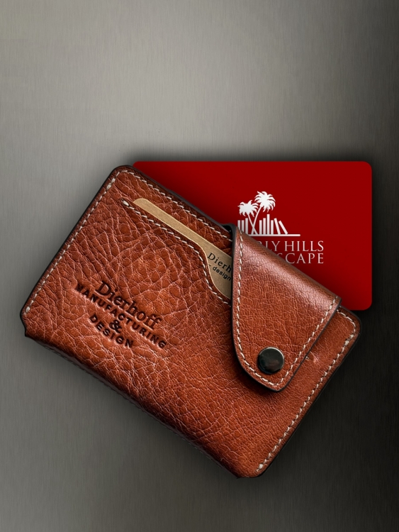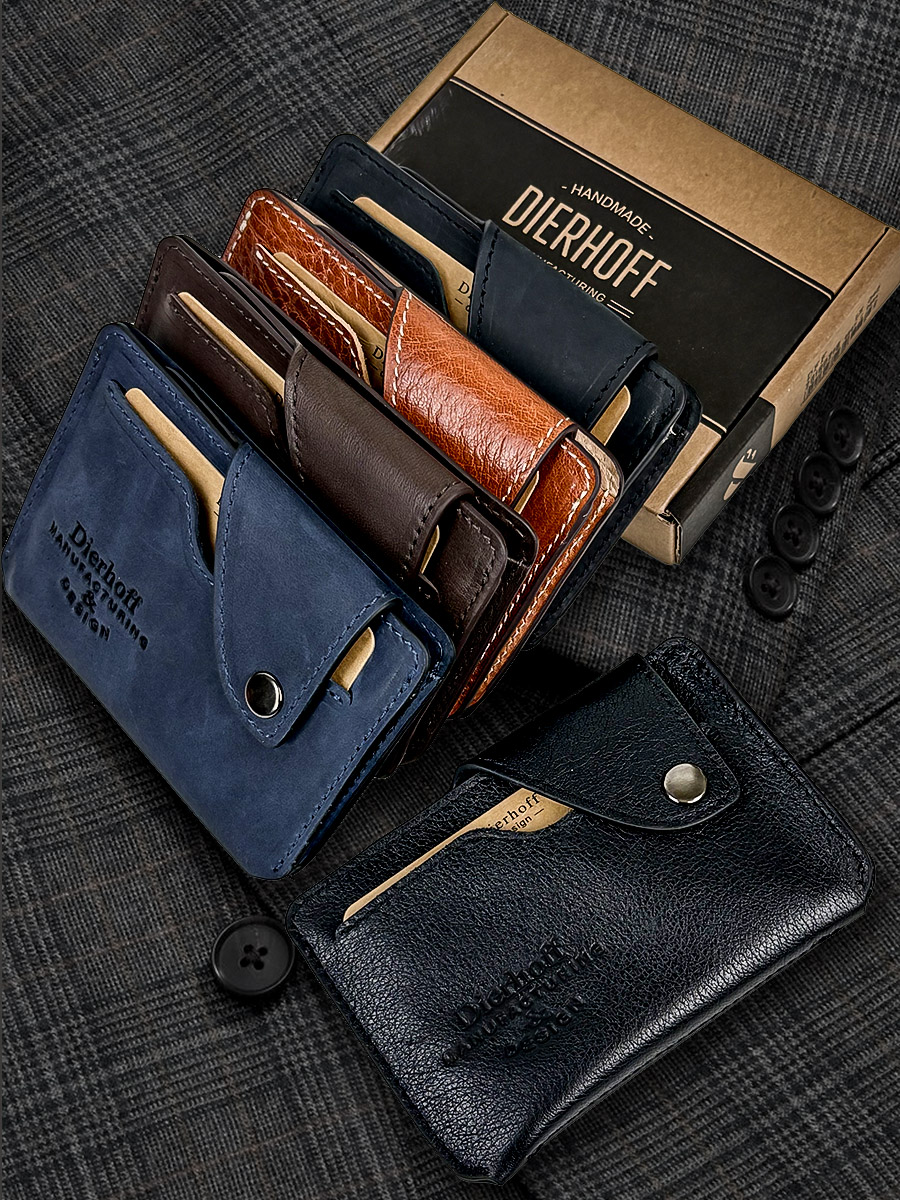 Размер 11х7,5х2 см. Оригинальное изделие для хранения, пропусков, купюр, визитных, банковских и проксимити карт. Имеет три кармана- передий закрывается на хлястик с кнопкой, центальный и задний- открытые.Изготовлено с использованием значительной доли ручного труда из высококачественной кожи итальянского производства, которая держит форму без картона или пластика, неприхотлива, надёжна. Упаковано в подарочную коробку Dierhoff.