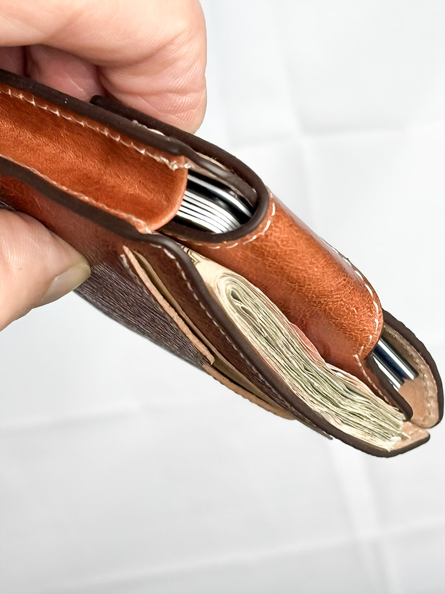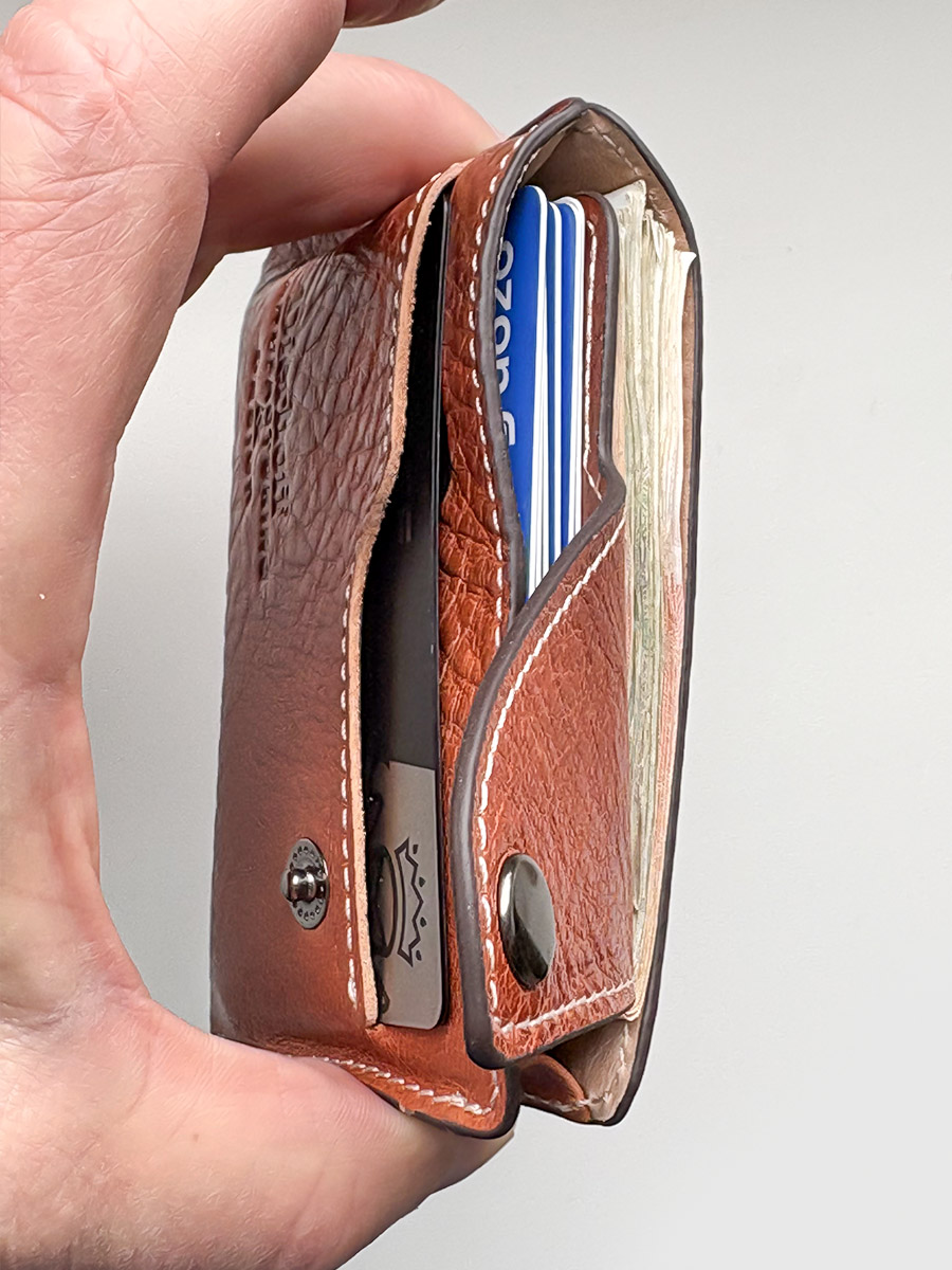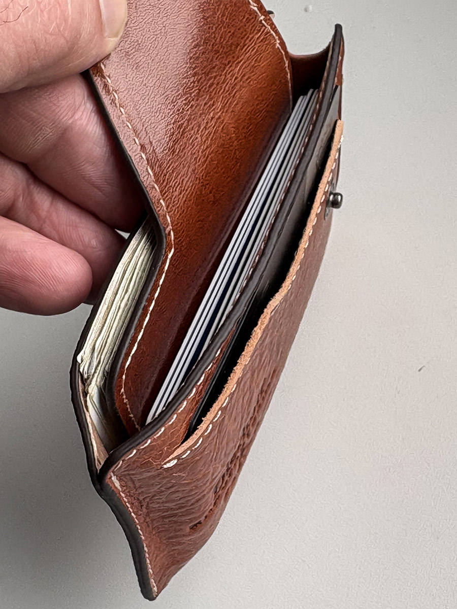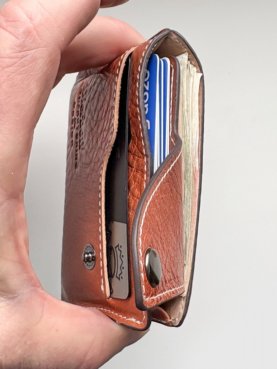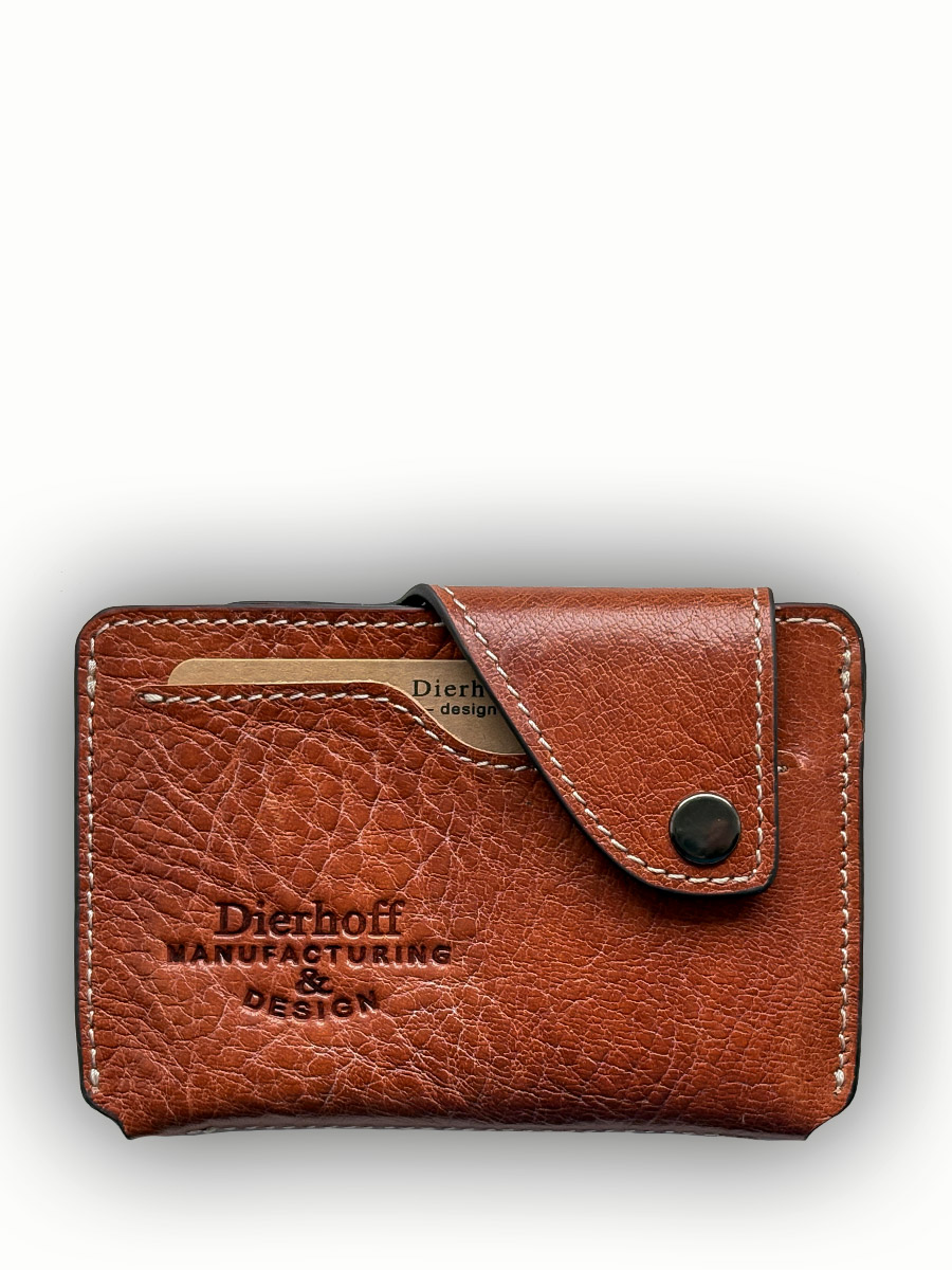 Размер 11х7,5х2 см. Оригинальное изделие для хранения, пропусков, купюр, визитных, банковских и проксимити карт. Имеет три кармана- передий закрывается на хлястик с кнопкой, центальный и задний- открытые.Изготовлено с использованием значительной доли ручного труда из высококачественной кожи итальянского производства, которая держит форму без картона или пластика, неприхотлива, надёжна. Упаковано в подарочную коробку Dierhoff.