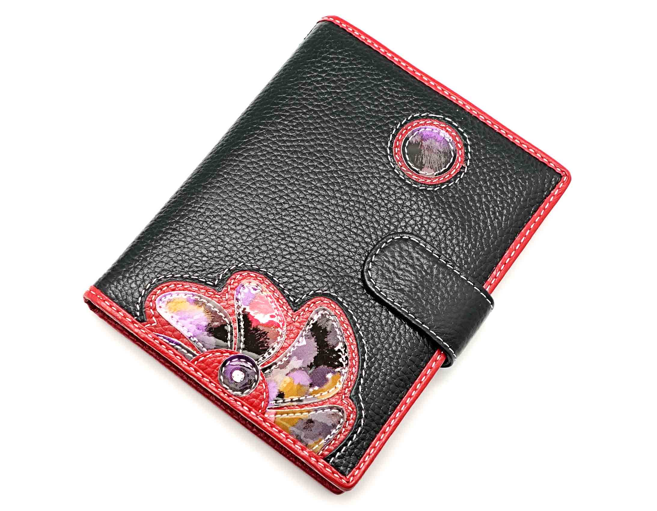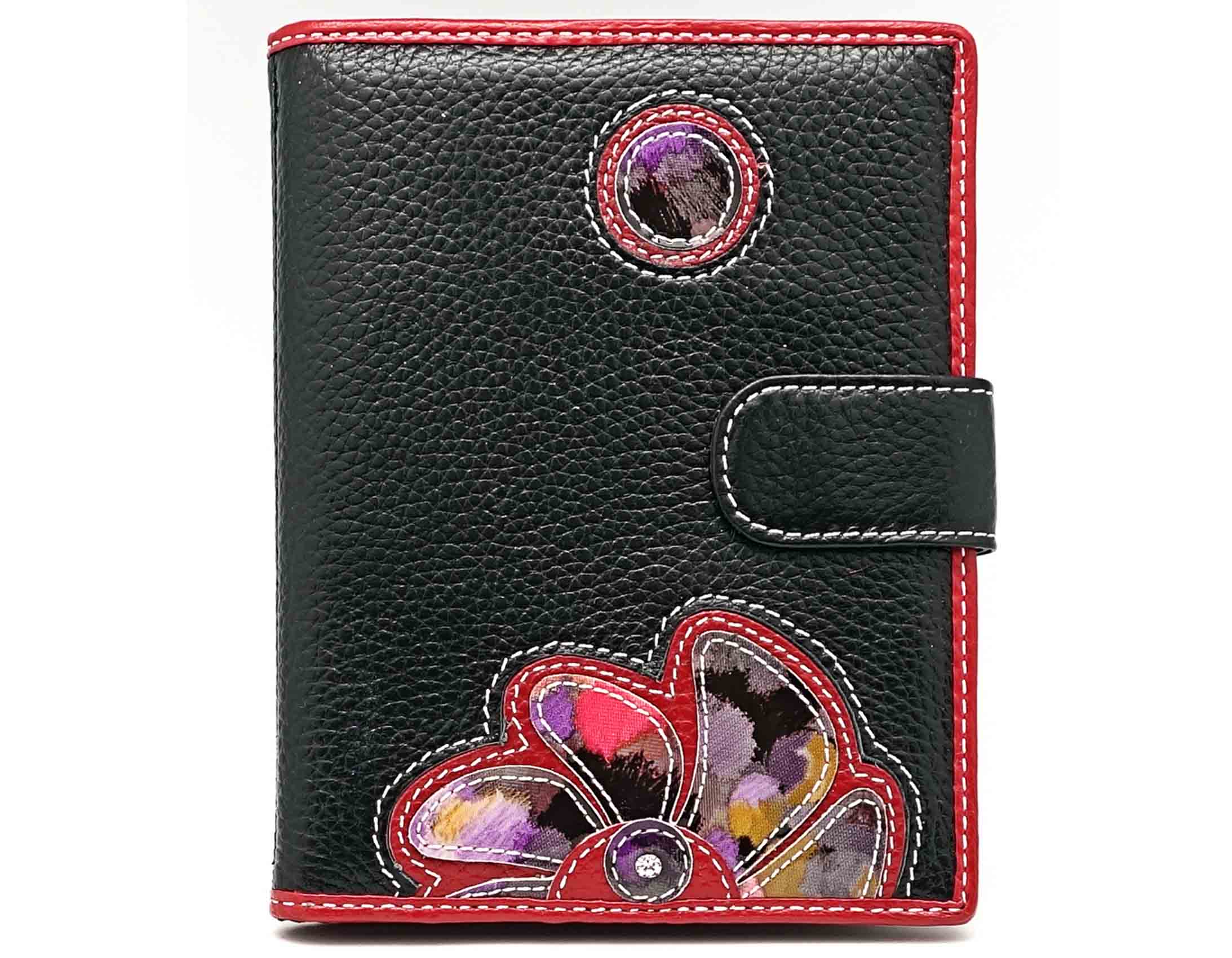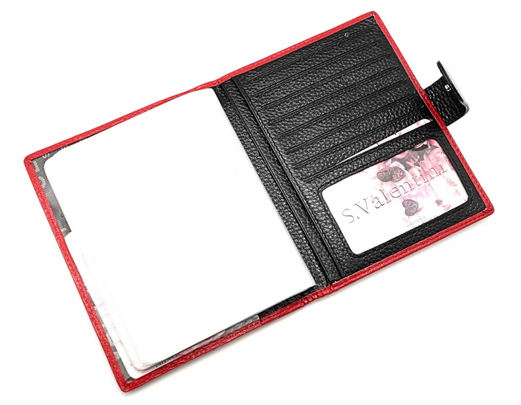 Размер 11 х 14 см. Альбом для визиток с шестнадцатью двойными файлами. На левой створке два кармана и прозрачное окошко. На правой створке два кармана, прозрачное окошко и семь кармашков для карточек. Закрывается на хлястик с кнопкой. Ограниченная серия аксессуаров, изготовленных из мягкой натуральной кожи и декорированных аппликацией. При производстве этого изделия использована значительная доля ручного труда.